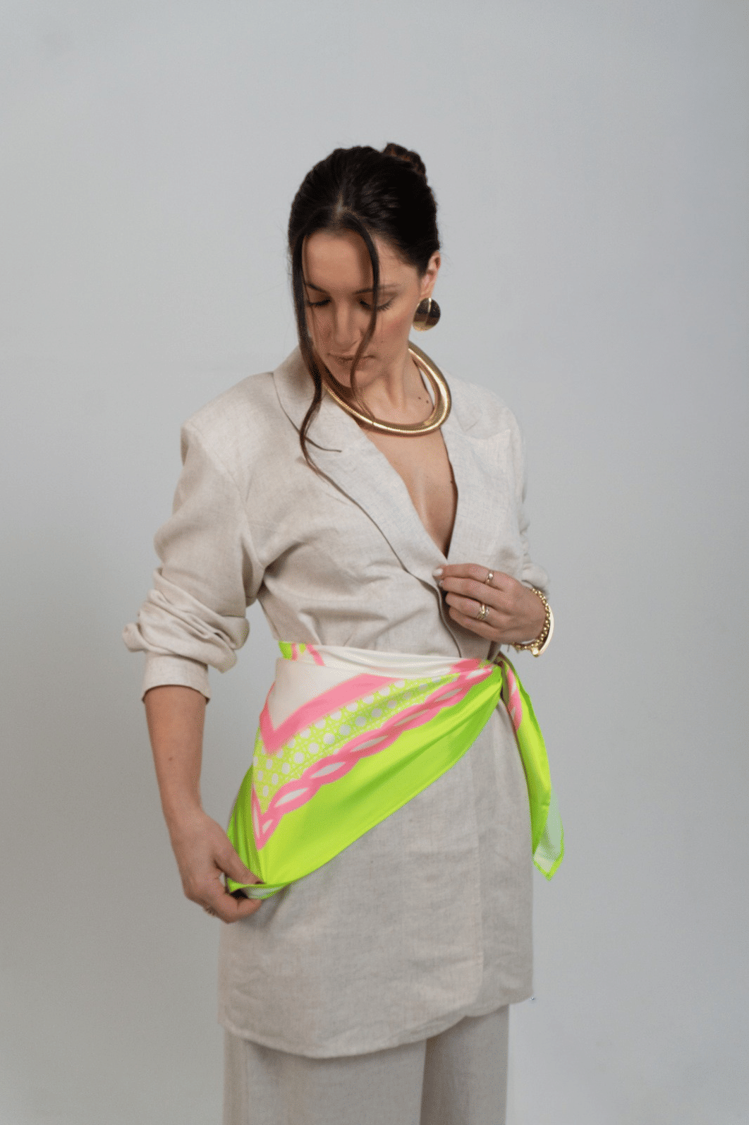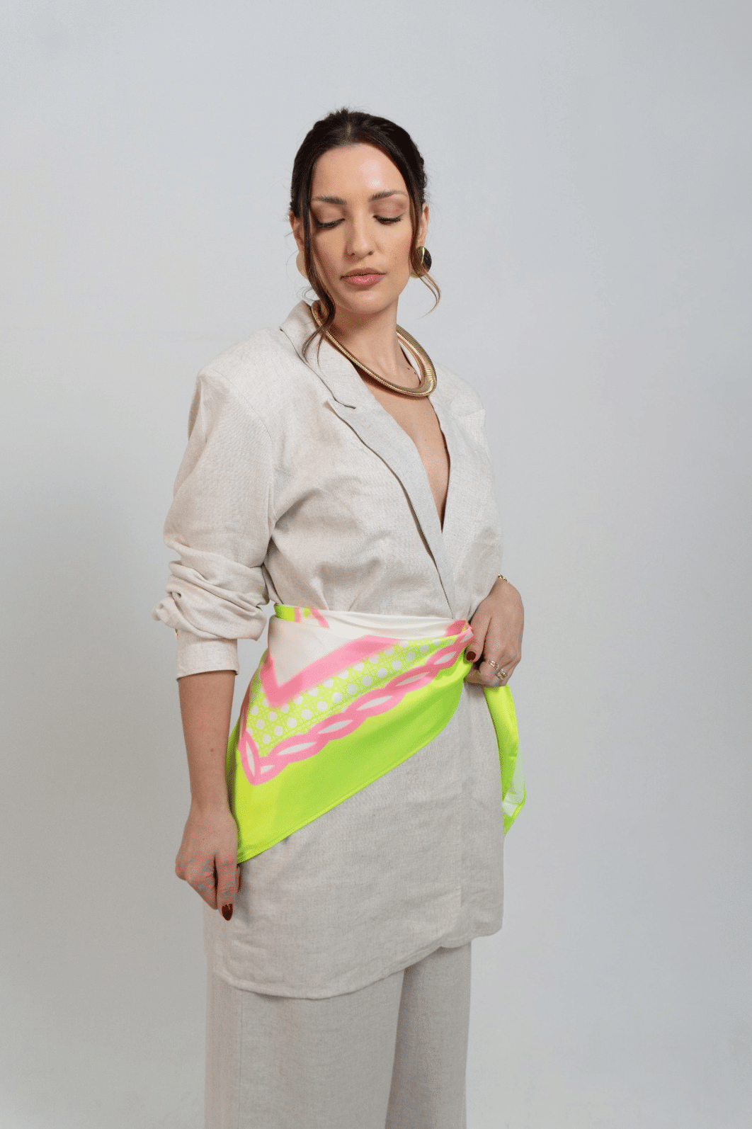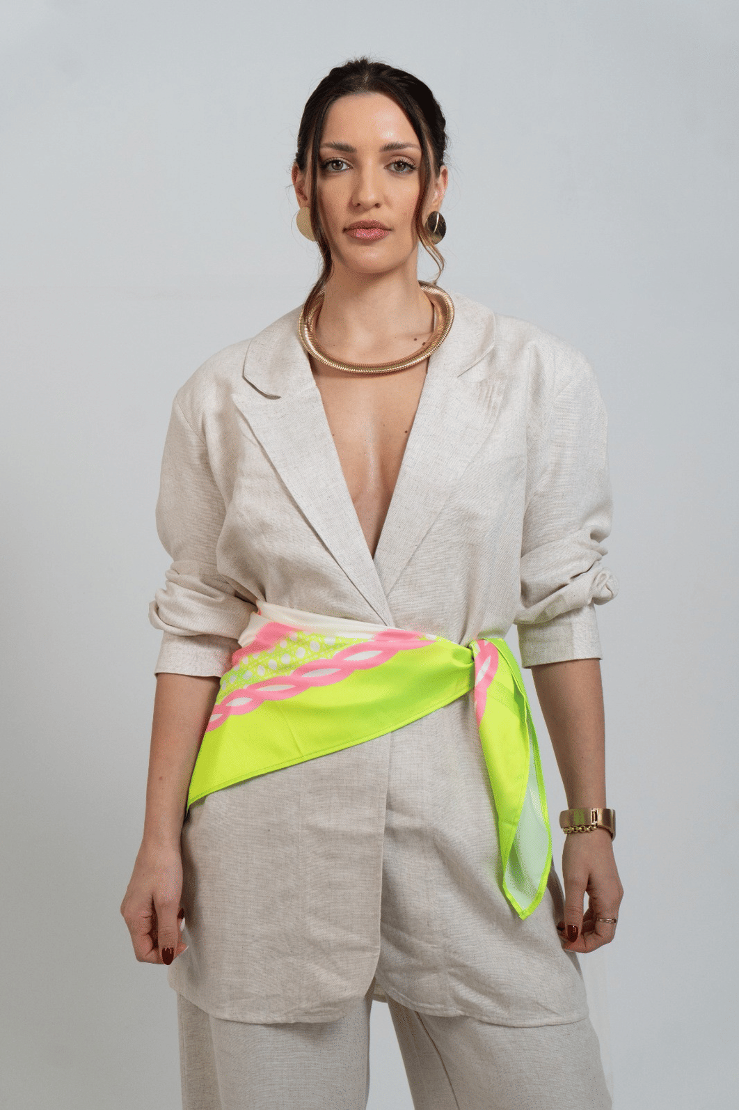 elegante e versátil, o blazer alongado acompanha um lenço delicado, adicionando um toque de estilo único ao seu look. Perfeito para looks sofisticados! *contém linho.