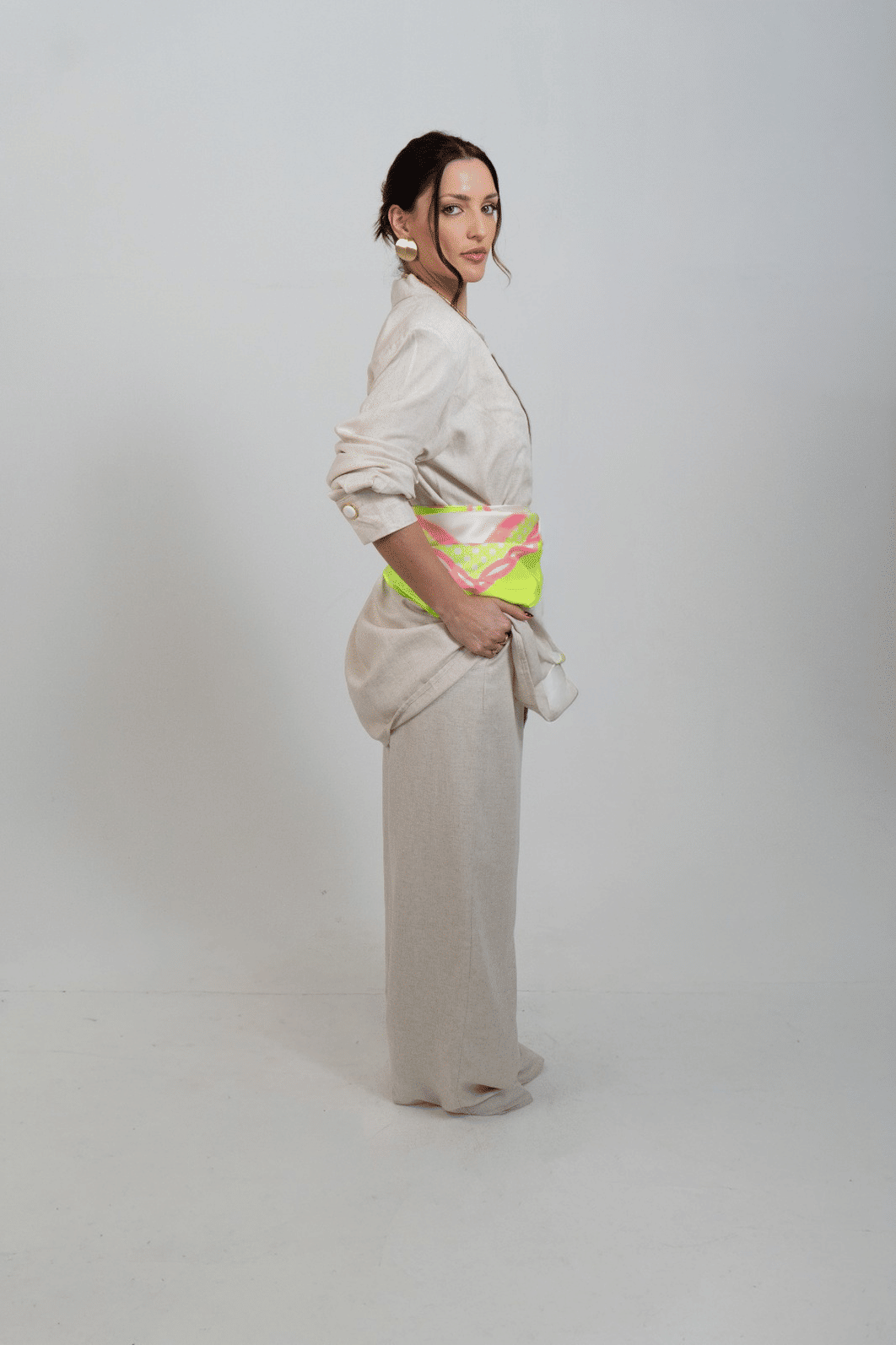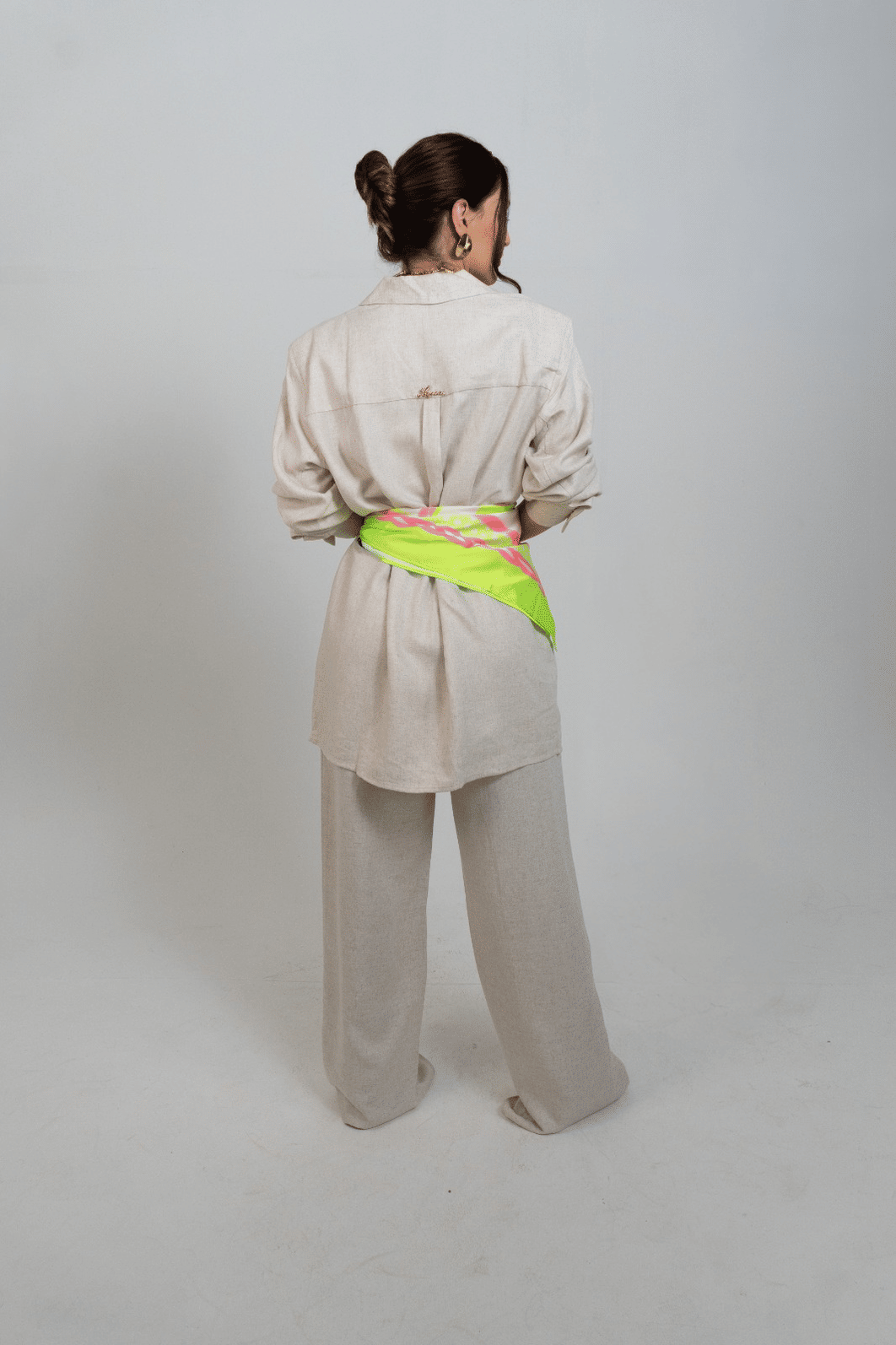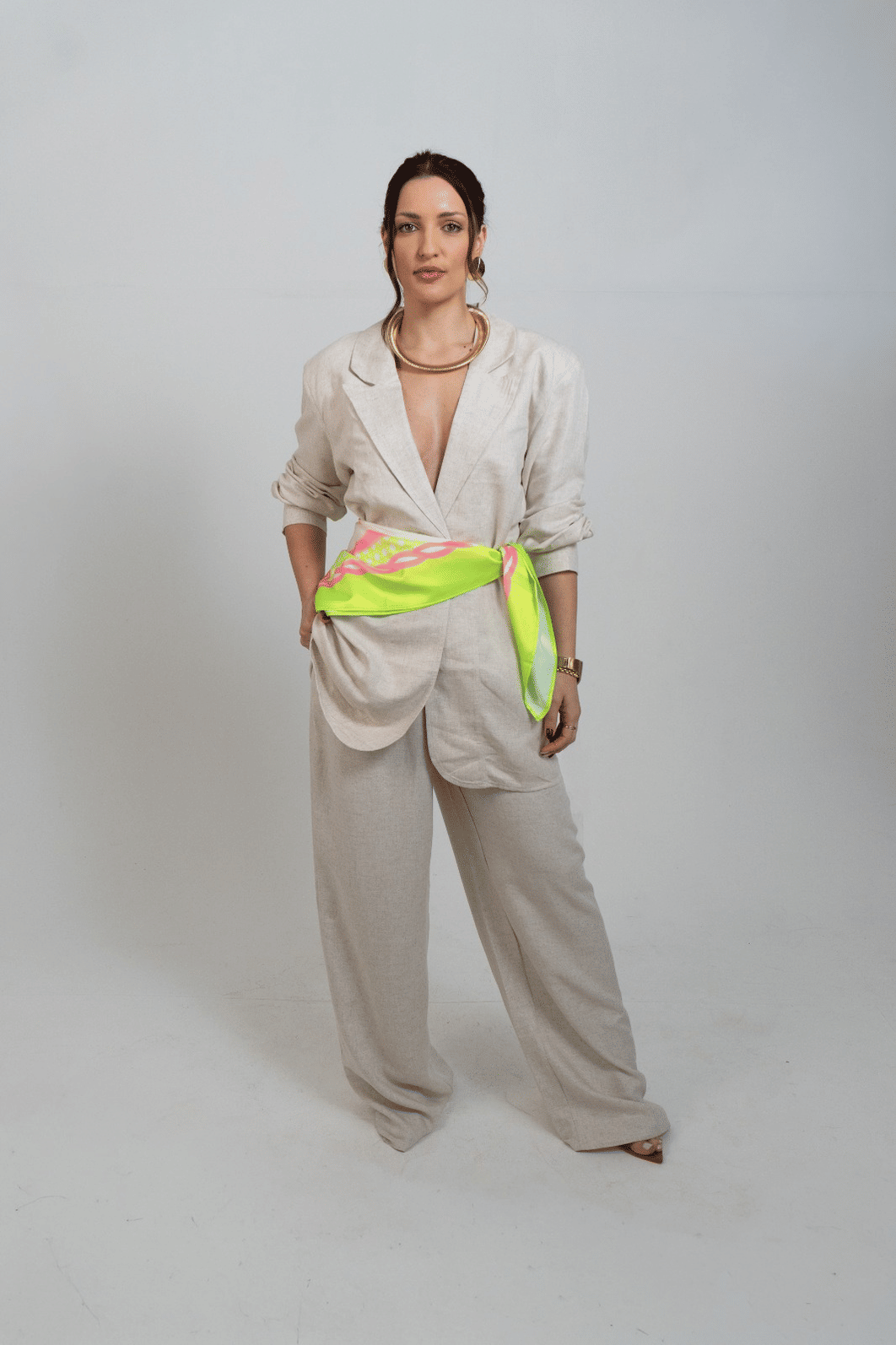 elegante e versátil, o blazer alongado acompanha um lenço delicado, adicionando um toque de estilo único ao seu look. Perfeito para looks sofisticados! *contém linho.