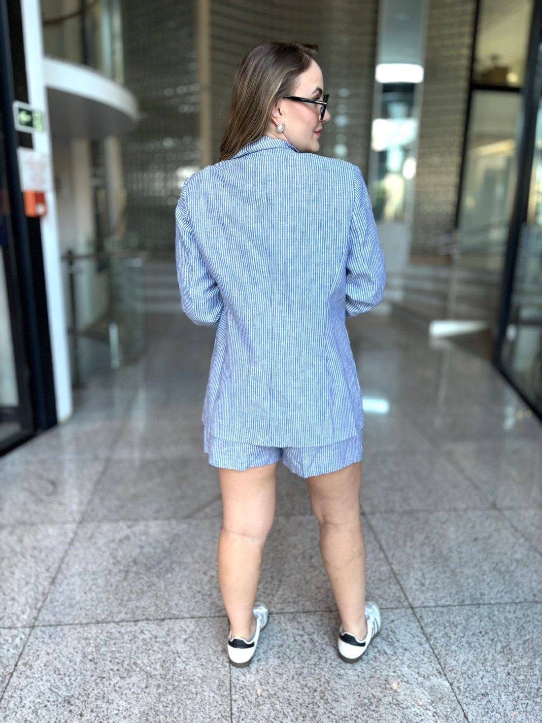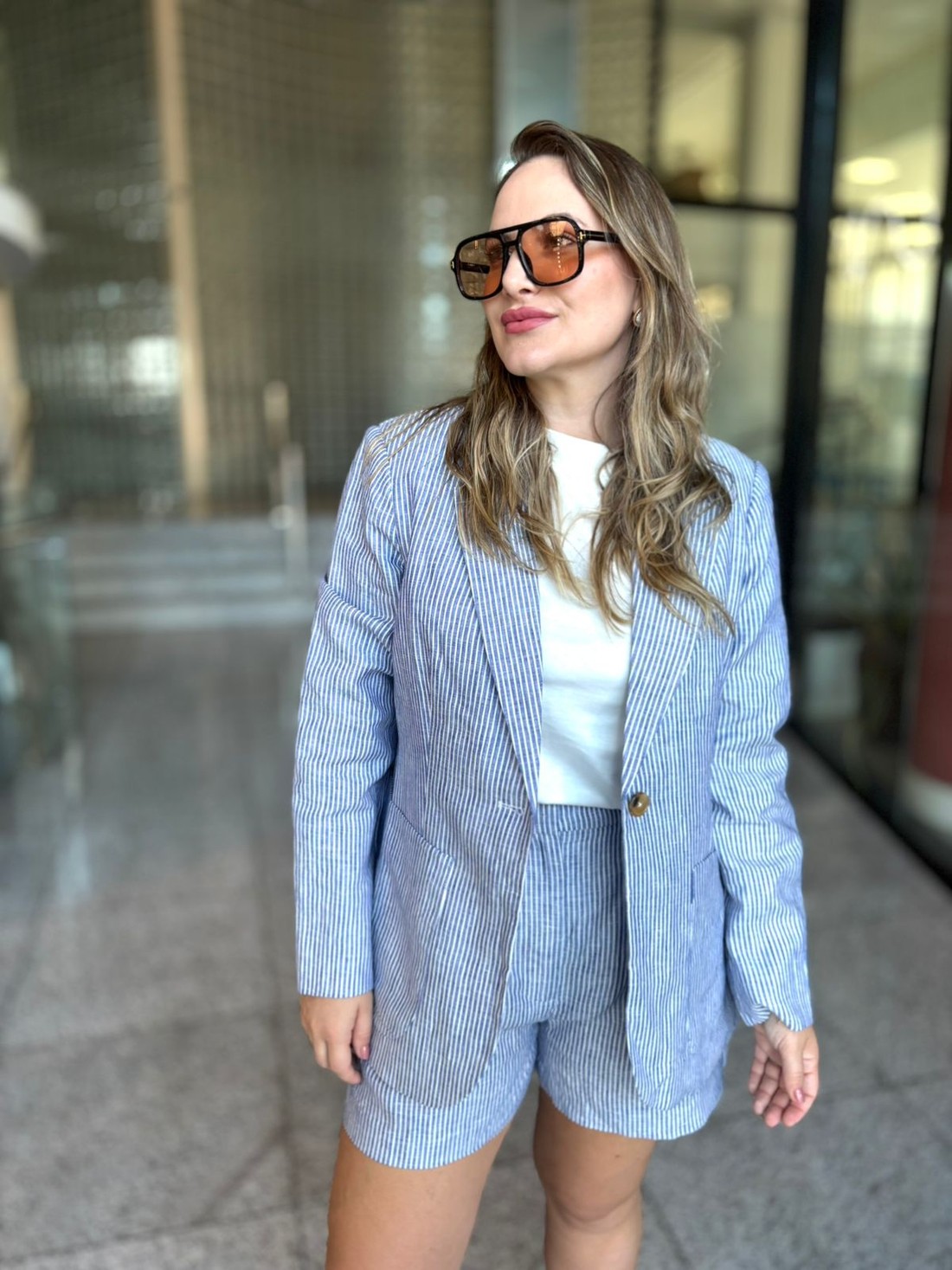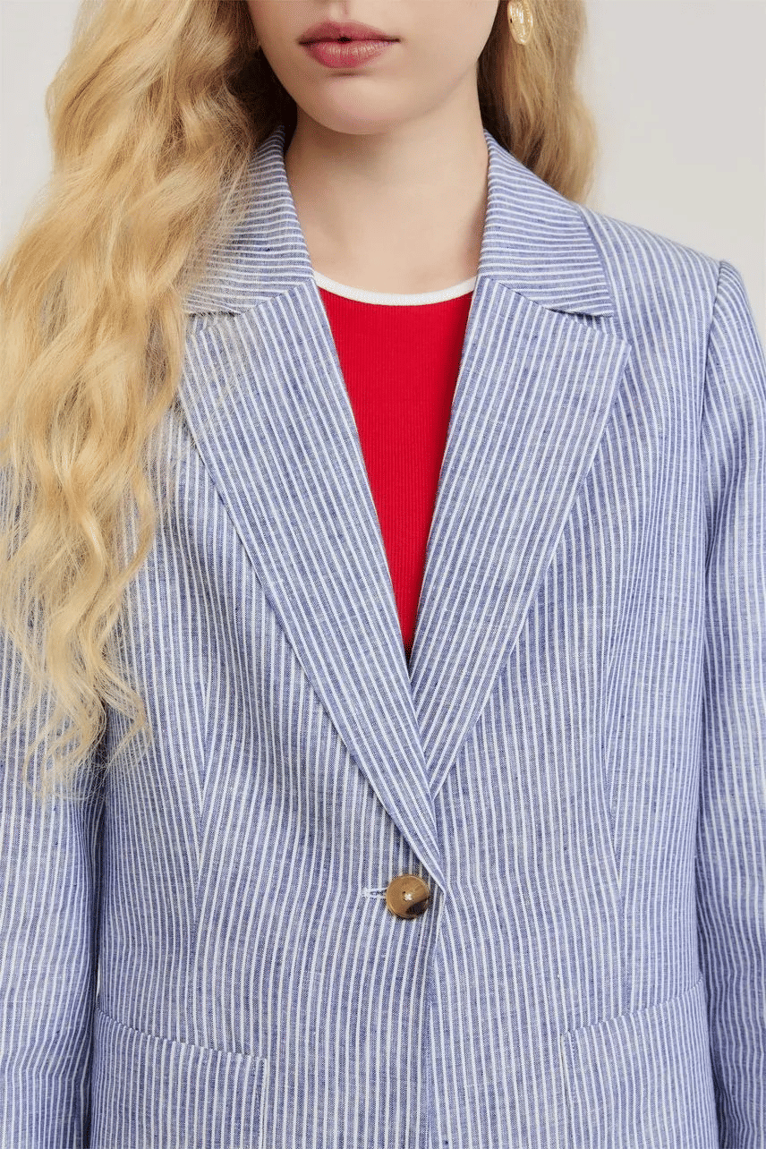 Blazer confeccionado em linho, com modelagem regular e visual atemporal. A padronagem de listras reforça a leveza da peça, enquanto a gola regular, as mangas longas e o fechamento frontal por botão de resina garantem um acabamento clássico. Com barra reta e bolso chapado, é uma escolha versátil para composições elegantes e frescas, transitando com facilidade entre looks de trabalho e produções mais descontraídas.