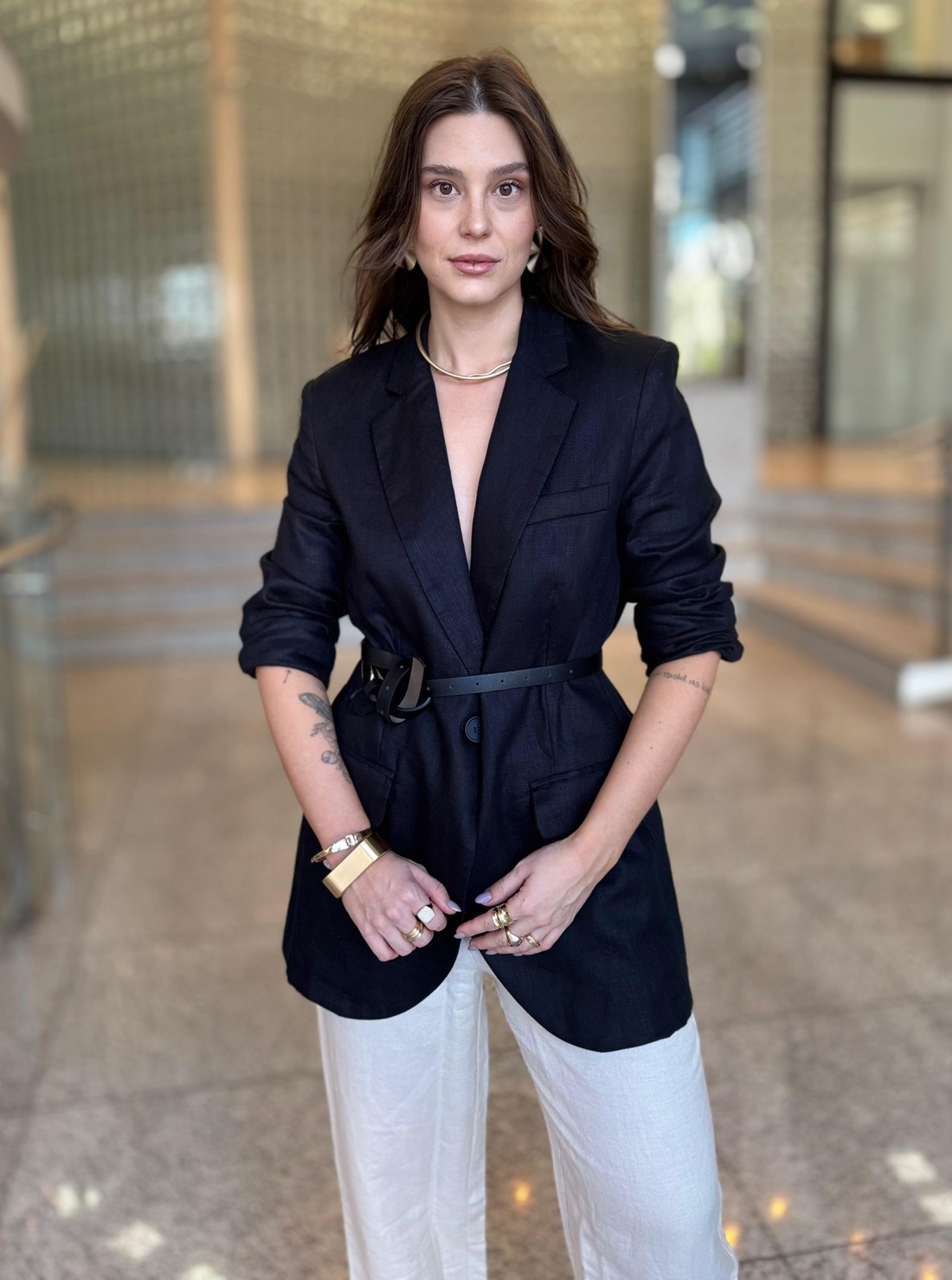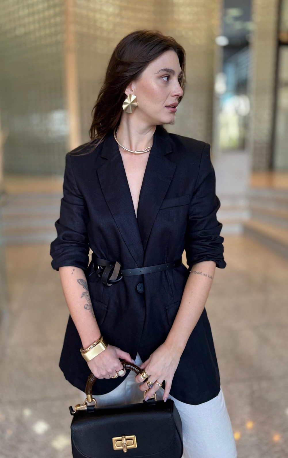 Confeccionado em linho de gramatura mais encorpada, o blazer possui modelagem levemente alongada que valoriza a silhueta com elegância. O corte preciso traz estrutura sem perder o movimento natural do tecido, enquanto o acabamento refinado reforça o ar sofisticado. Versátil, ele pode transitar entre o look de trabalho, produções noturnas e composições modernas com jeans ou alfaiataria.