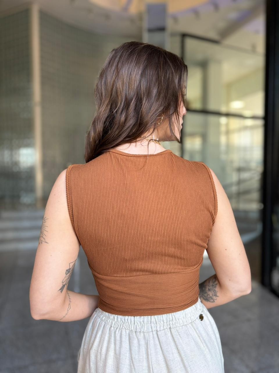 Confeccionada em malha canelada de toque macio, a blusa possui modelagem ajustada e comprimento cropped que se encaixa perfeitamente em peças de cintura alta. A barra dupla adiciona um detalhe sutil e elegante, garantindo acabamento impecável e caimento estruturado, ideal para compor looks atuais e cheios de personalidade.
