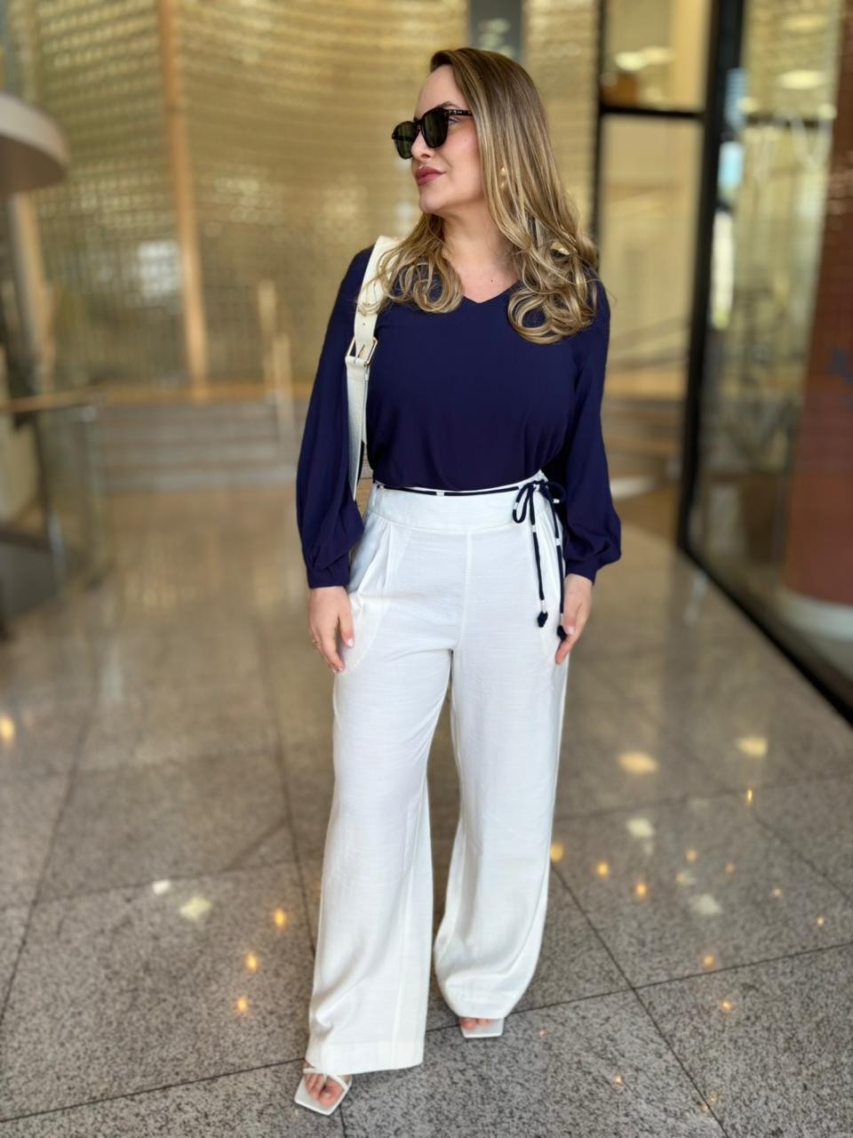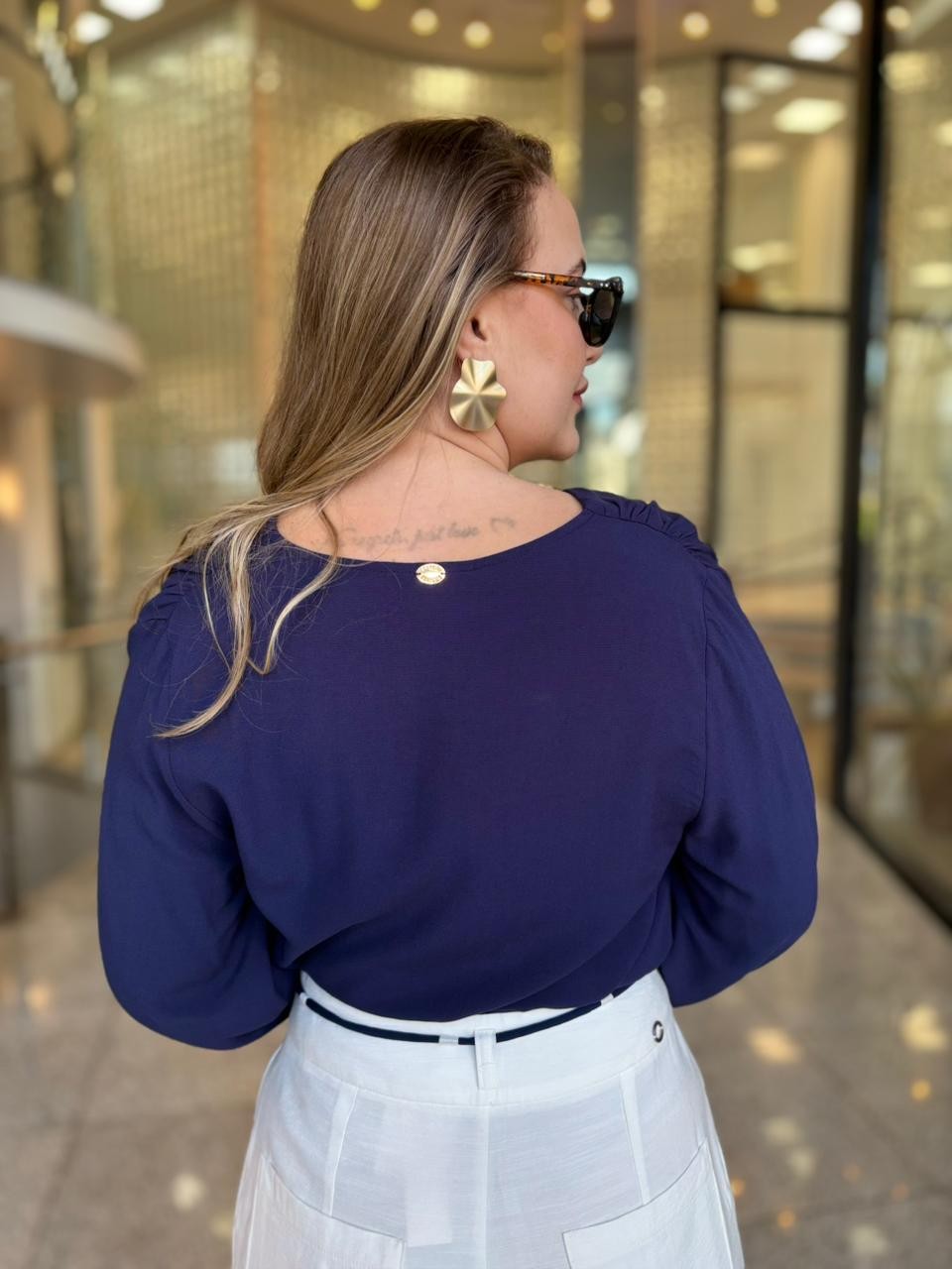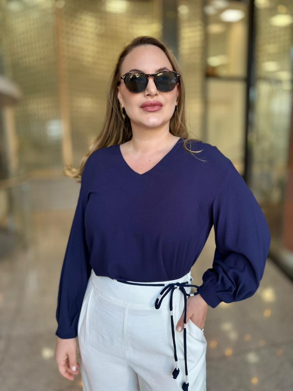 BLUSA DECOTE V MANGA MEDIA AZUL MARINHO LANÇA PERFUME