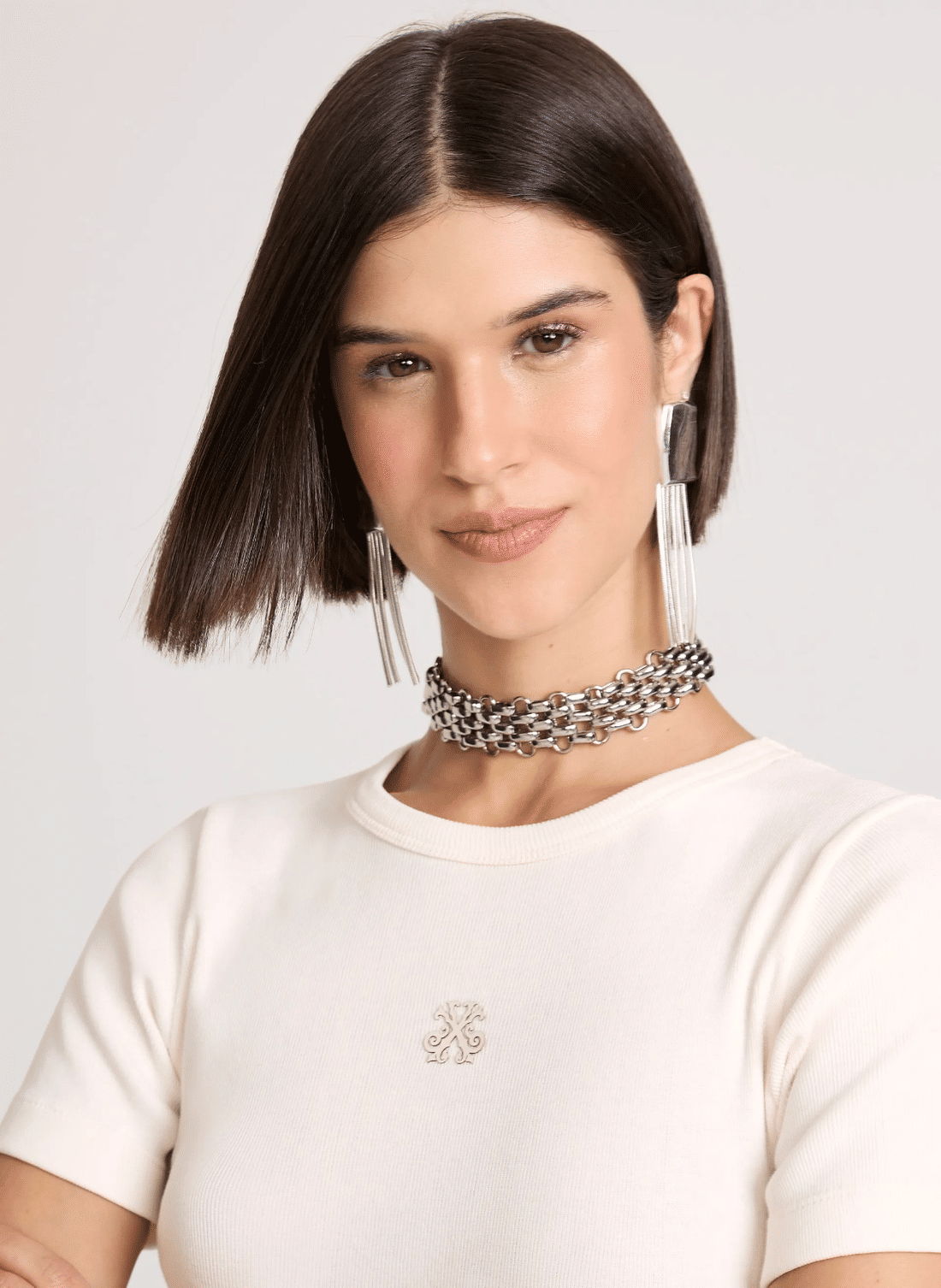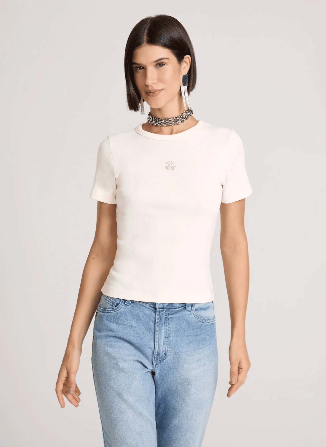 Confeccionada em malha canelada, a blusa possui modelagem baby look , caímento justo ao corpo, decote careca, detalhe da logo em relevo, mangas curtas e acabamento pespontado.