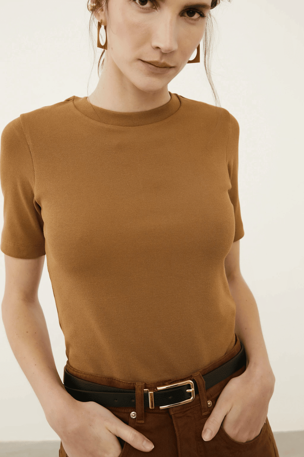 Descubra a sofisticação da T-shirt em malha bandagem Blusa Thally Bronze. Com manga curta e gola em ribana, oferece um caimento perfeito graças à modelagem slim. Ideal para compor looks elegantes e modernos, une conforto, leveza e estilo. Aposte nessa peça versátil para valorizar seu visual em qualquer ocasião, do casual ao sofisticado.