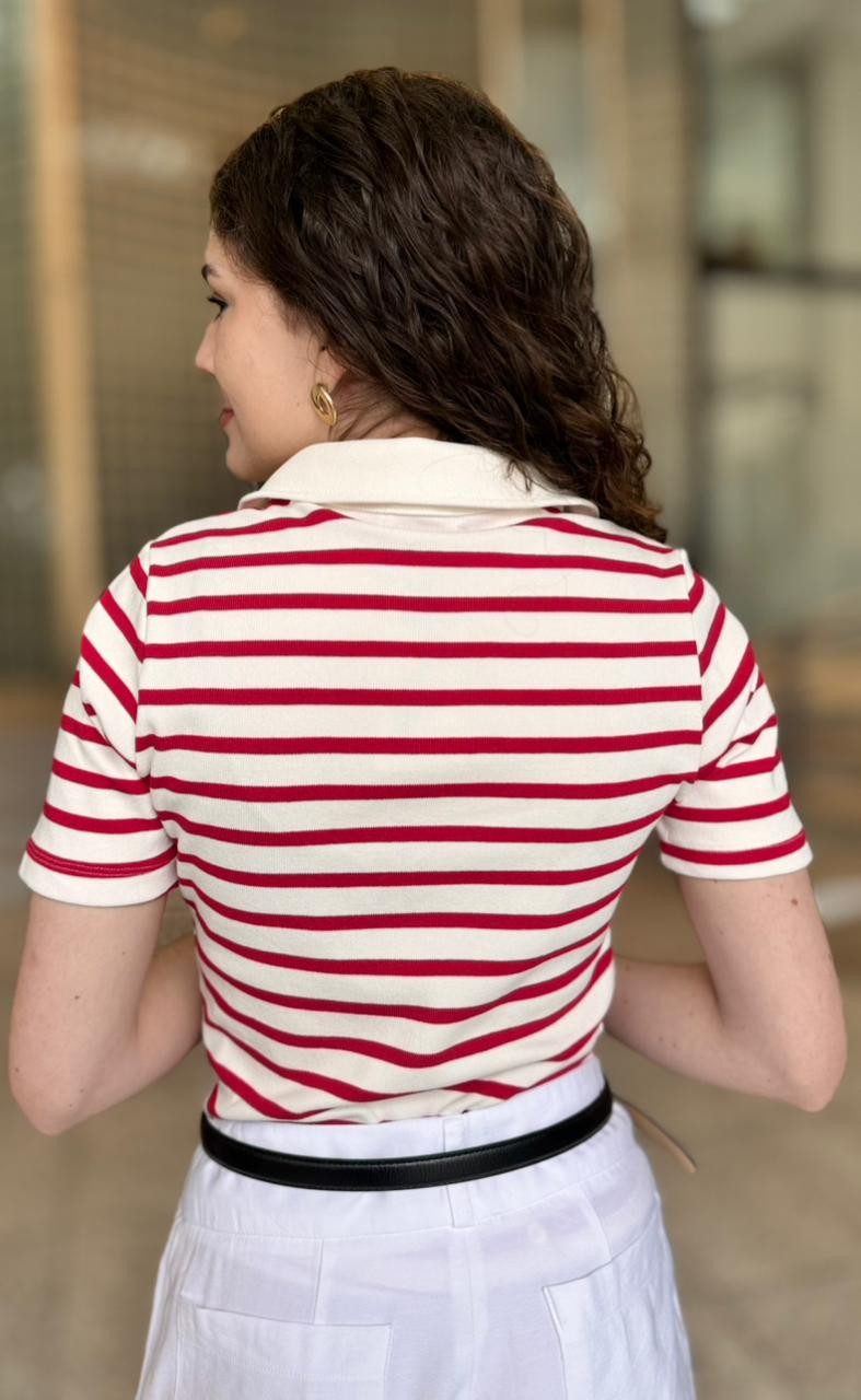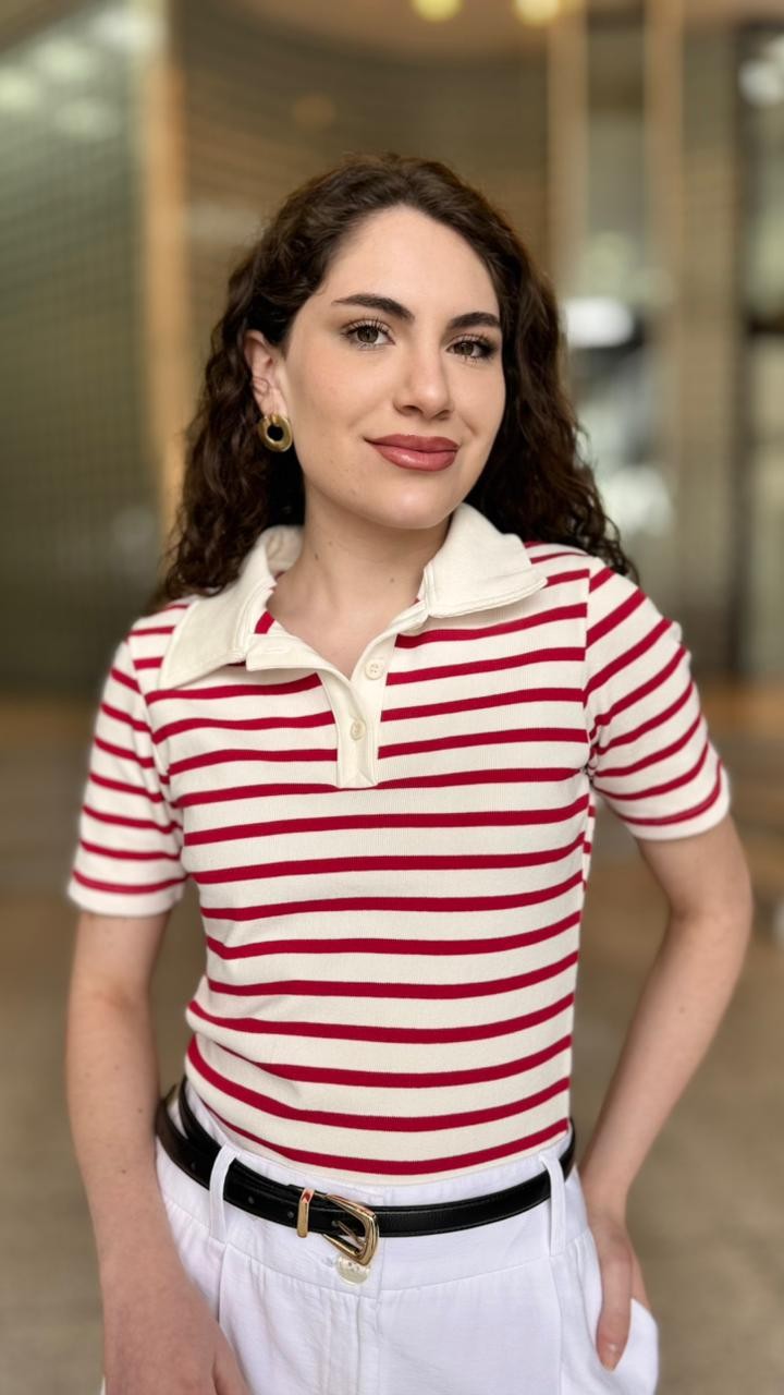 Descubra a elegância da Blusa Thami Vermelho, confeccionada em malha bandagem de alta qualidade que valoriza o caimento e garante conforto. O destaque fica por conta do detalhe em botões no decote, aliado à moderna manga curta e ao charme das listras no tecido. Uma peça sofisticada, perfeita para compor looks atuais e versáteis.