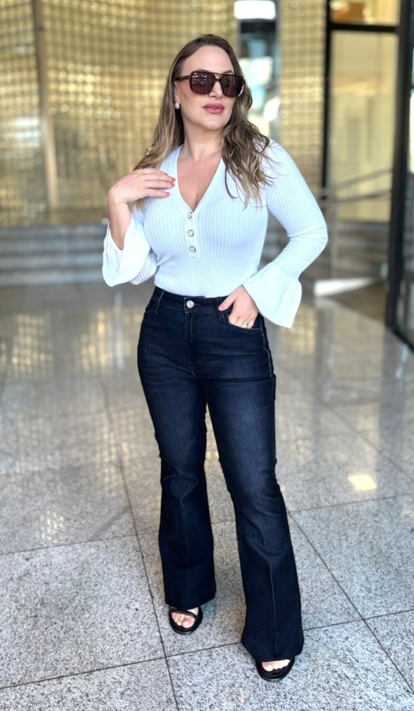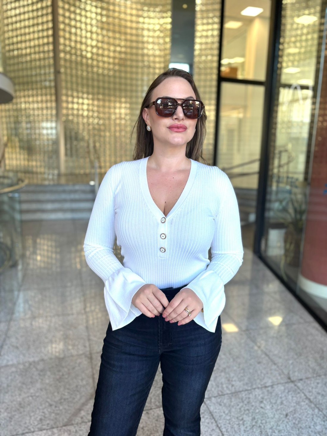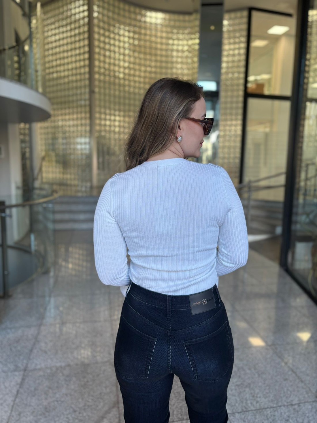 Blusa confeccionada em tricot, com modelagem slim e comprimento regular. Possui mangas longas e decote em V, valorizando a silhueta com um visual elegante e feminino. A barra reta garante um acabamento clean, tornando a peça versátil para composições que transitam do casual ao sofisticado, combinando facilmente com alfaiataria, jeans ou saias.