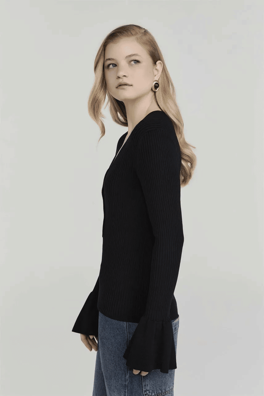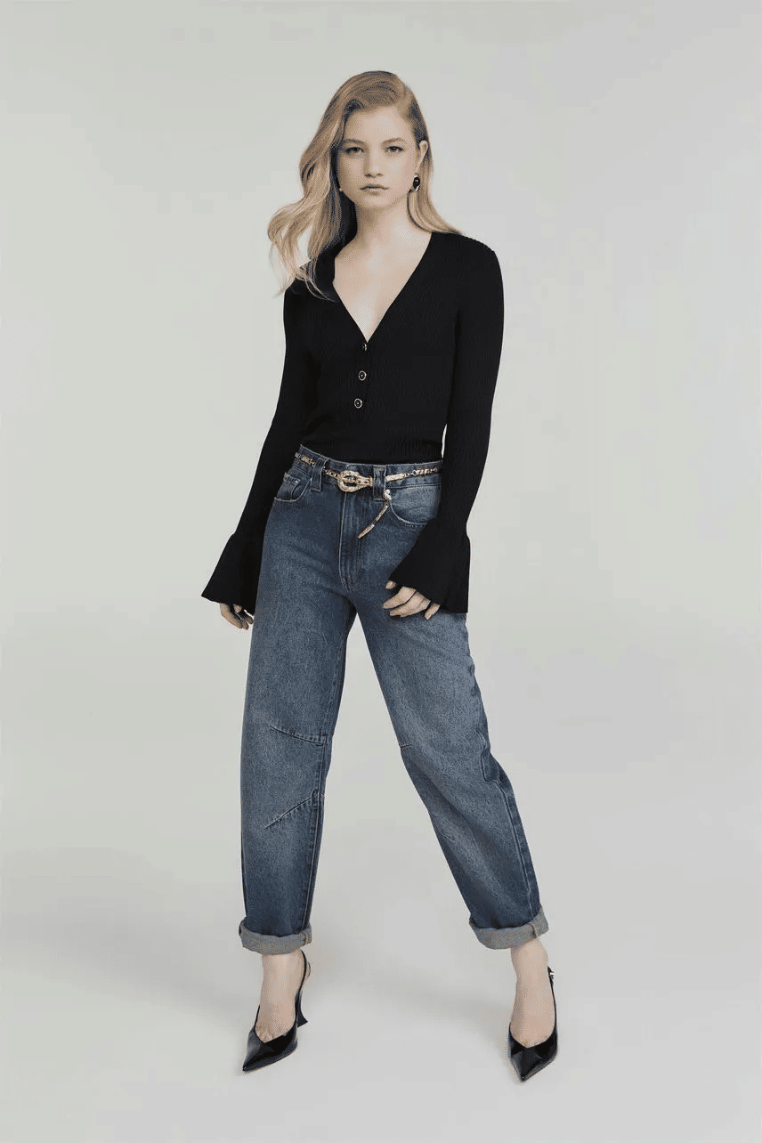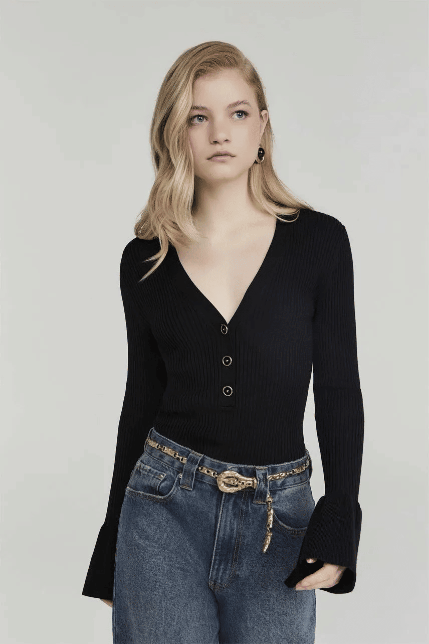 Blusa confeccionada em tricot, com modelagem slim e comprimento regular. Possui mangas longas e decote em V, valorizando a silhueta com um visual elegante e feminino. A barra reta garante um acabamento clean, tornando a peça versátil para composições que transitam do casual ao sofisticado, combinando facilmente com alfaiataria, jeans ou saias.