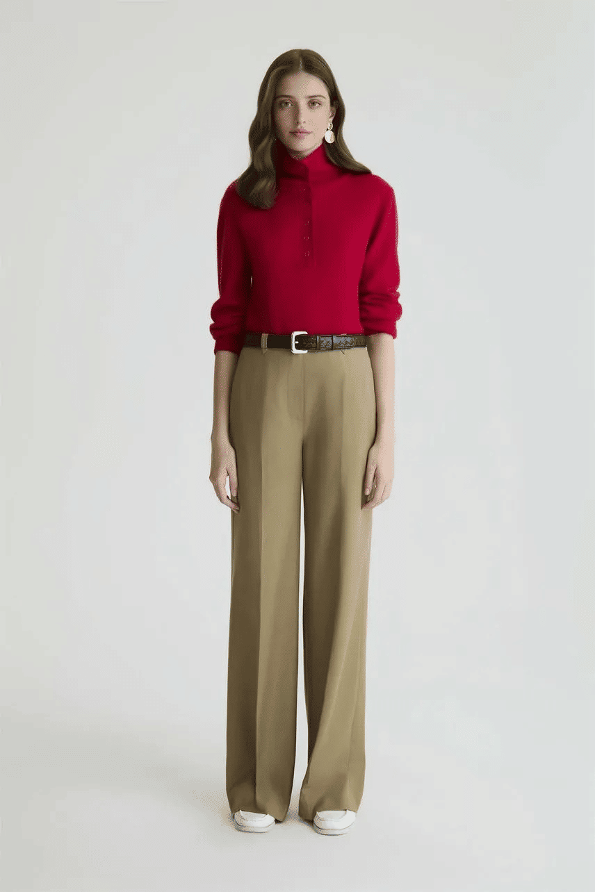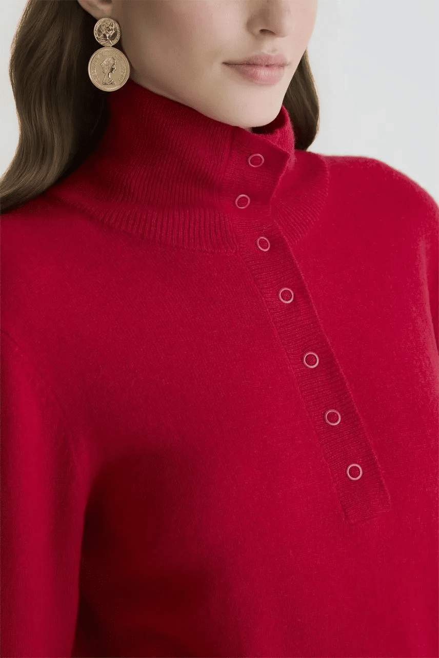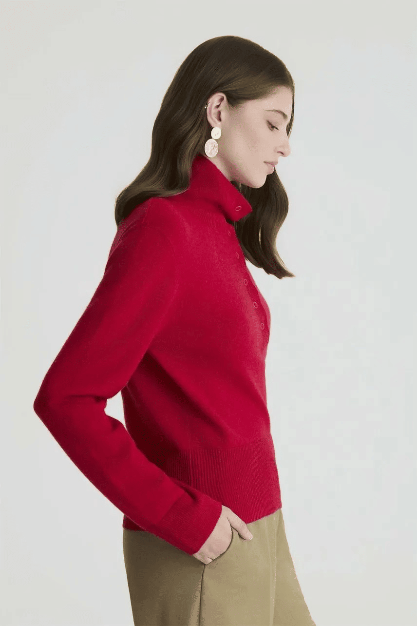 Blusa confeccionada em tricot, com modelagem regular e mangas longas. Possui gola alta com fechamento por botões de pressão e acabamento de barra reta, trazendo um visual elegante e atemporal para diferentes composições.