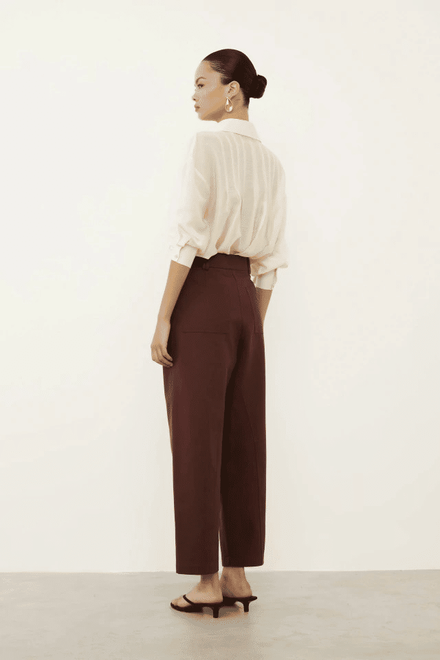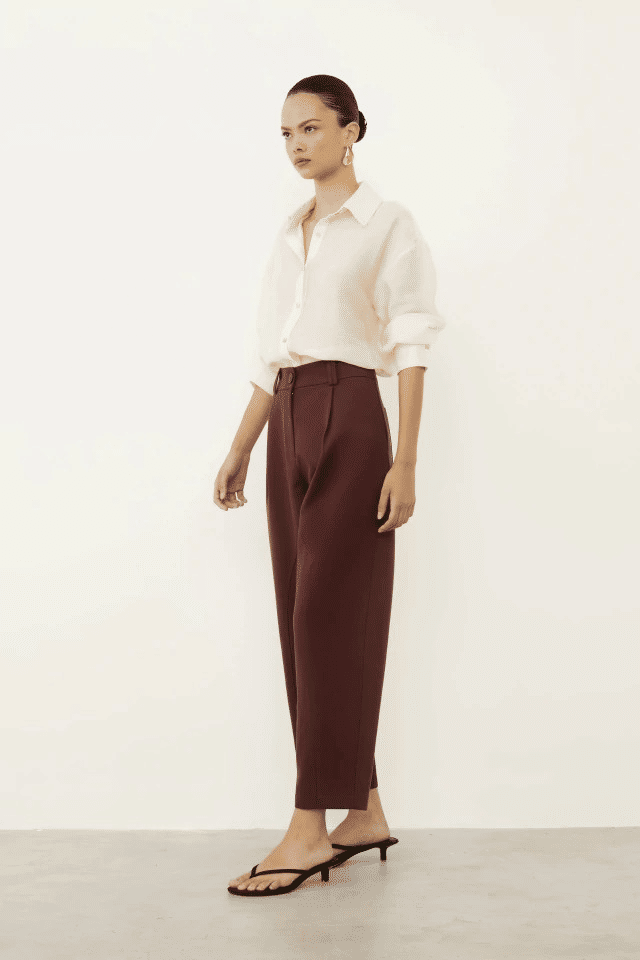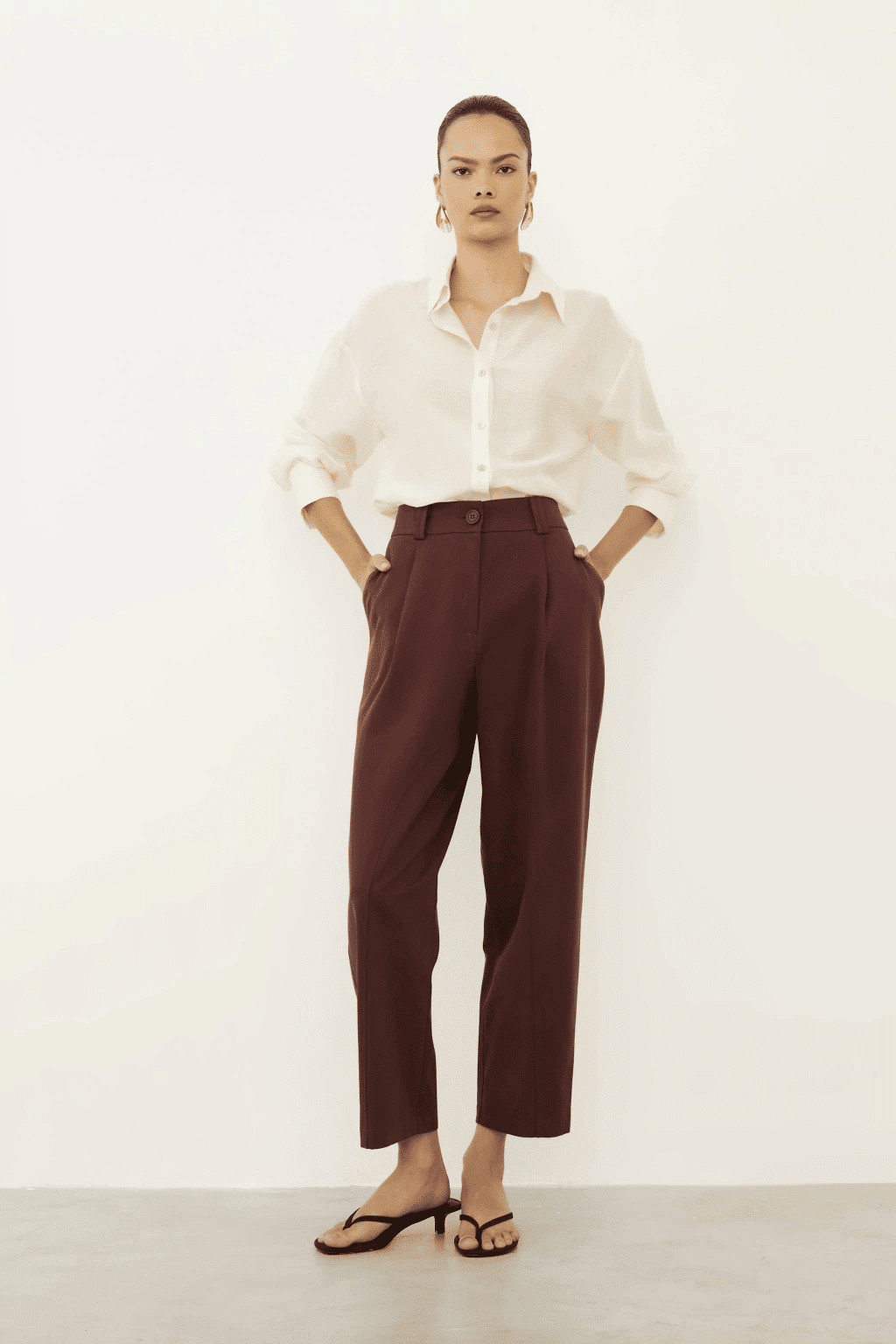 Descubra a sofisticação da Calça Ayla Vinho, perfeita para compor looks elegantes e modernos. Sua modelagem cenoura valoriza a silhueta, enquanto o cós largo com prega e passante duplo garantem conforto e estilo. O recorte diferenciado na entreperna, bolsos laterais e traseiros, além do fechamento em botão e zíper, trazem praticidade e um toque contemporâneo para o seu dia a dia.