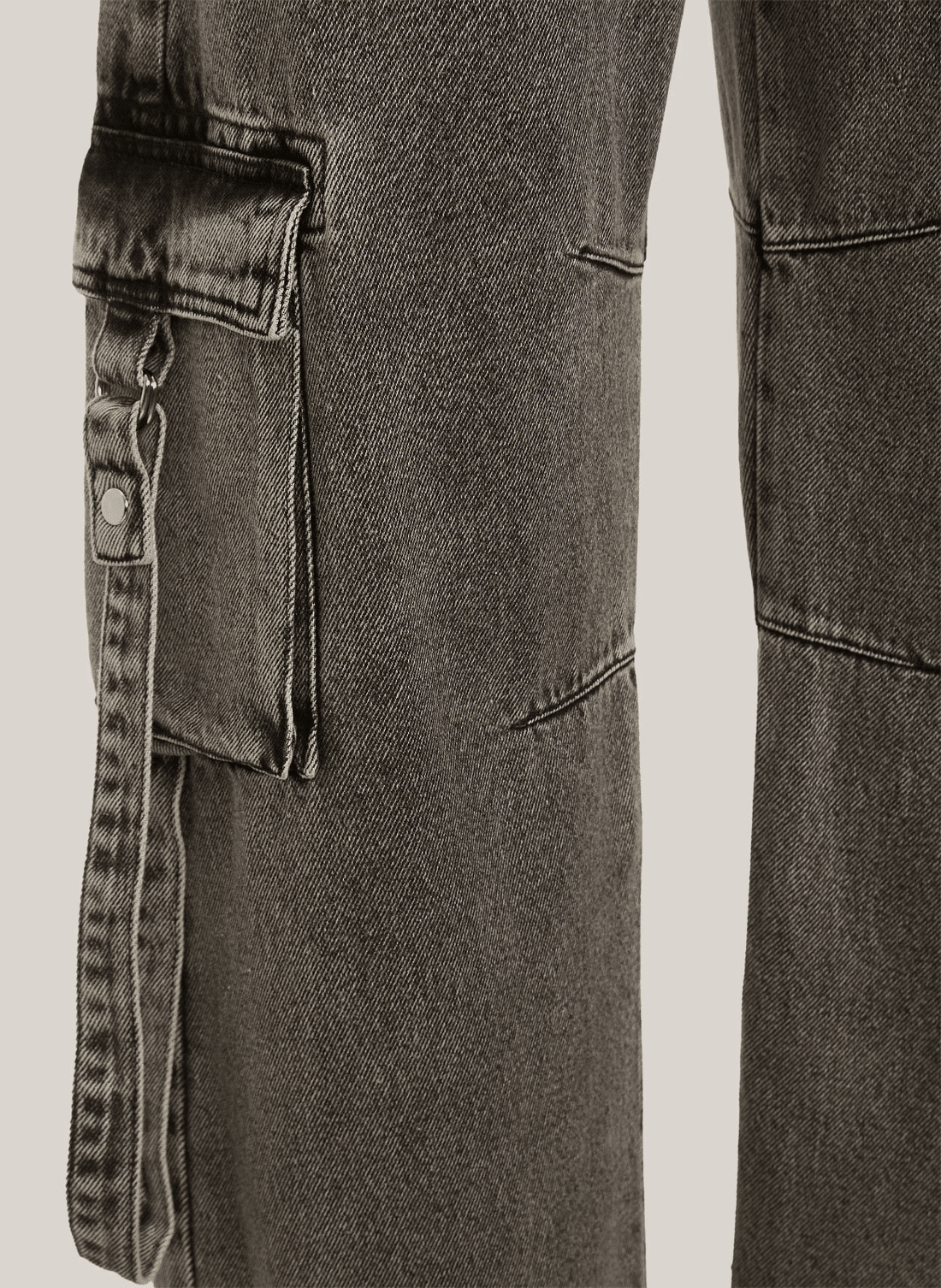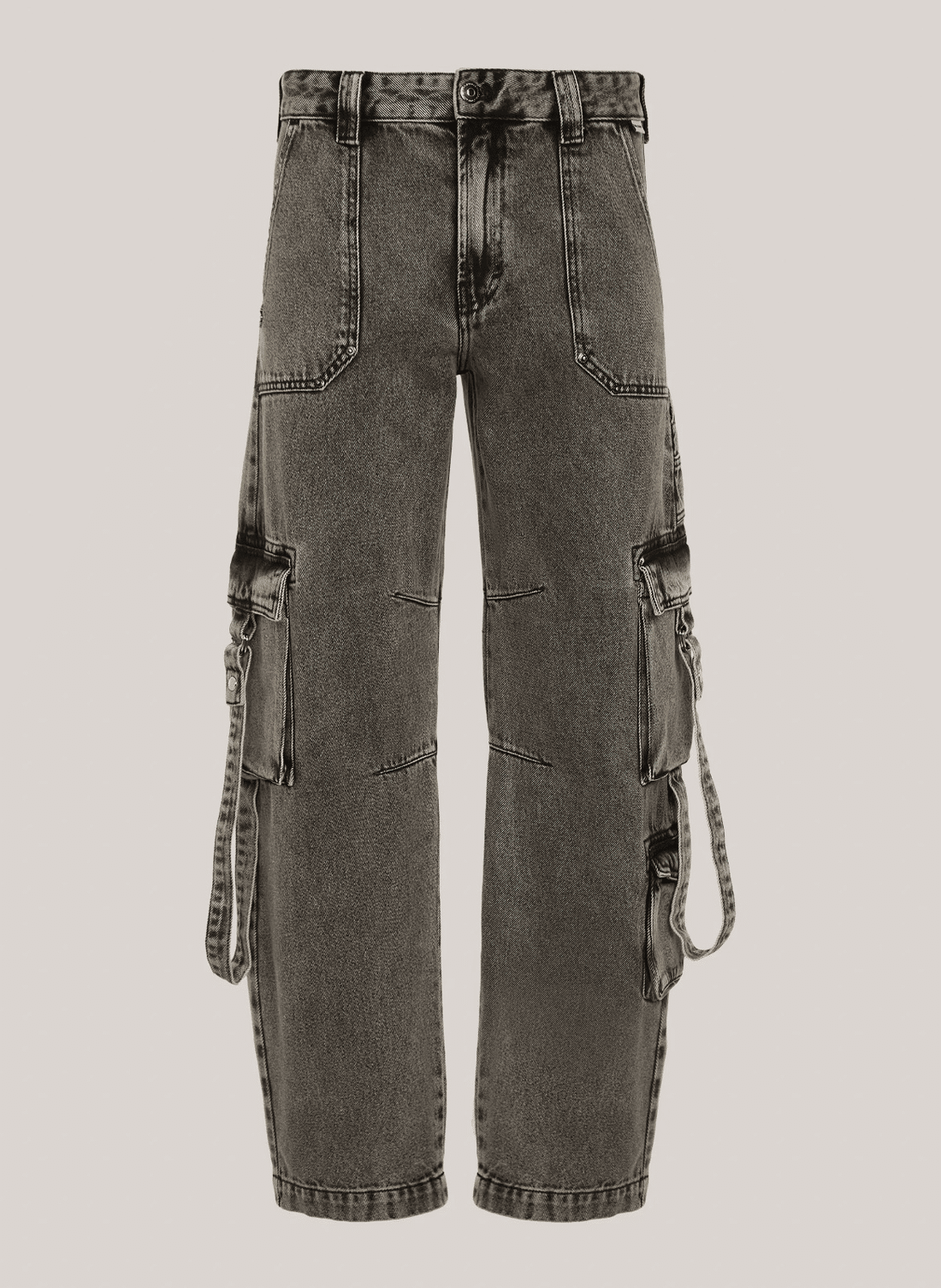 Confeccionada em jeans com lavagem marmorizada, a Calça possui modelagem cargo, cós com passantes, seis bolsos, fechamento frontal por zíper e botão, faixas do mesmo tecidos aplicadas, etiqueta externa aplicada e acabamento pespontado.