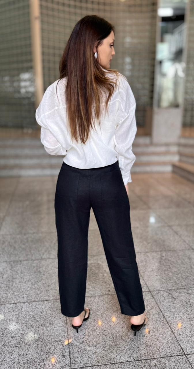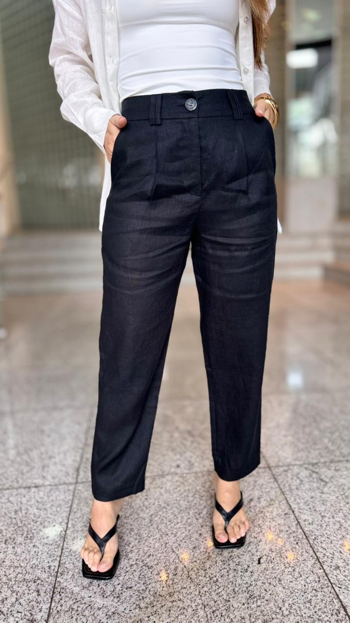 Descubra a sofisticação da Calça Brenda Preto, confeccionada em 100% linho para garantir leveza e elegância aos seus looks. Com modelagem cenoura, possui bolsos laterais e nas costas, além de passante duplo para cintos. O fechamento é feito por zíper e botão, e o charme fica por conta da prega frontal, tornando-a perfeita para combinações refinadas.