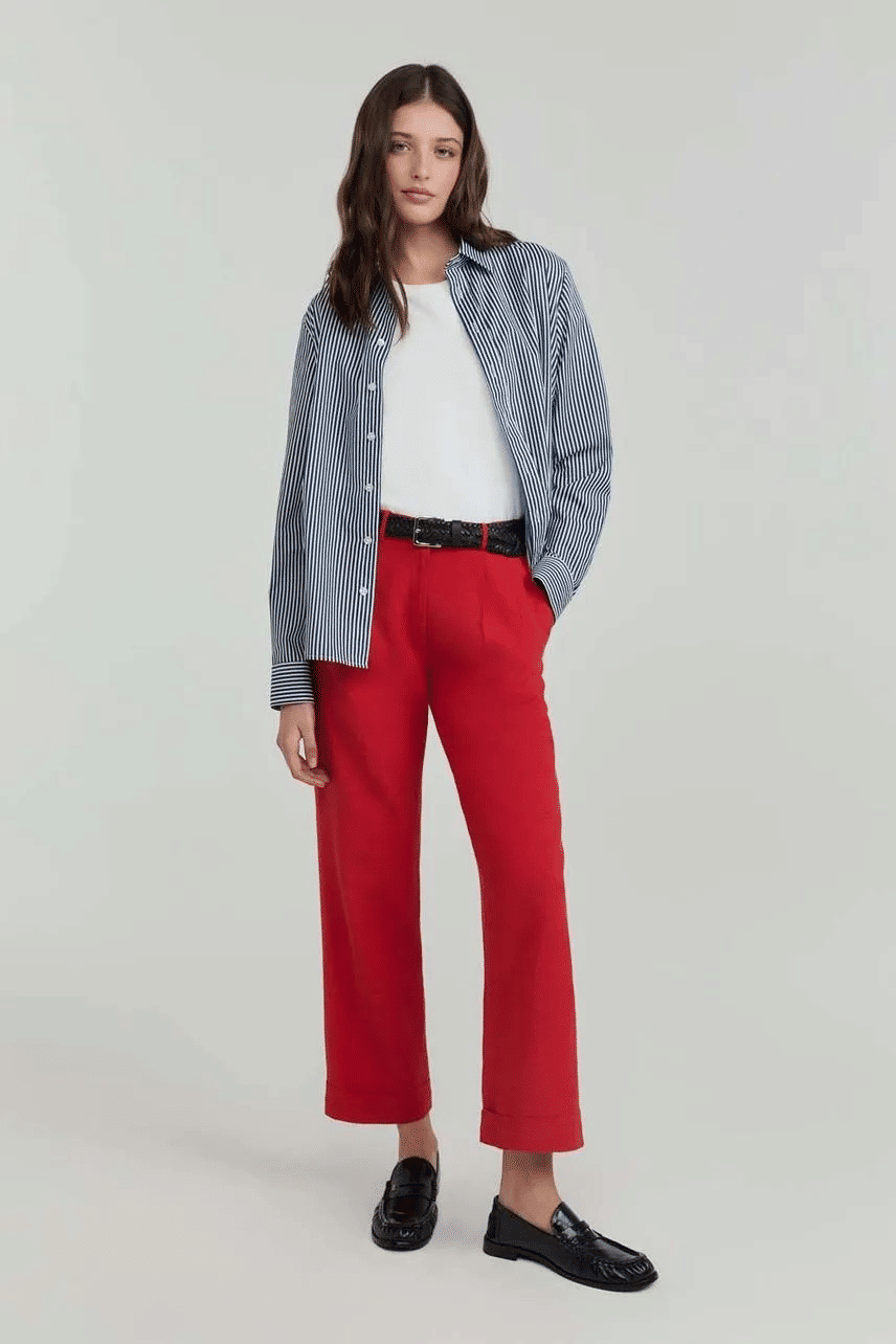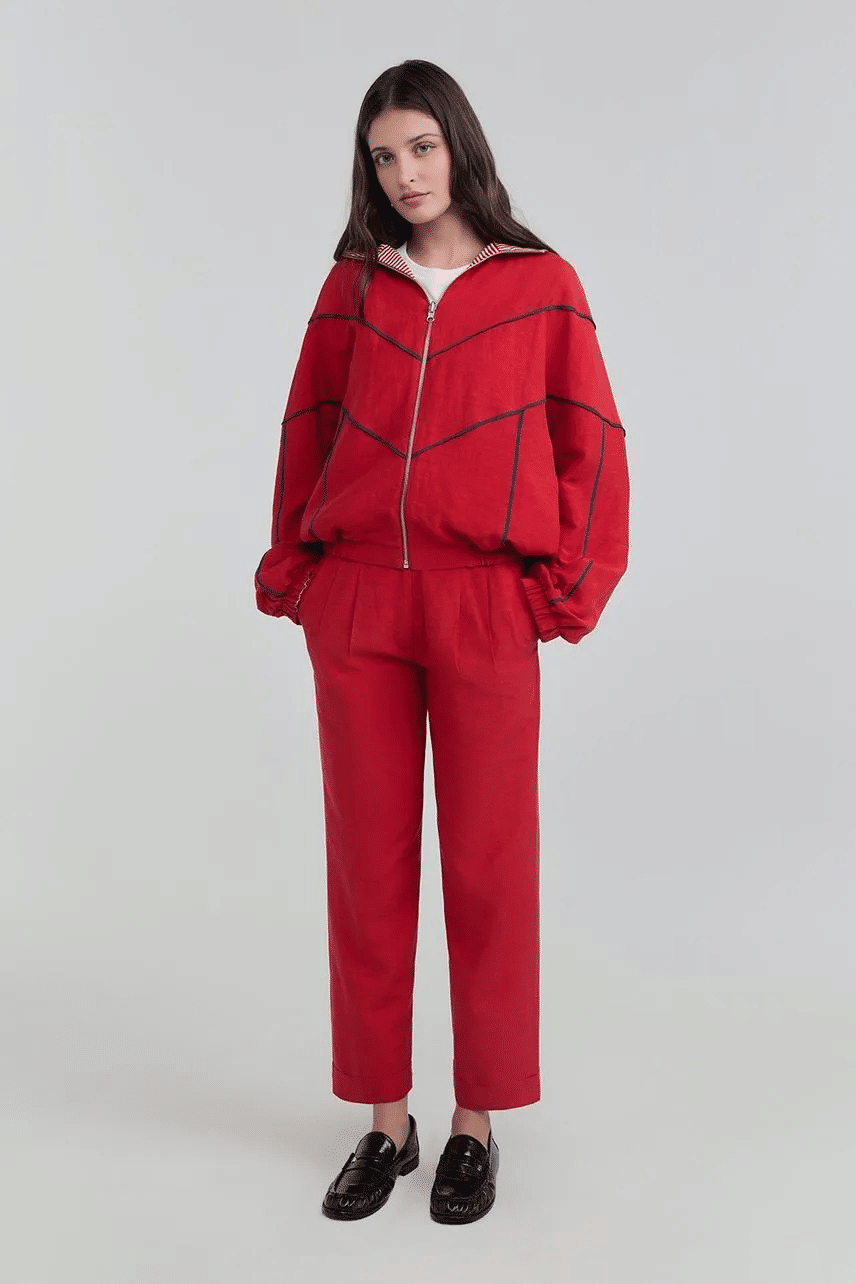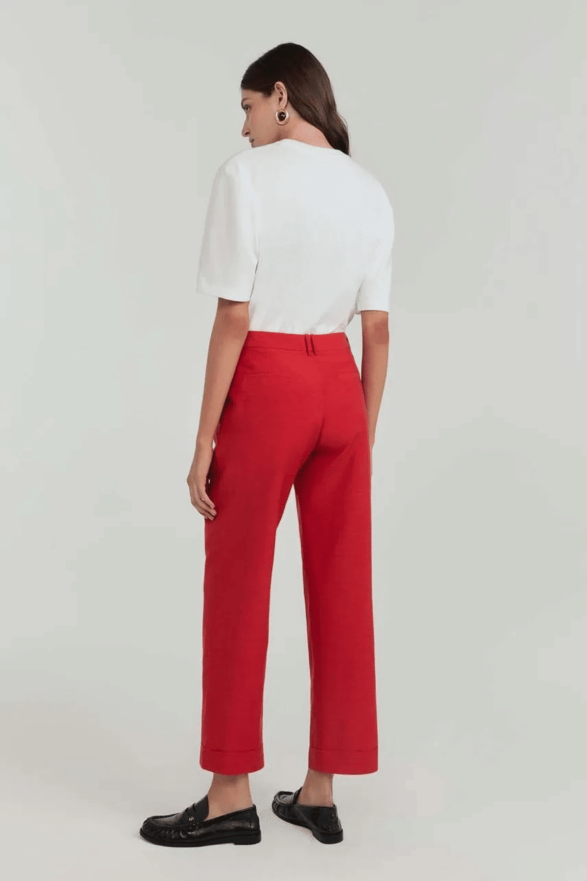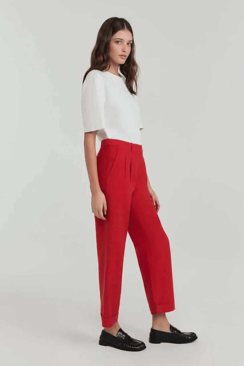 Calça confeccionada em linho, com modelagem reta e comprimento regular, proporcionando caimento leve e elegante. Possui cintura média, cós de alfaiataria e fechamento frontal com zíper, gancho e botão interno, garantindo ajuste preciso. As pregas adicionam sofisticação ao design, enquanto os bolsos funcionais e a barra invisível reforçam o acabamento refinado. Ideal para composições modernas e versáteis.