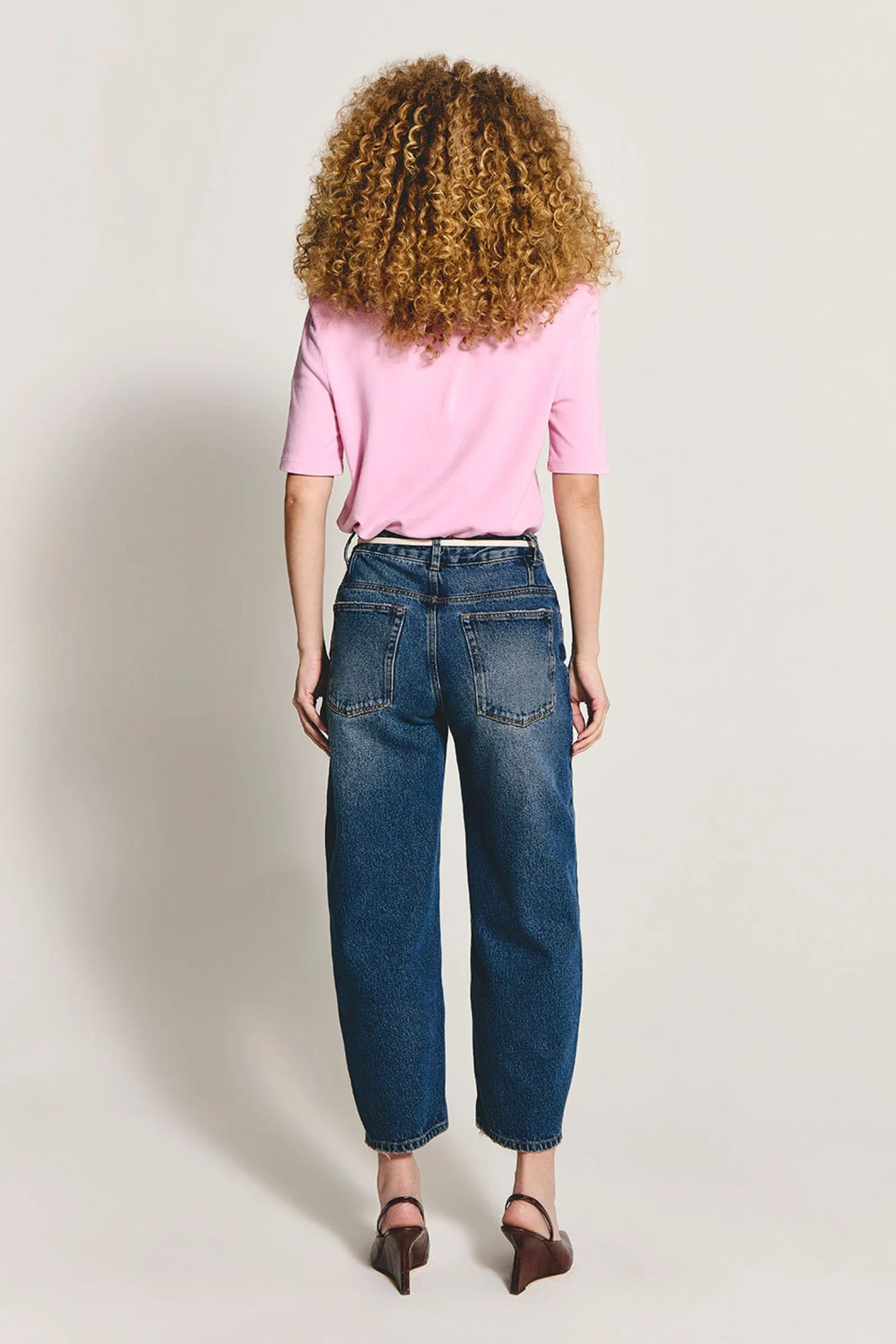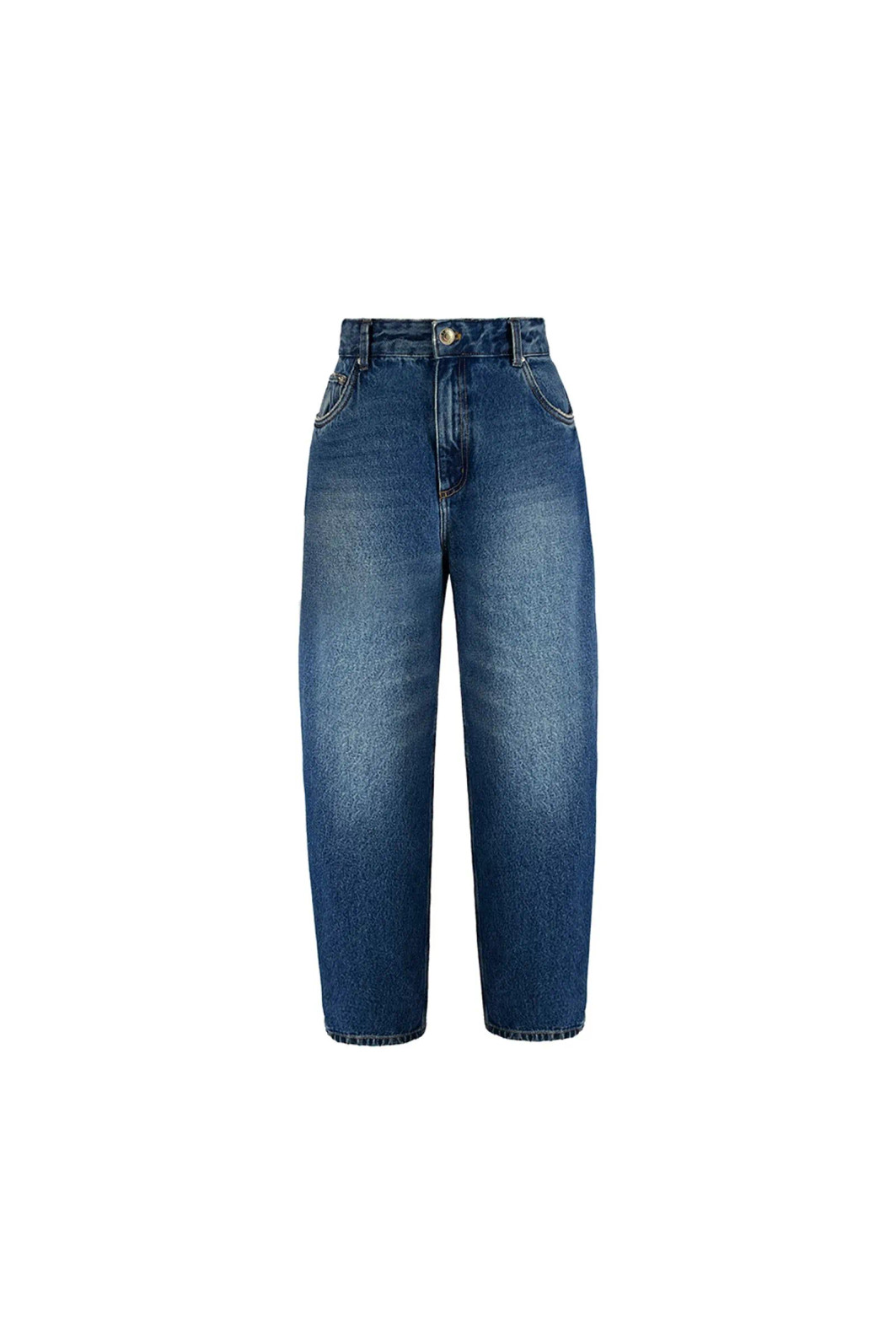 Calça jeans cintura média com modelagem ampla. Fechamento por zíper e botão de metal.