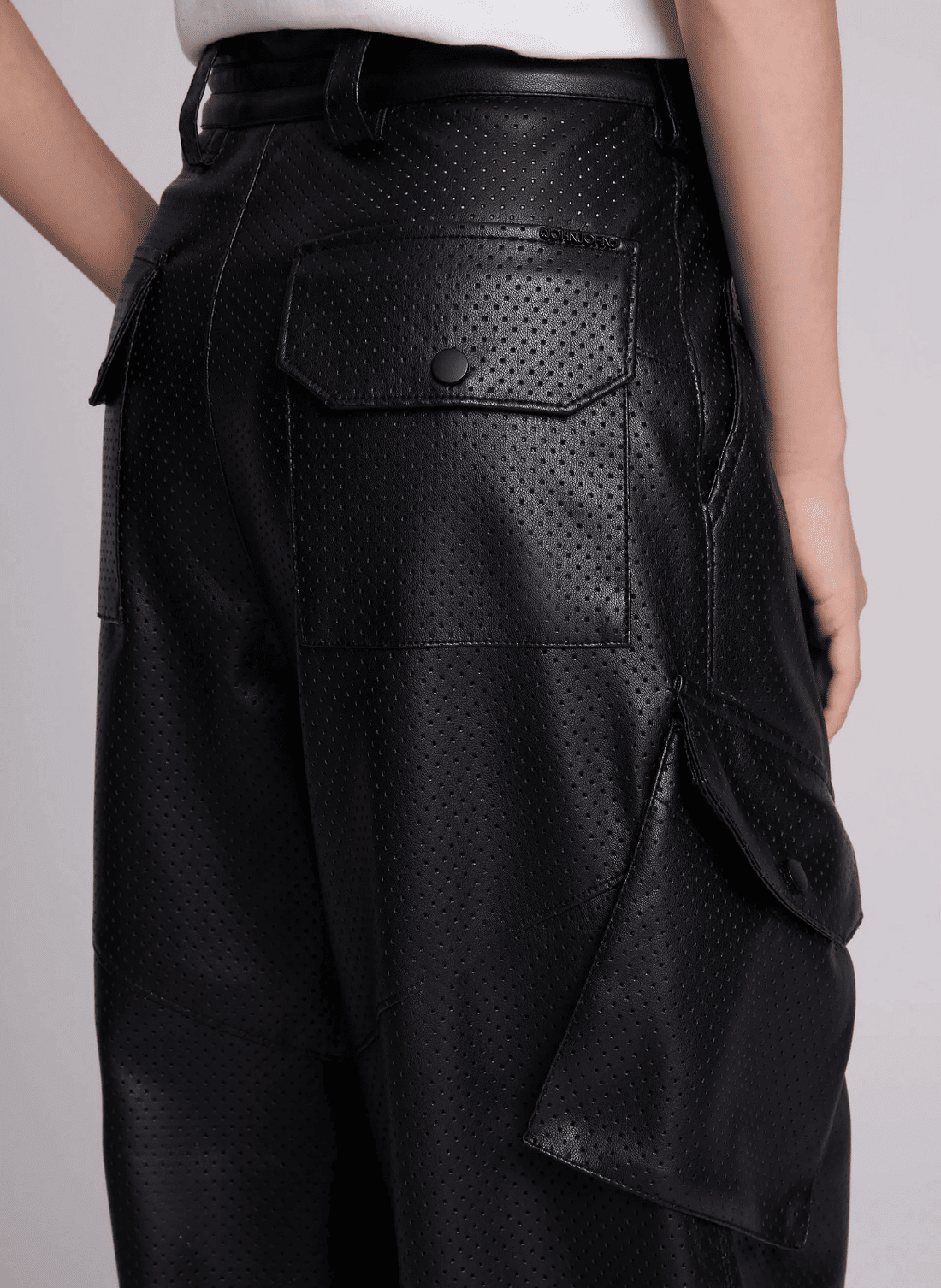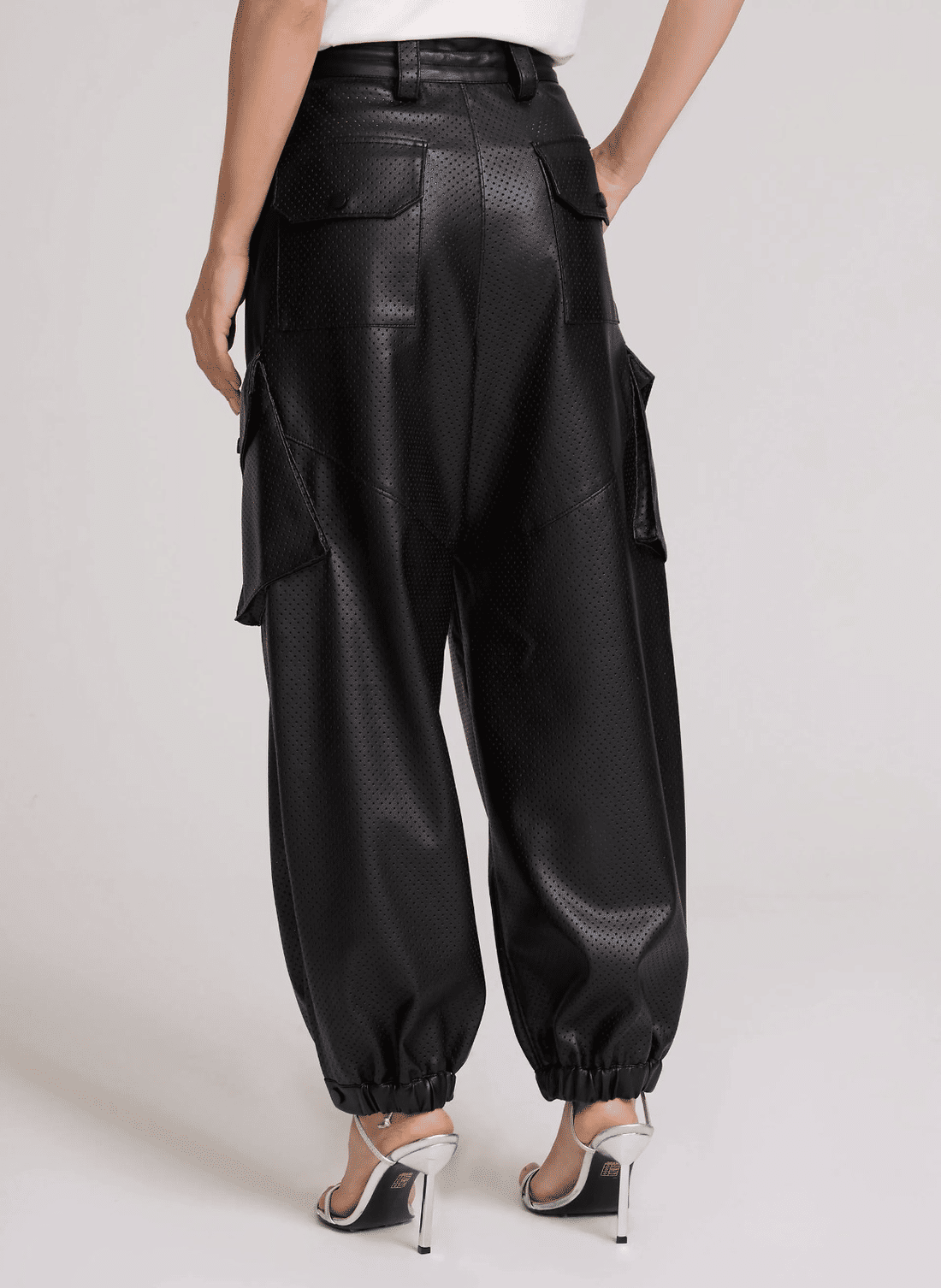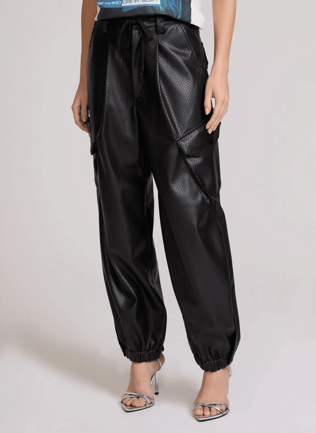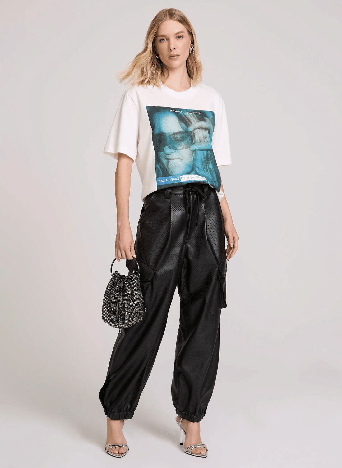Confeccionada em material sintético com textura, a Calça possui modelagem balloon, cós com passantes e cordão para amarração, seis bolsos, fechamento frontal por zíper e botão interno, elástico na barra e acabamento pespontado.