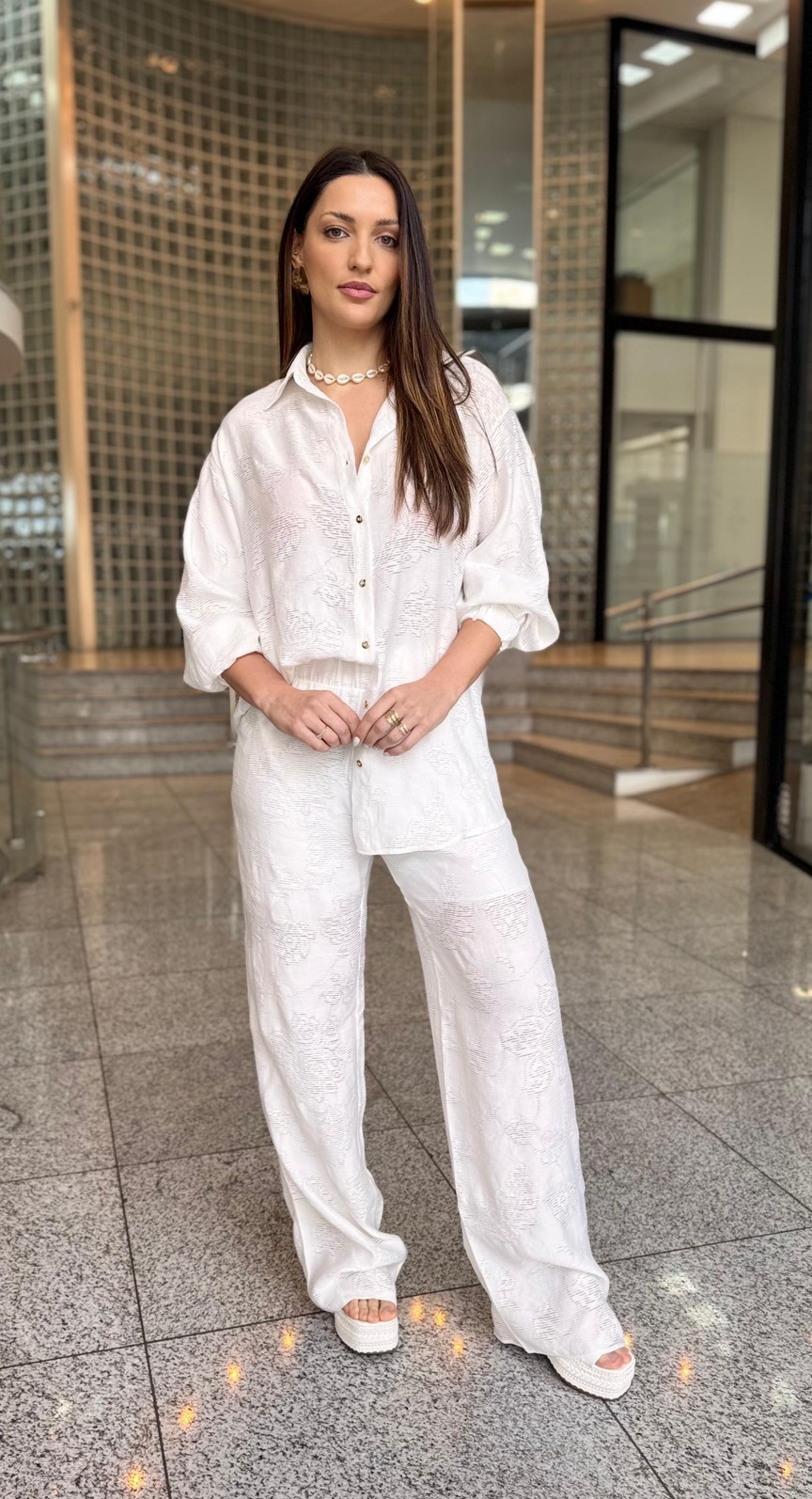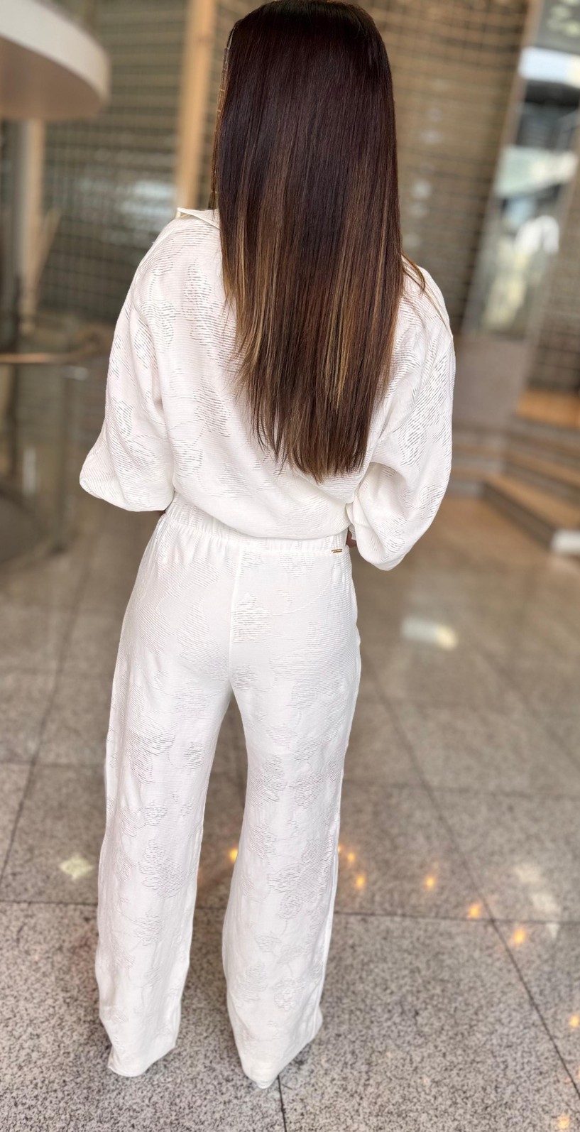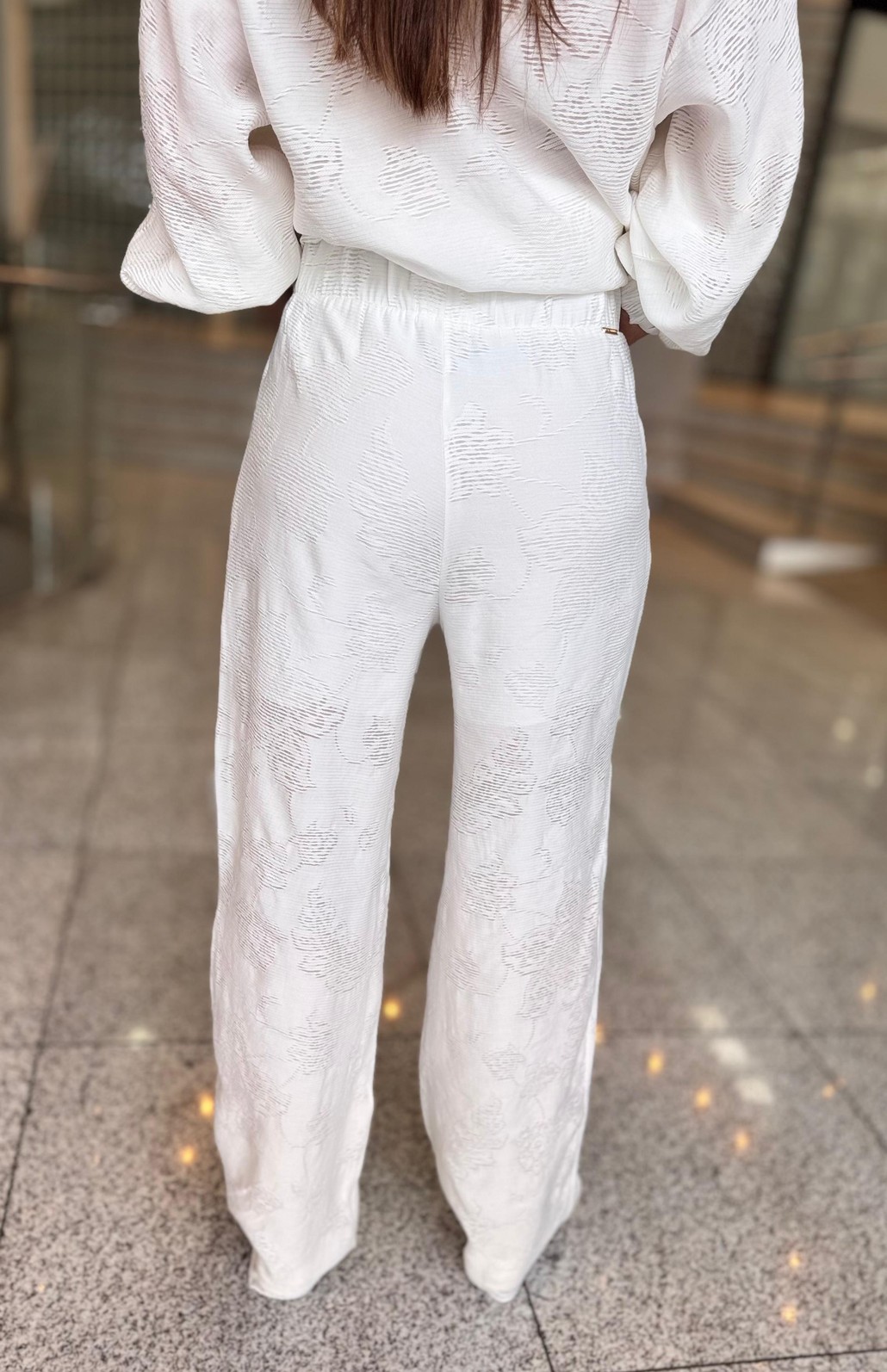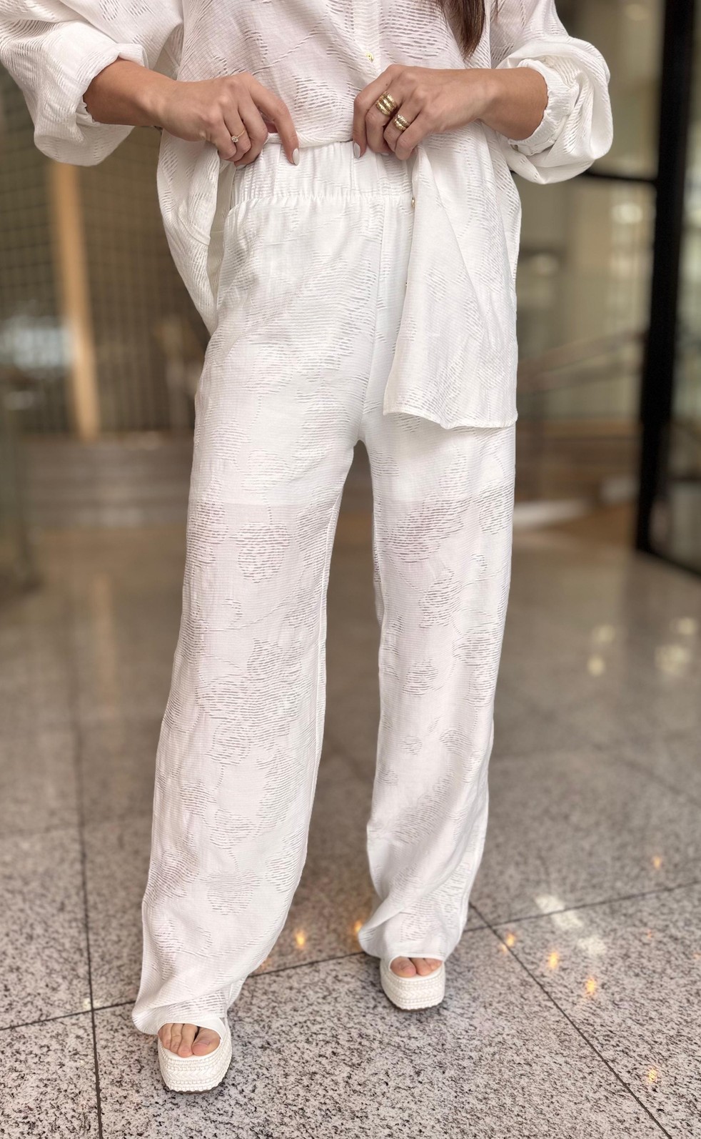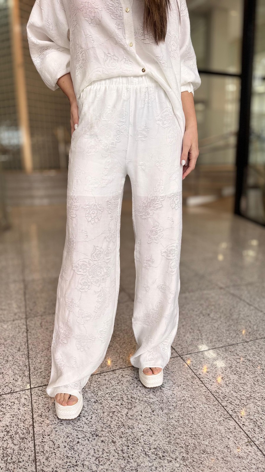 Confeccionada em tecido leve e macio, a calça apresenta modelagem reta que alonga a silhueta e garante caimento elegante. A transparência discreta adiciona um toque fashion e contemporâneo, mantendo a proposta sofisticada. Seu design clean e atemporal permite múltiplas combinações, do look monocromático chique com a camisa da mesma linha até produções mais urbanas com blazers ou tops estruturados.
