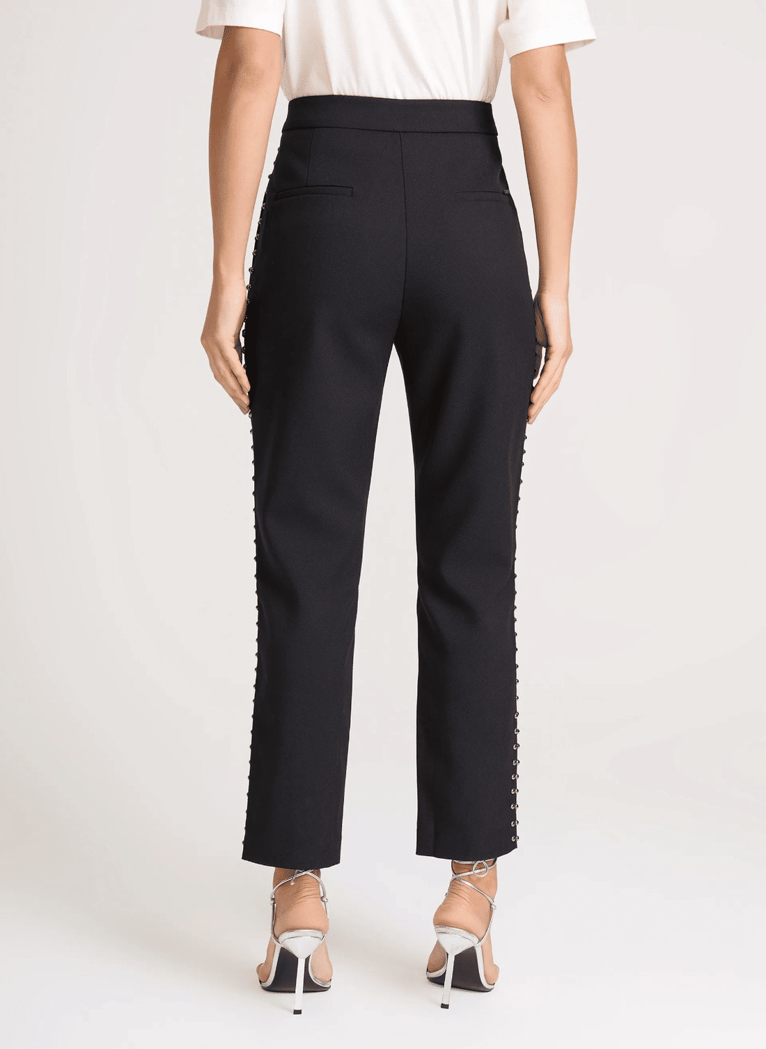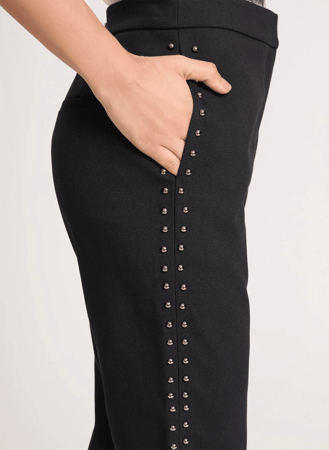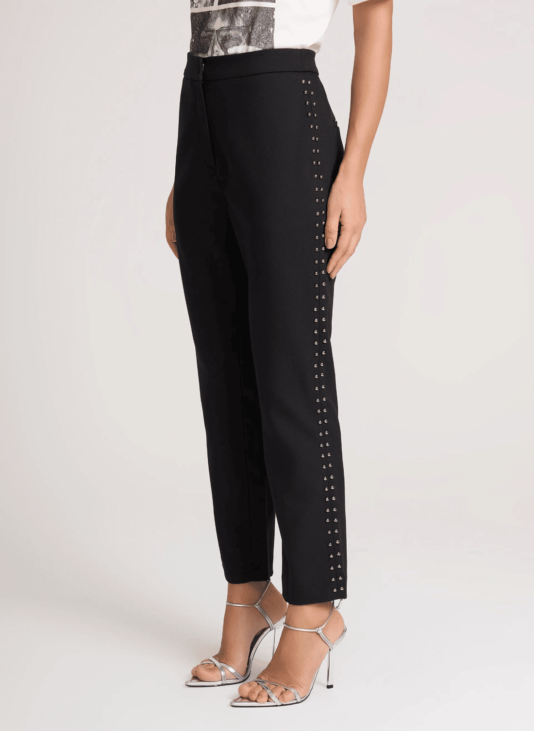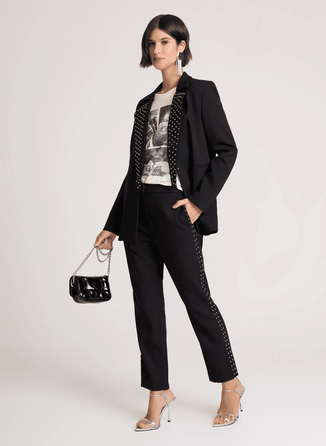 Confeccionada em tecido plano, a Calça possui modelagem justa, cós intermediário, fechamento frontal interno por ganho e zíper, tachas metalizadas aplicadas nas laterais da peça, bolsos frontais e posteriores e acabamento pespontado.
