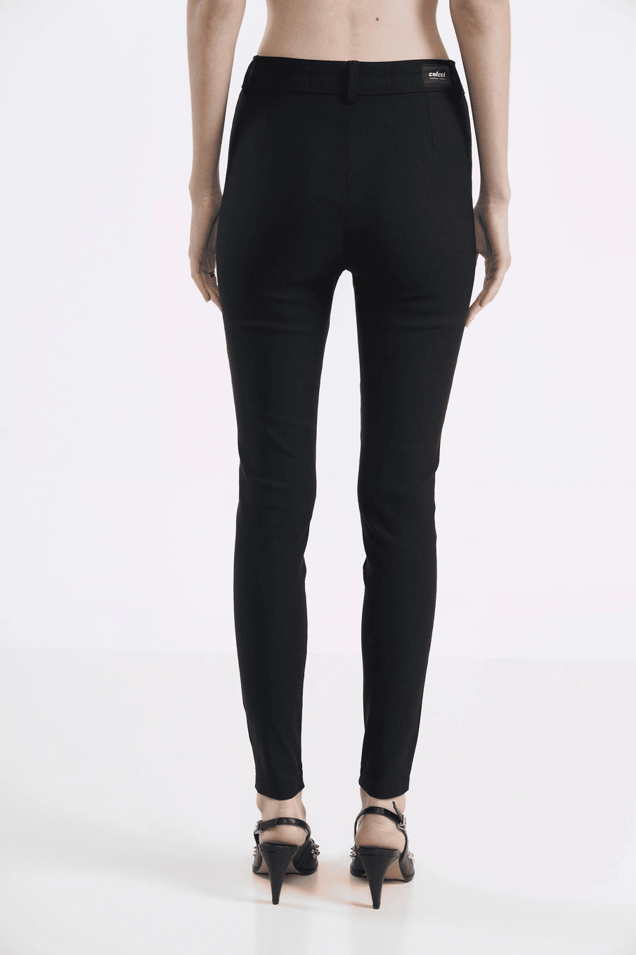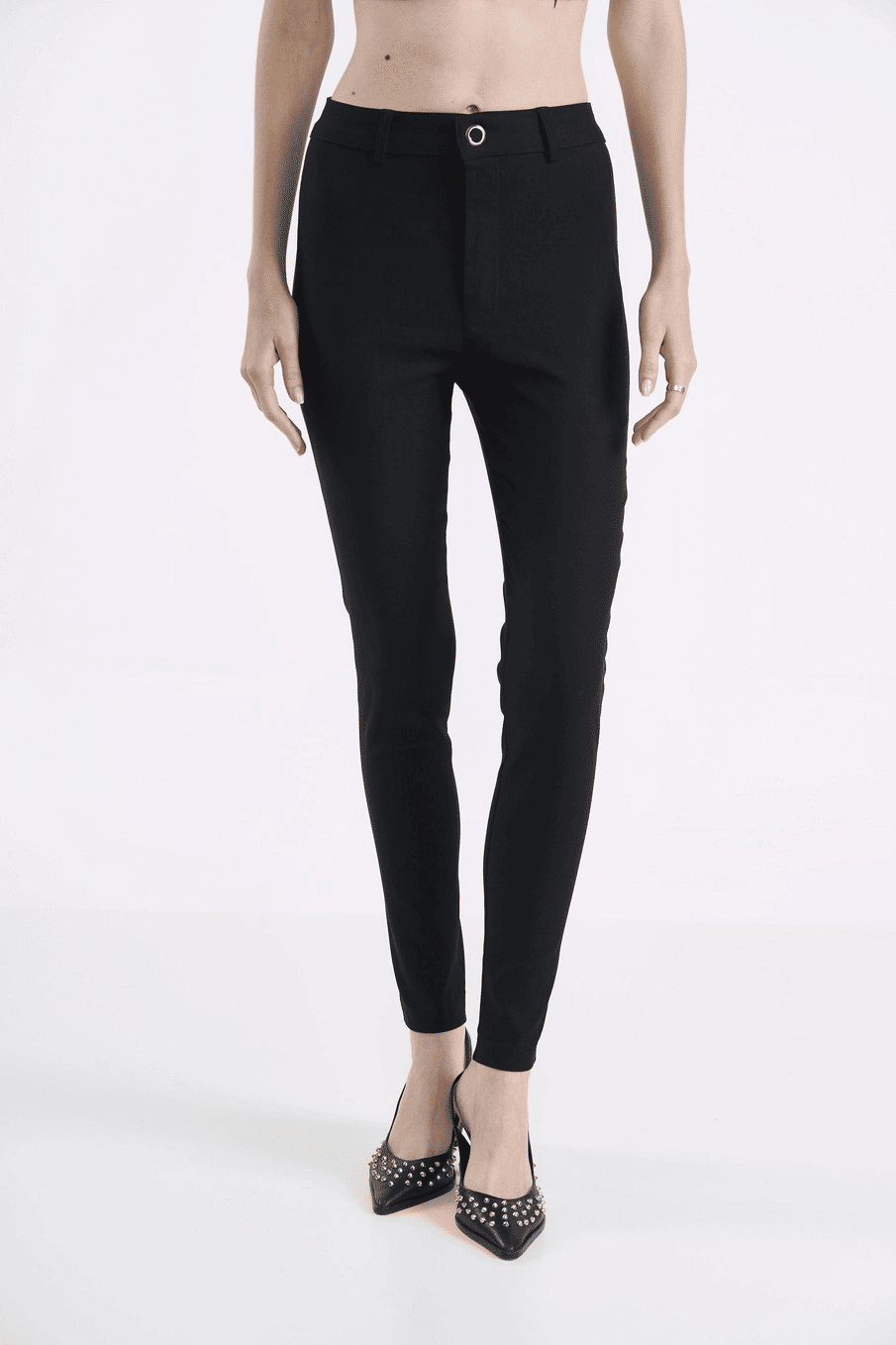 Design: Modelagem skinny ultra ajustada (second skin) com cintura alta estruturada, que alonga a silhueta e valoriza as formas femininas.