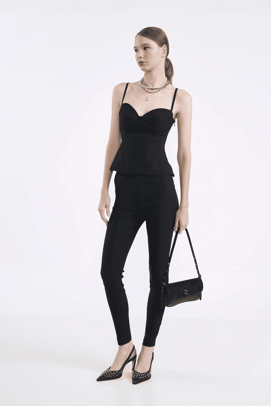 Aposte no look 'Total Black' combinando a calça com a Blusa Corset Peplum para uma produção monocromática imponente e extremamente sensual.Traga a essência punk-chic da coleção utilizando scarpins de bico fino com detalhes metálicos e um mix de colares de correntes.Para um visual urbano e sofisticado de dia, sobreponha com um blazer de alfaiataria oversized e finalize com uma bolsa de estrutura marcante.