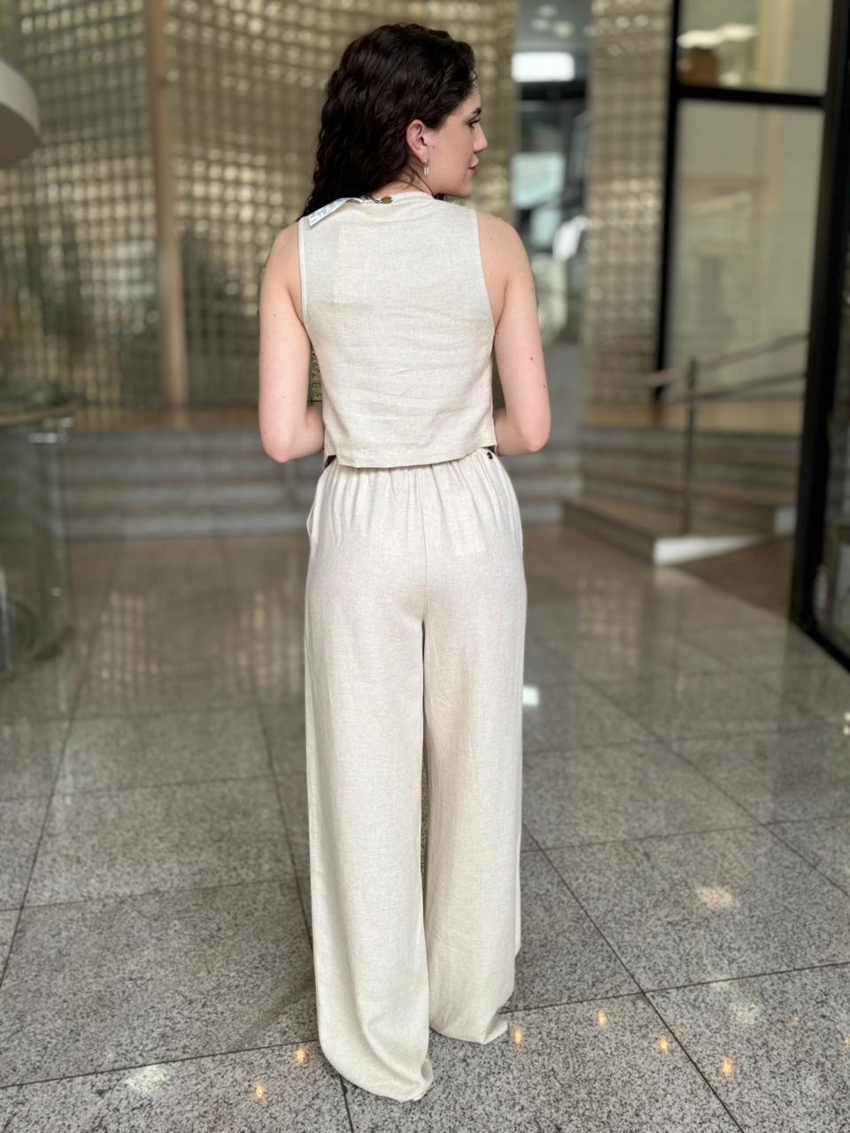 Confeccionada em tecido de linho misto, a calça possui caimento fluido e toque macio. O cós alto com elástico embutido oferece ajuste confortável e praticidade, enquanto a modelagem wide leg cria um visual moderno e elegante.