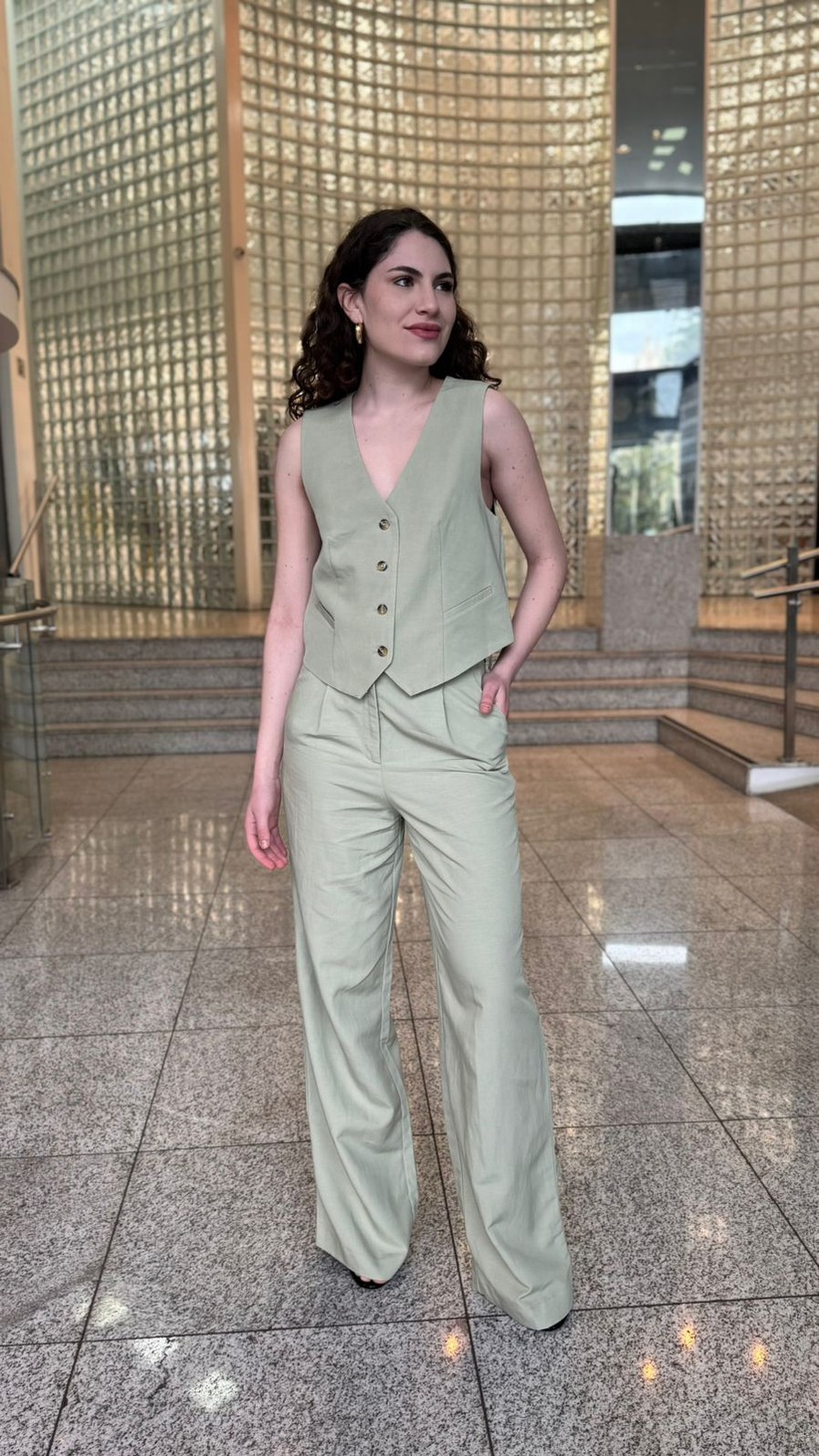 O tom verde alecrim traz leveza e personalidade, funcionando como um neutro sofisticado que transita entre o office look e ocasiões descontraídas.