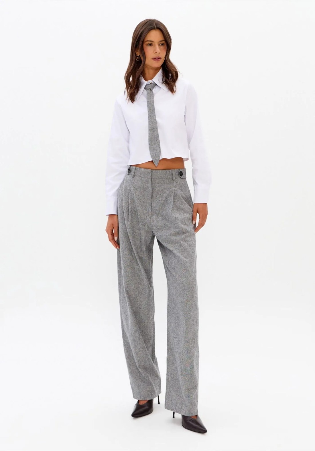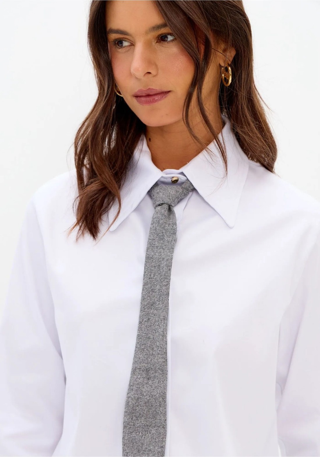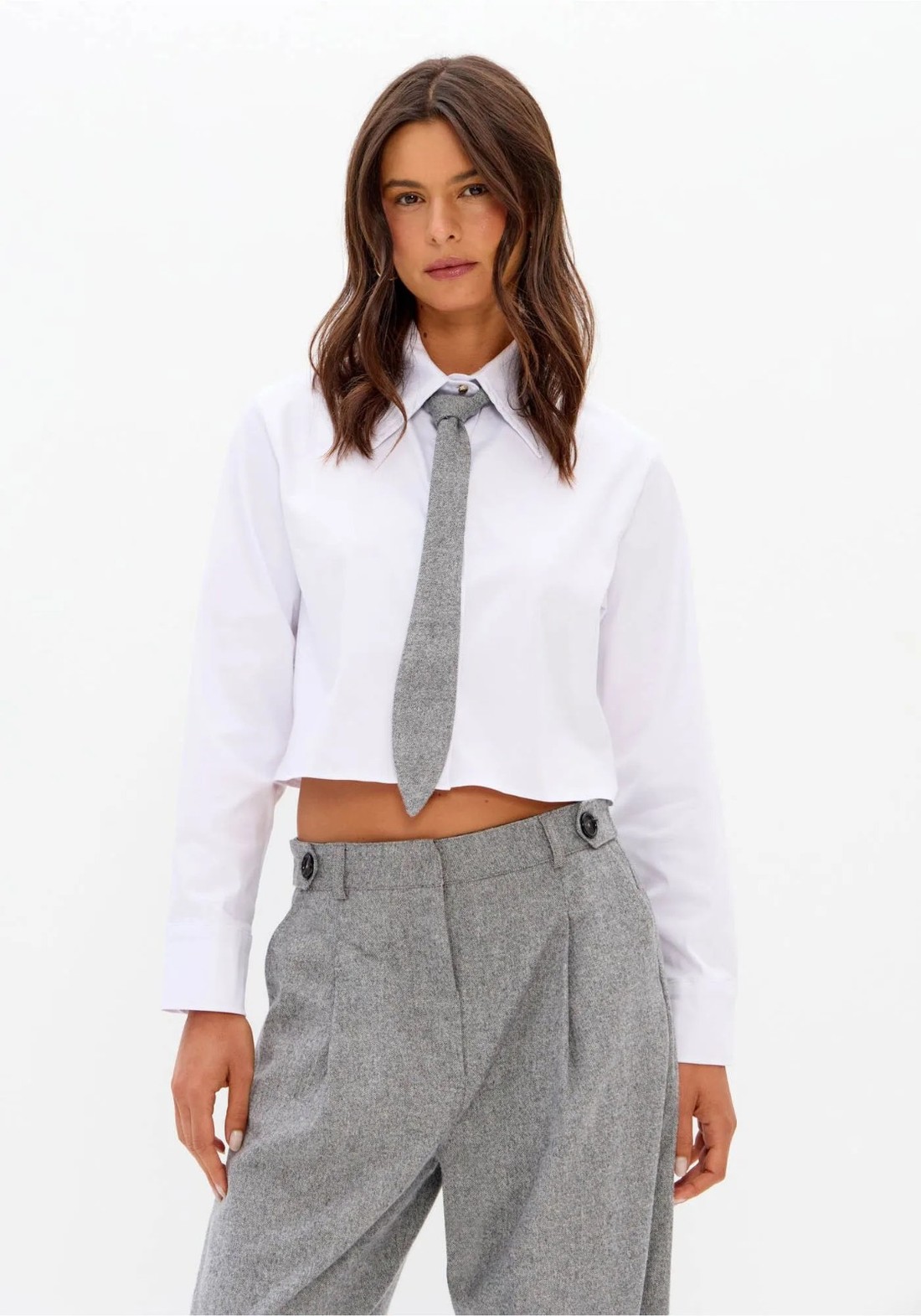 Elegante, a camisa cropped confeccionada em tricoline leve de algodão conta com mangas longas, gola tradicional e caimento solto no corpo. O fechamento por botões reforça o estilo clássico e a versatilidade da peça. Acompanha gravata com comprimento proporcional ao da camisa, elevando o visual com sofisticação.