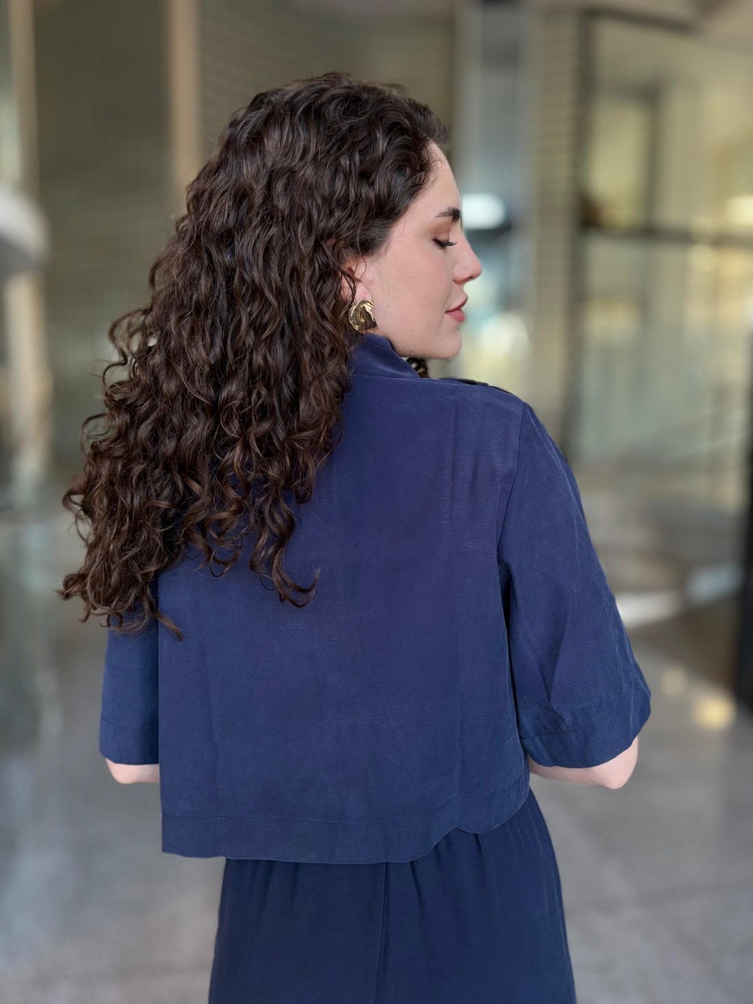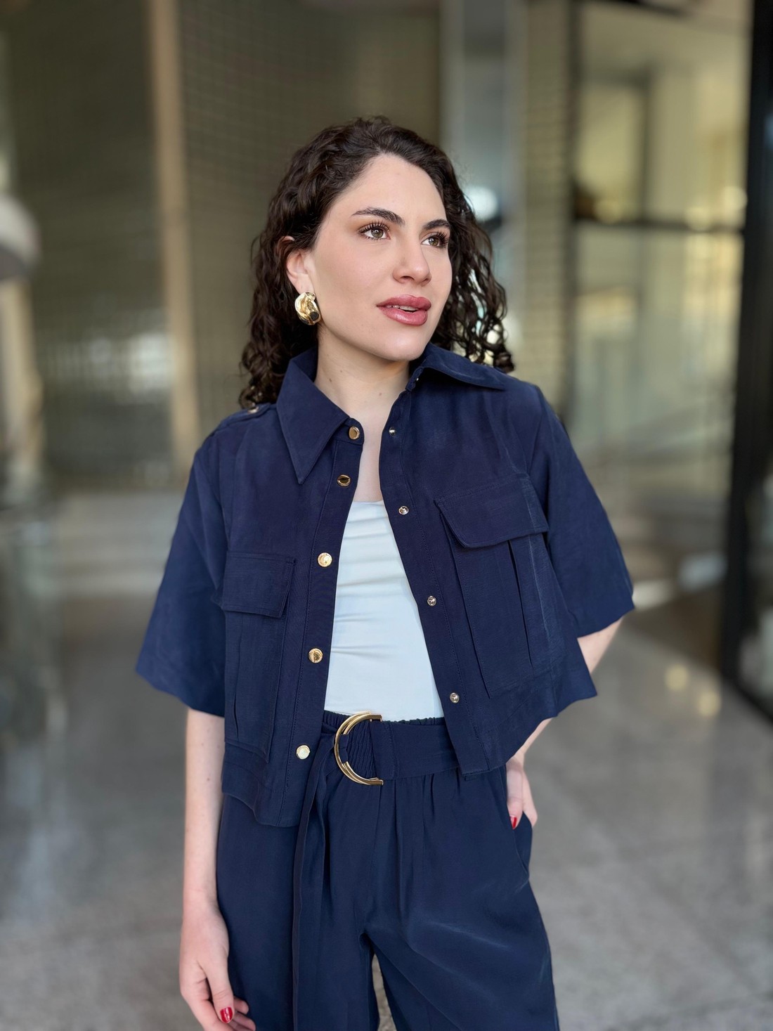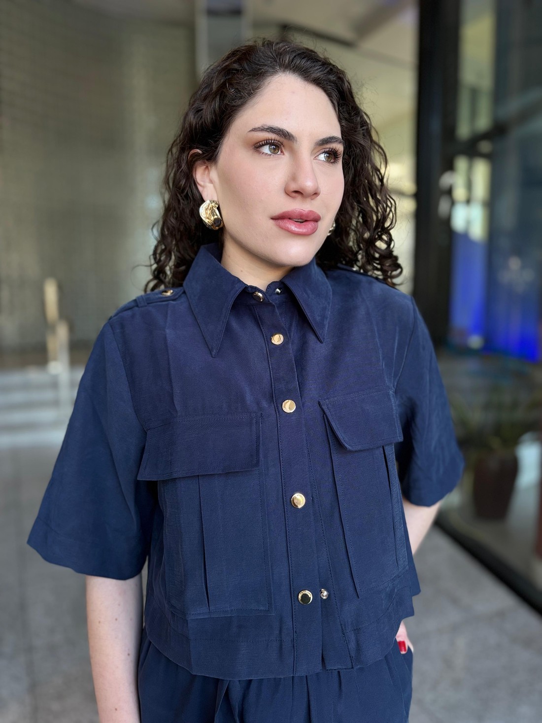 A camisa curta confeccionada em tecido plano leve se destaca pelos bolsos com lapela que trazem um toque utilitário ao visual. De caimento solto no corpo, exibe mangas curtas, gola clássica e fechamento por botões. Moderna e cheia de personalidade!