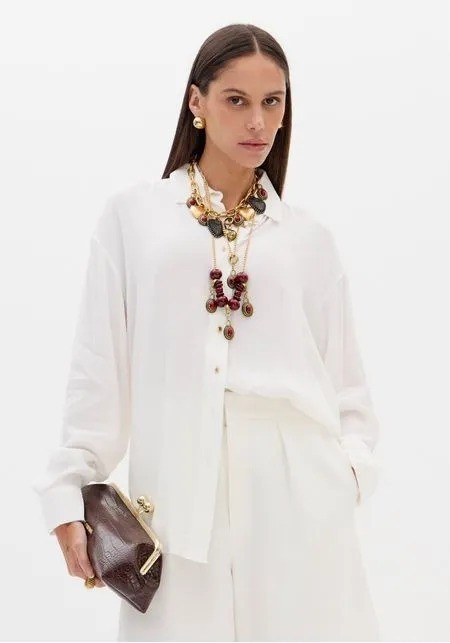 Produzida em tecido leve de viscose, a camisa apresenta modelagem tradicional, mangas longas, gola clássica e fechamento por botões. O caimento solto garante fluidez e leveza. Ideal para composições modernas que equilibram estilo e sofisticação!