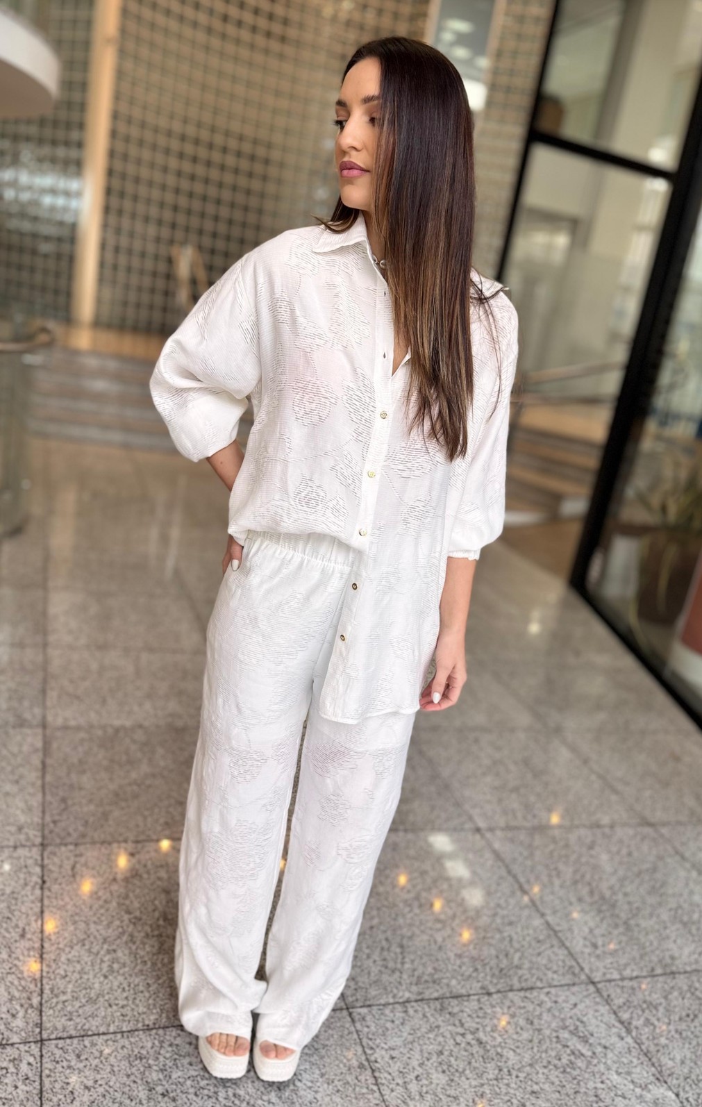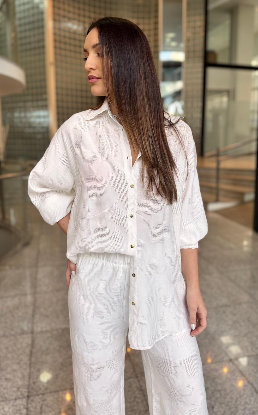 A Camisa Branca com Transparência Leve da Lança Perfume é a tradução da sofisticação contemporânea. Clássica e ao mesmo tempo moderna, ela combina a atemporalidade da camisa branca com um toque sutil de sensualidade, trazendo frescor e leveza para o visual. Uma peça que transita facilmente entre o office look elegante e produções noturnas cheias de personalidade.