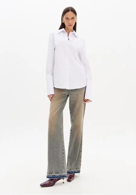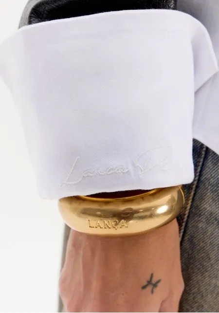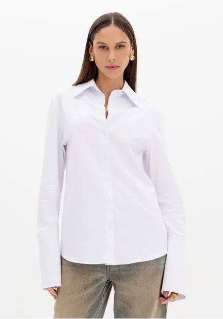 A camisa é feita em tricoline, um tecido de algodão leve e respirável. Com modelagem alongada, apresenta mangas longas, gola tradicional e fechamento por botões. O destaque fica para o bordado lança perfume no interior do punho que aparece ao dobrar e adiciona identidade ao visual.