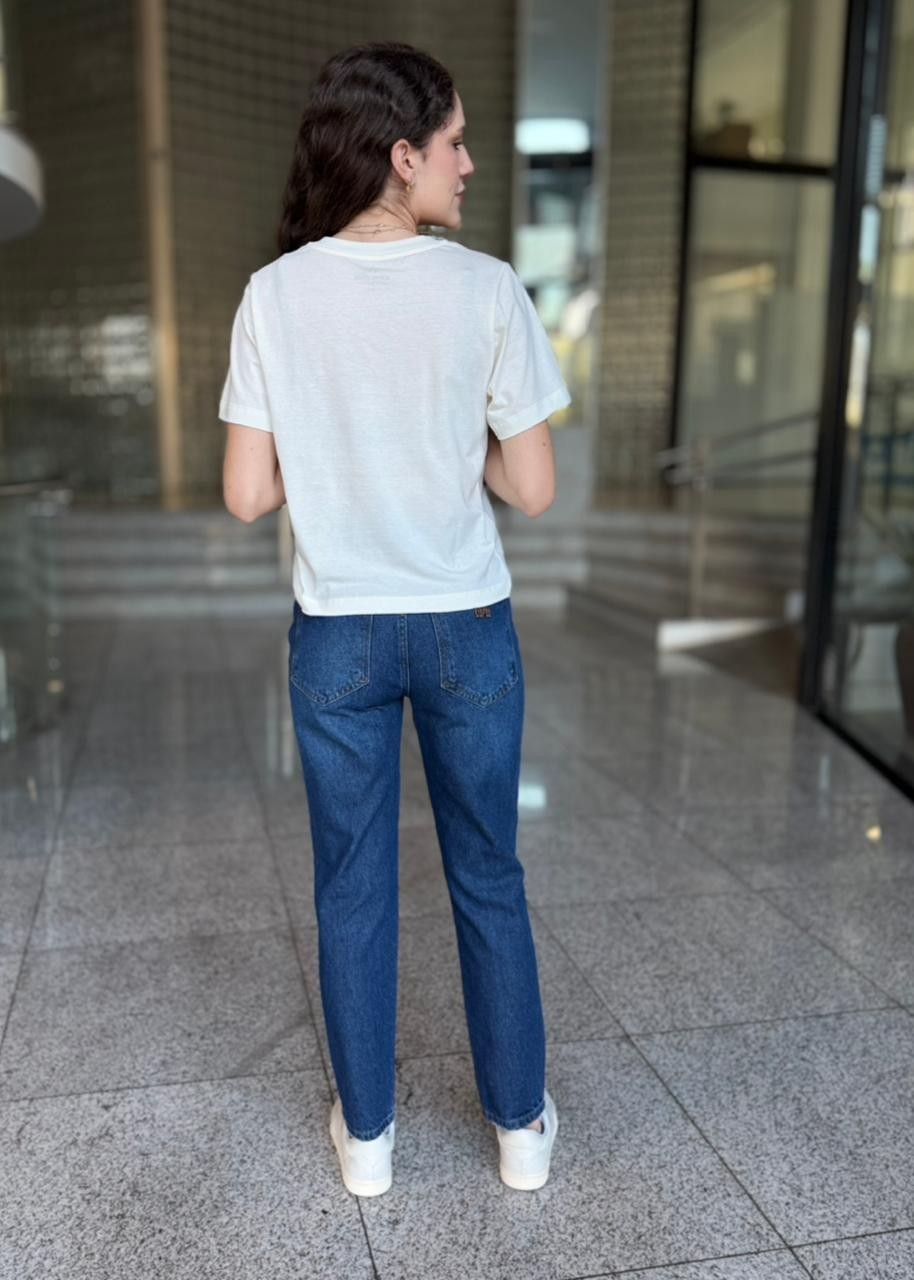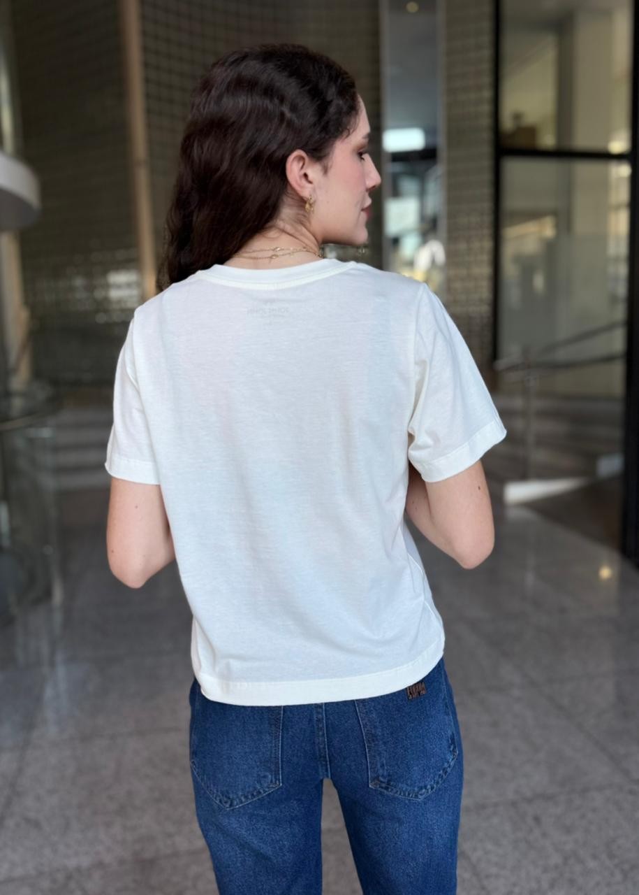 Confeccionada em malha, a Camiseta possui modelagem ampla, gola careca, estampa frontal, mangas curtas e acabamento pespontado. Cor: Off White