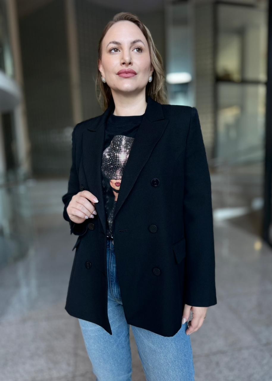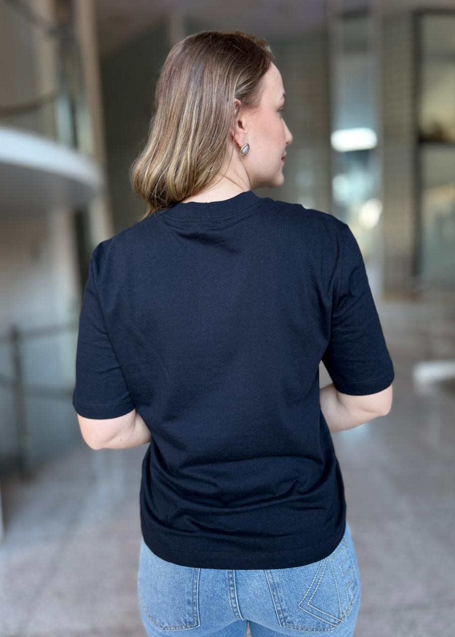 Confeccionada em malha, a Camiseta possui modelagem ampla, gola careca, estampa frontal com hot fix aplicados, mangas curtas e acabamento pespontado. Cor: Preto