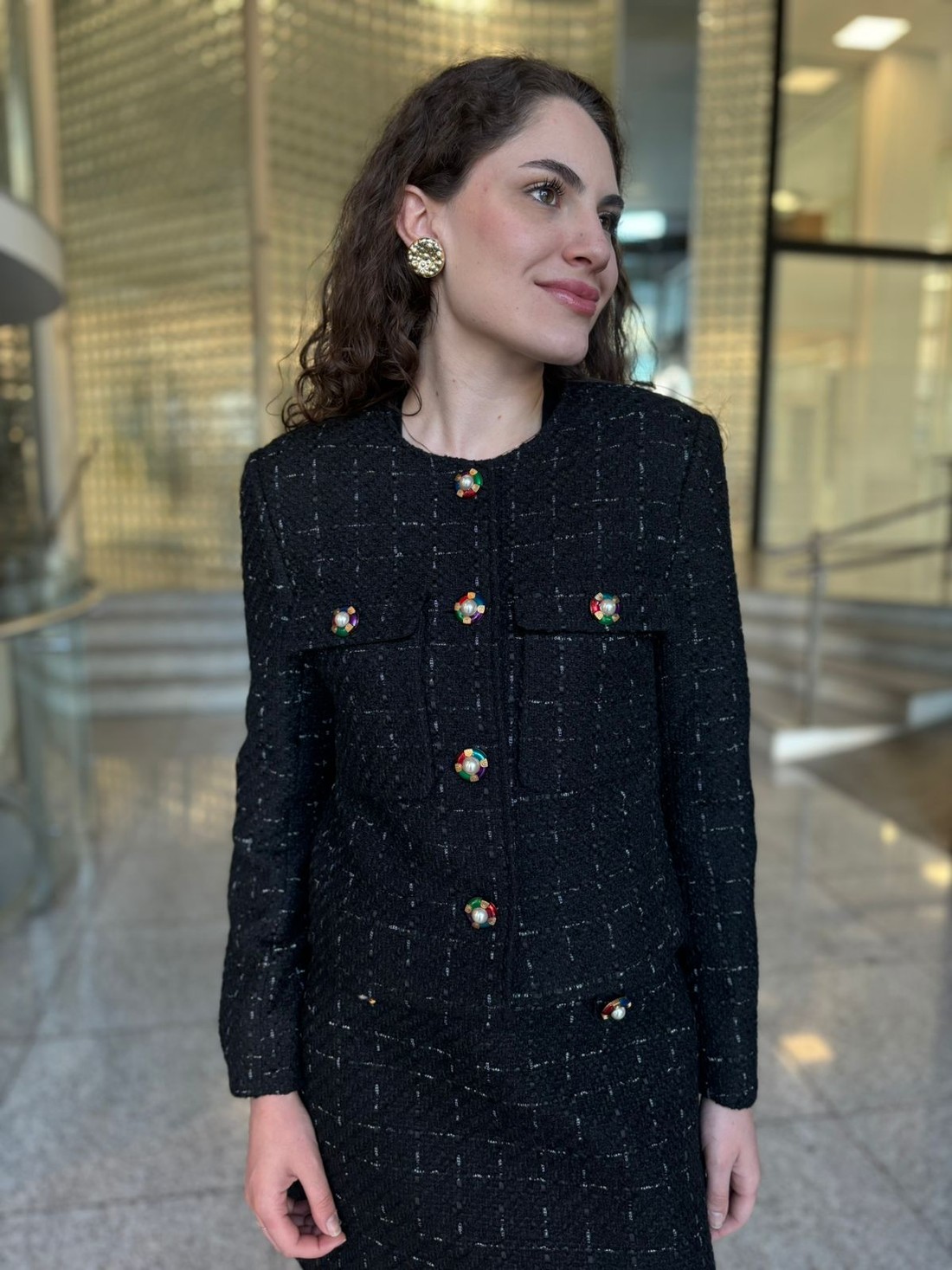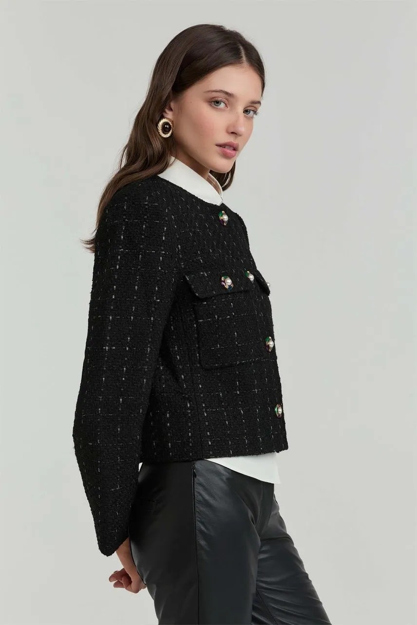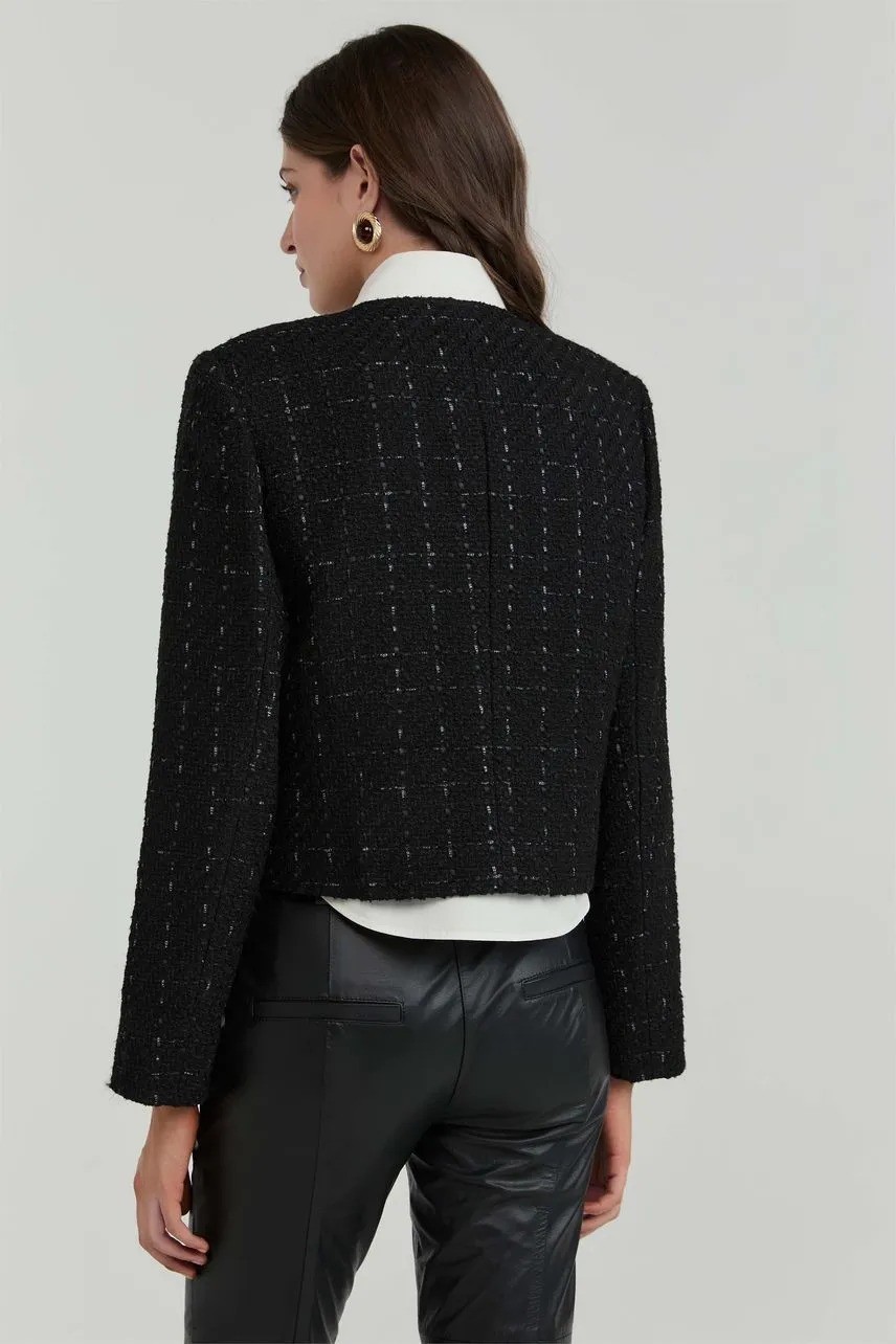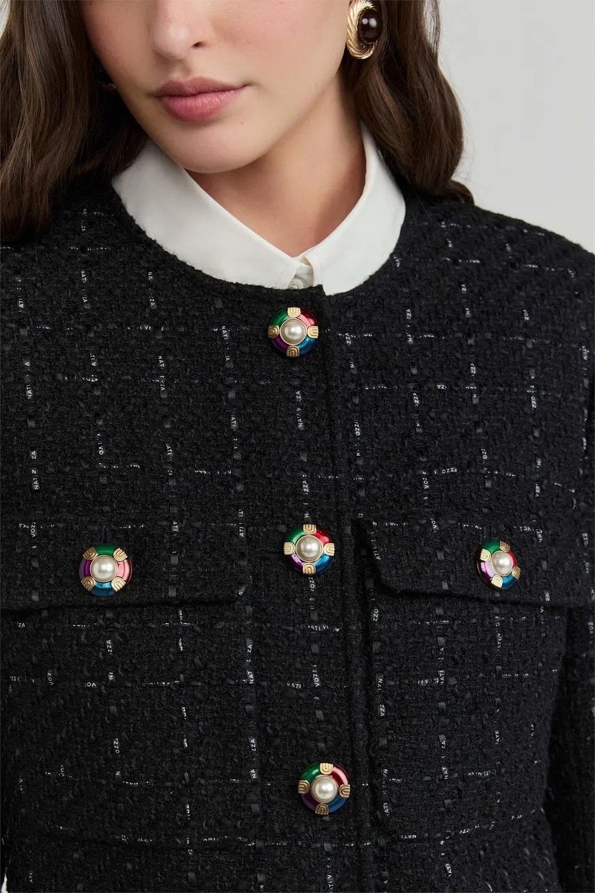 O casaqueto Natalia traz uma leitura clássica e sofisticada do tweed, com modelagem regular e comprimento curto que valorizam a silhueta. A textura encorpada confere estrutura à peça, enquanto a gola careca e os botões de metal reforçam o acabamento refinado. Versátil e atemporal, é ideal para compor produções elegantes, do trabalho a ocasiões especiais.