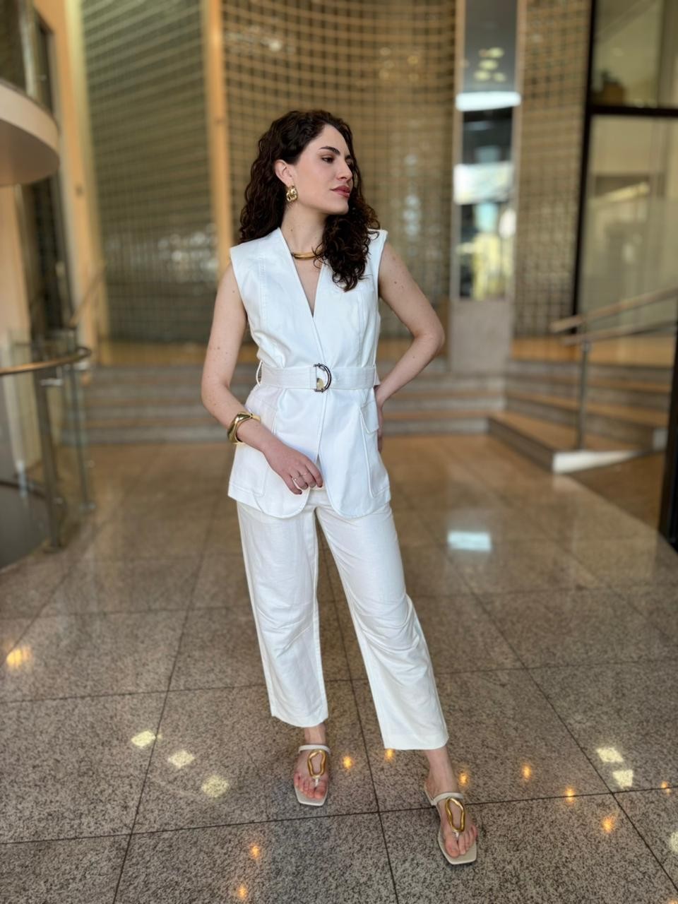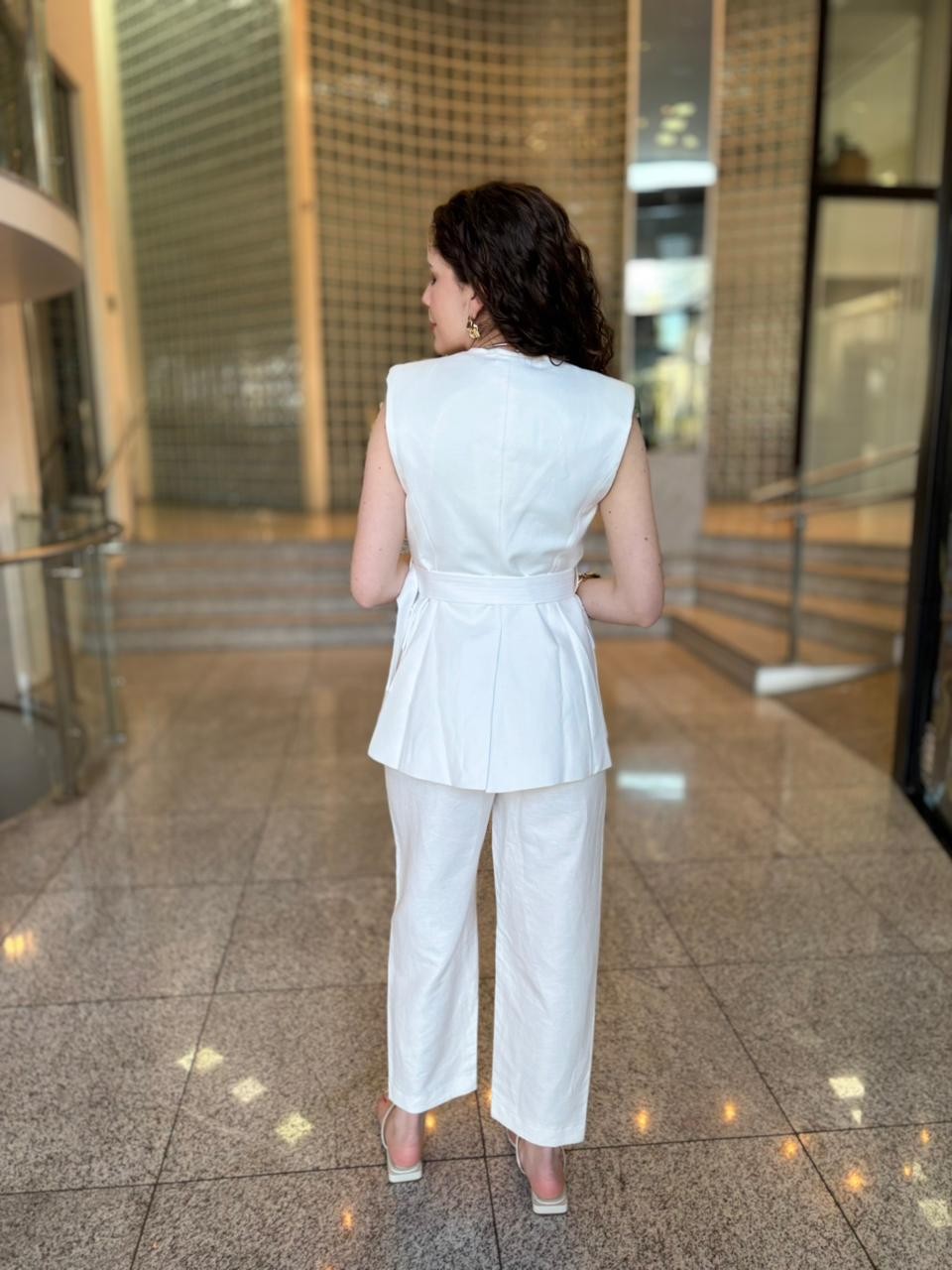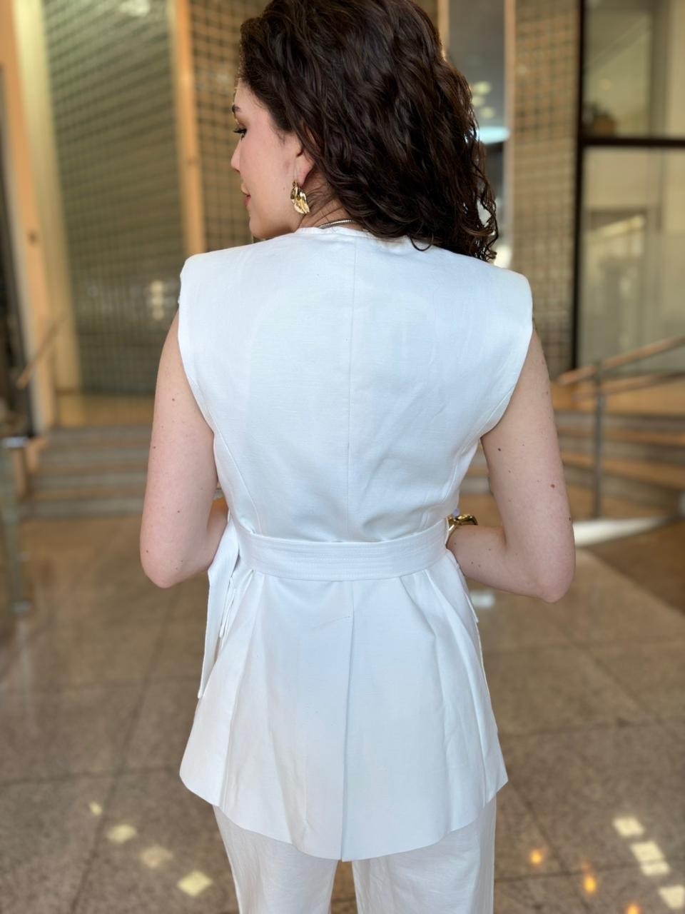 Colete sem mangas e sem gola. A peça apresenta ombreiras, abotoamento frontal, bolsos laterais com tampa, fenda nas costas e passadores na cintura com faixa removível. Um modelo autêntico que traduz personalidade e sofisticação.
