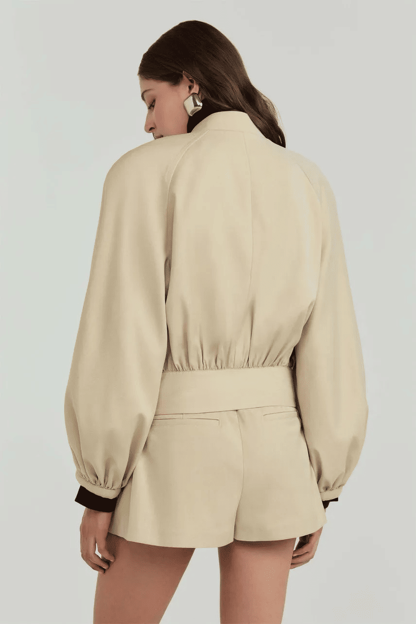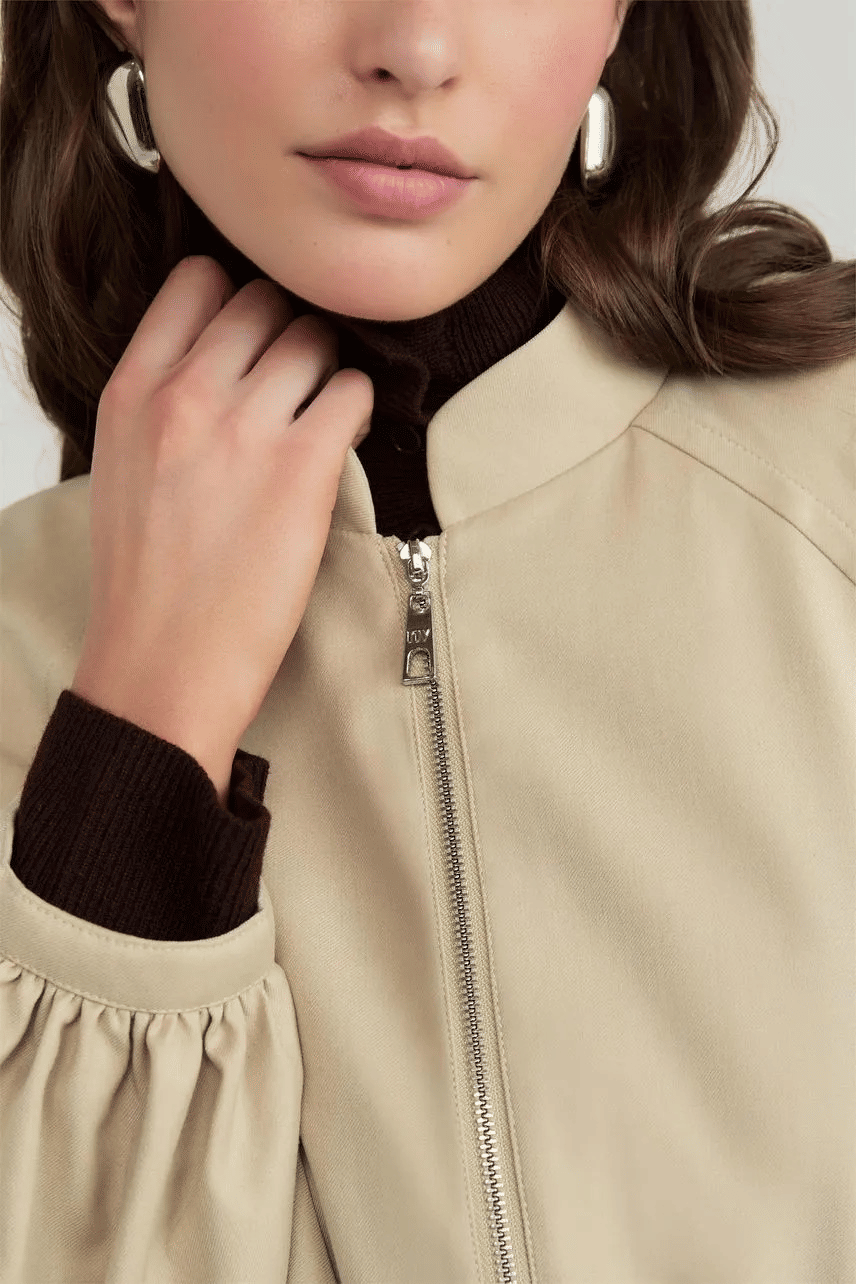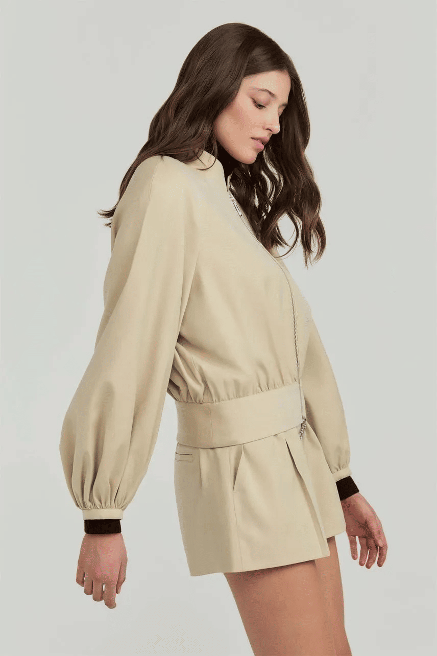Jaqueta confeccionada em alfaiataria, com modelagem acinturada e acabamento sofisticado. Possui manga longa, gola padre e fechamento por zíper de metal com cursor duplo, que traz funcionalidade e informação de moda à peça. A barra reta reforça o visual contemporâneo, tornando-a ideal para composições urbanas e elegantes, seja coordenada com peças de alfaiataria ou em contrastes com itens mais casuais.
