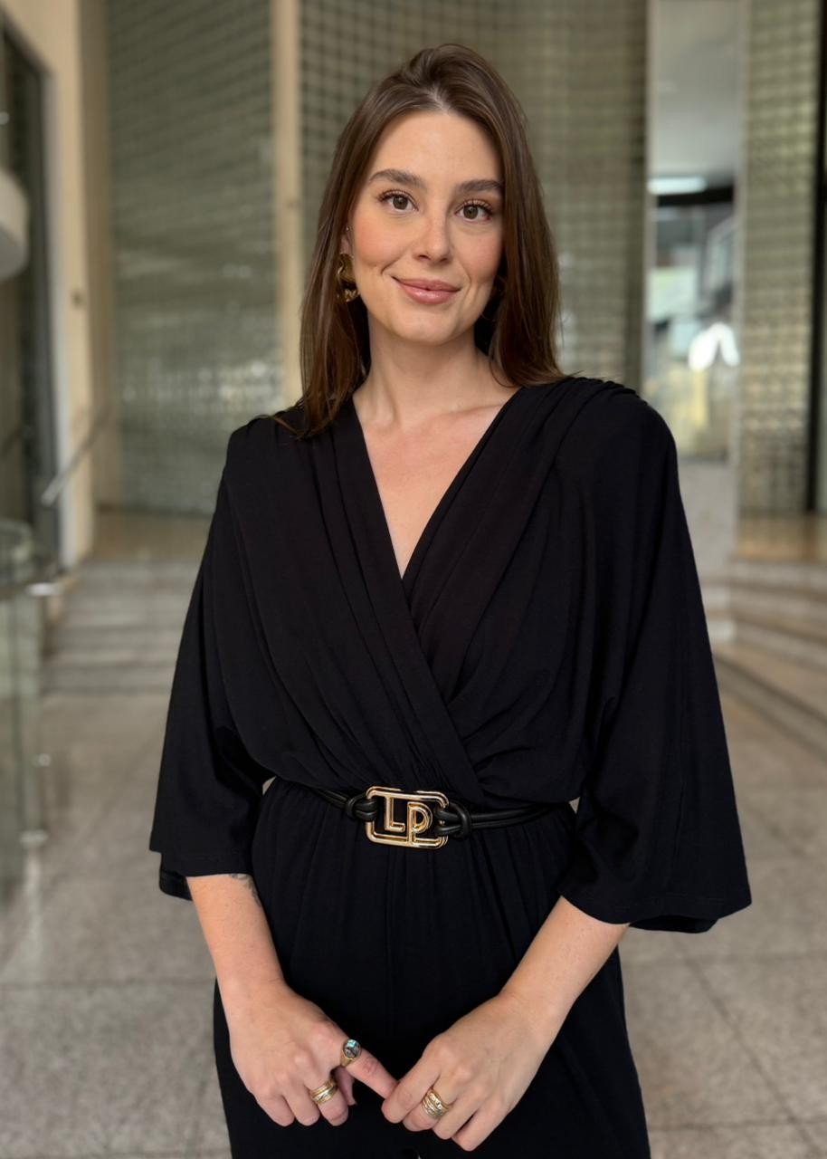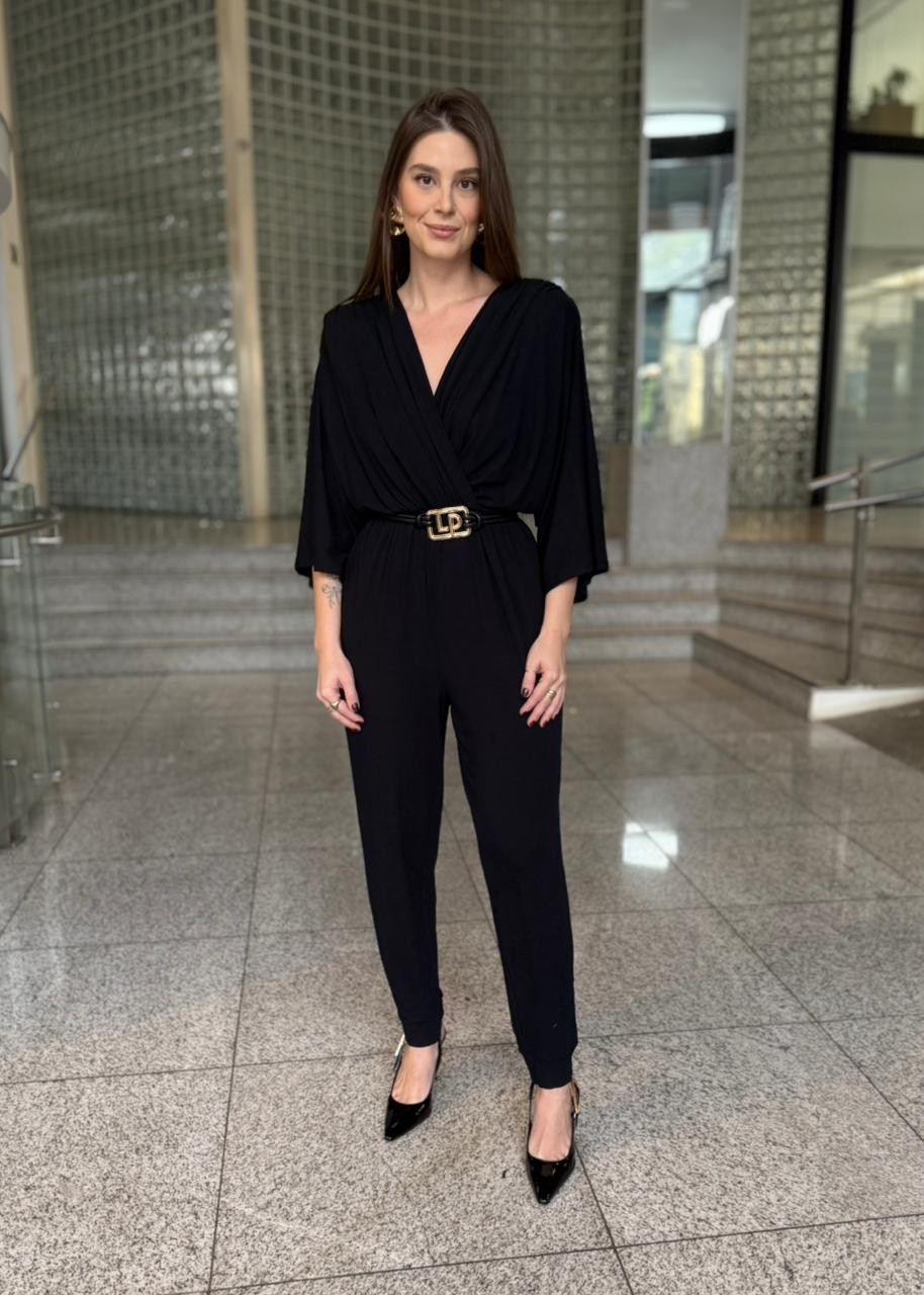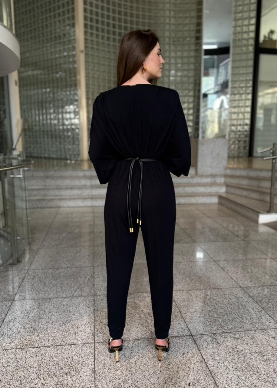 Confeccionado em tecido leve e fluido, possui decote transpassado que alonga o colo, mangas amplas que proporcionam caimento solto e confortável, além de modelagem jogging com barra levemente ajustada. O destaque fica para a cintura marcada com cinto, que define a silhueta e adiciona um detalhe sofisticado à peça.