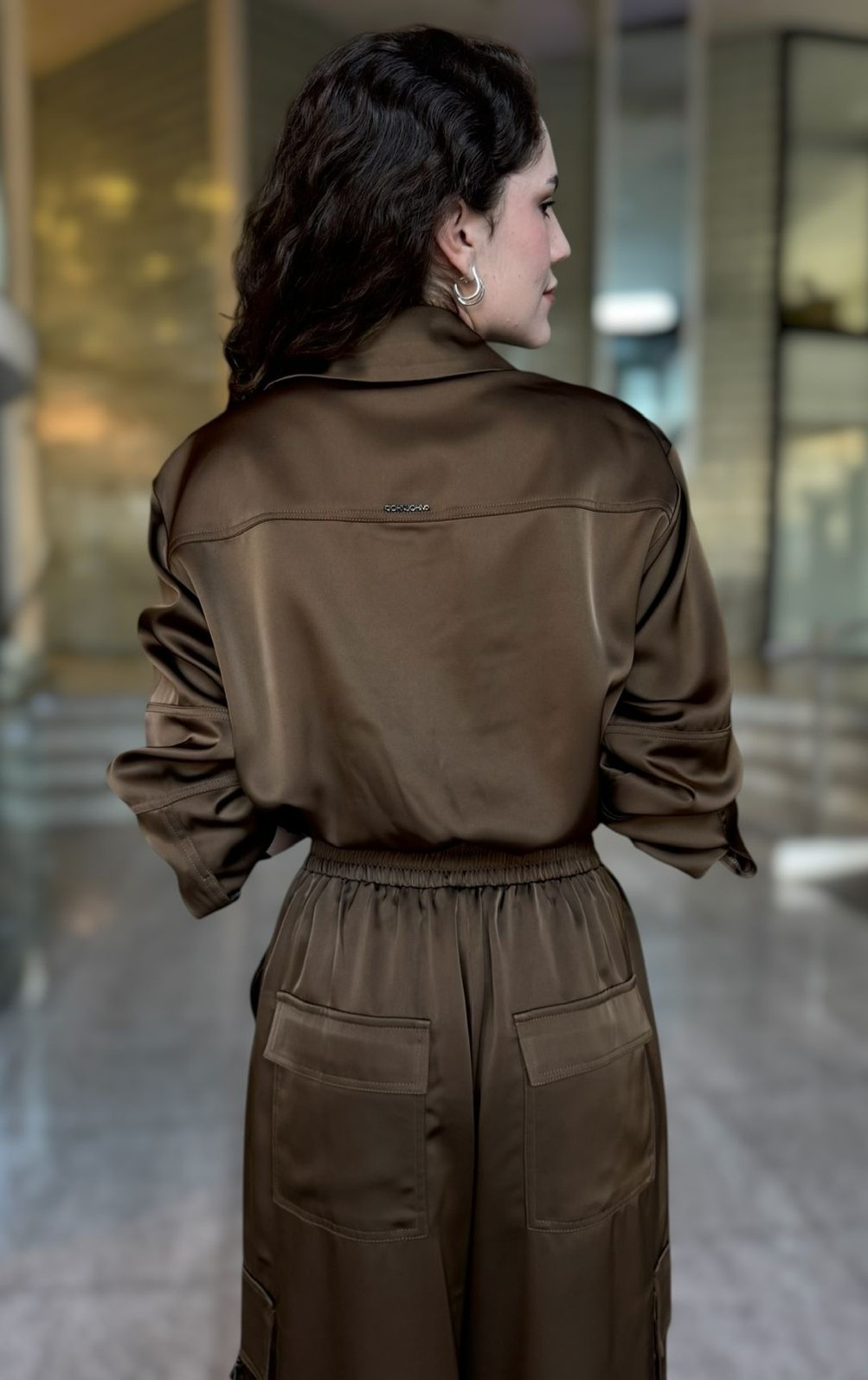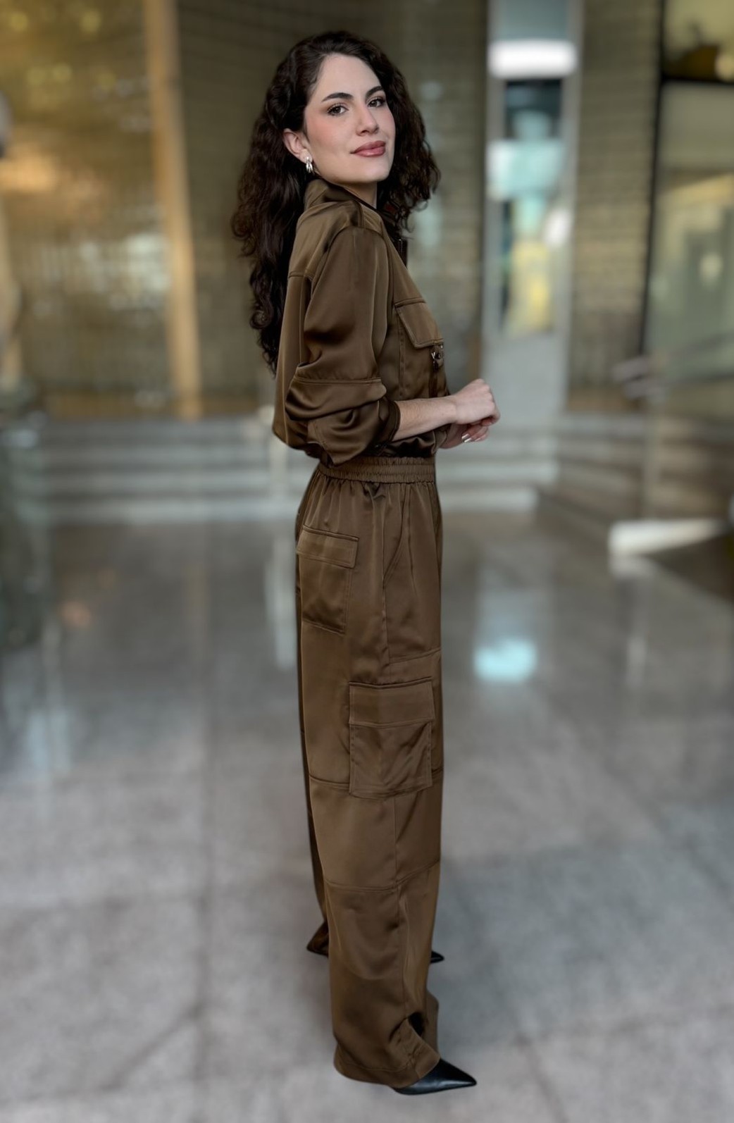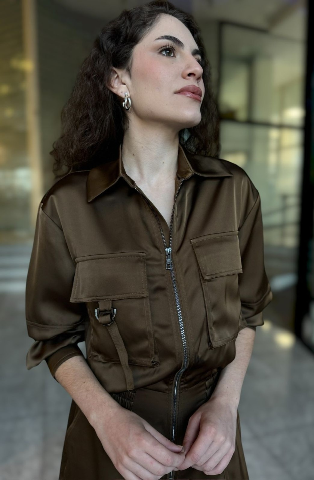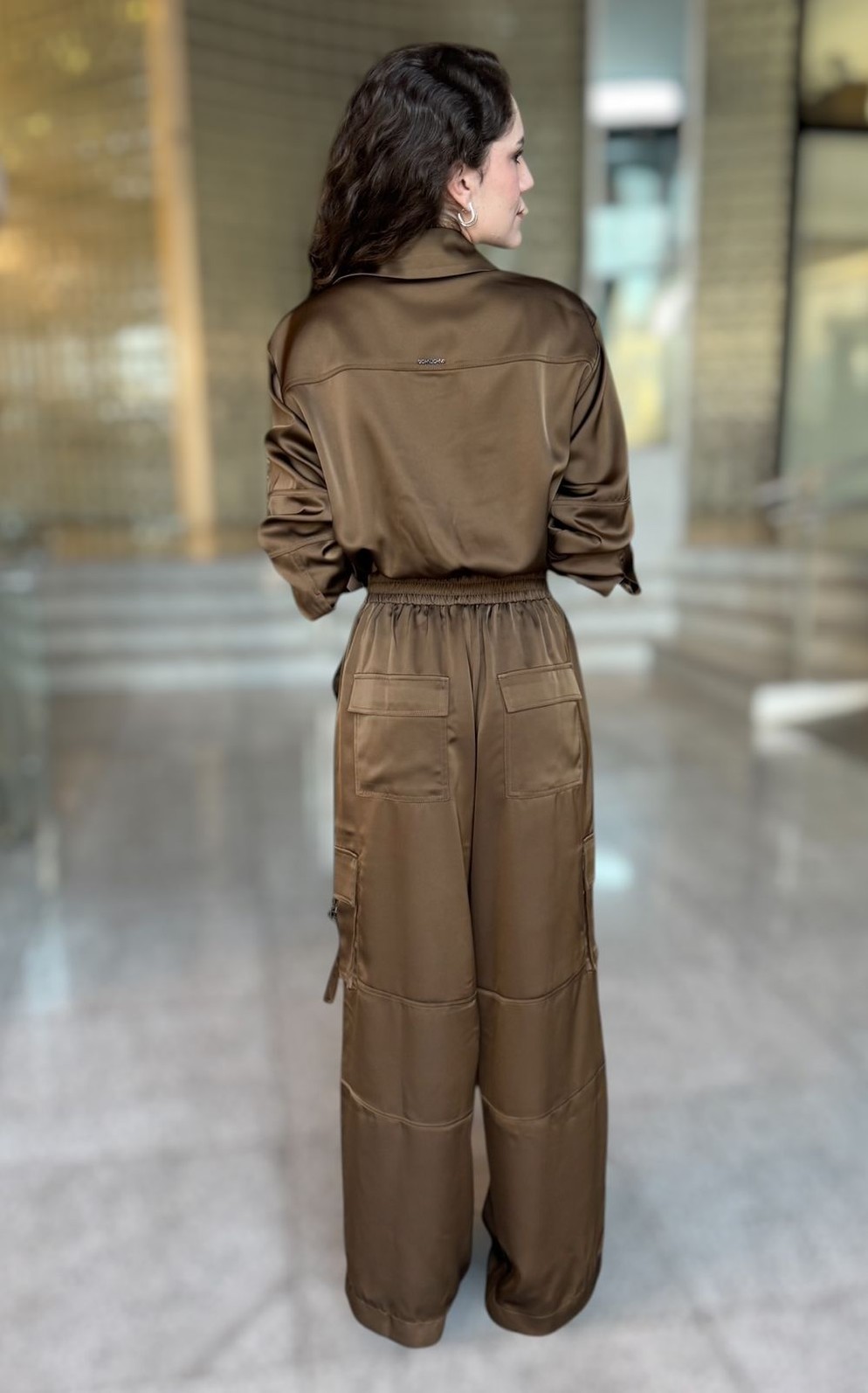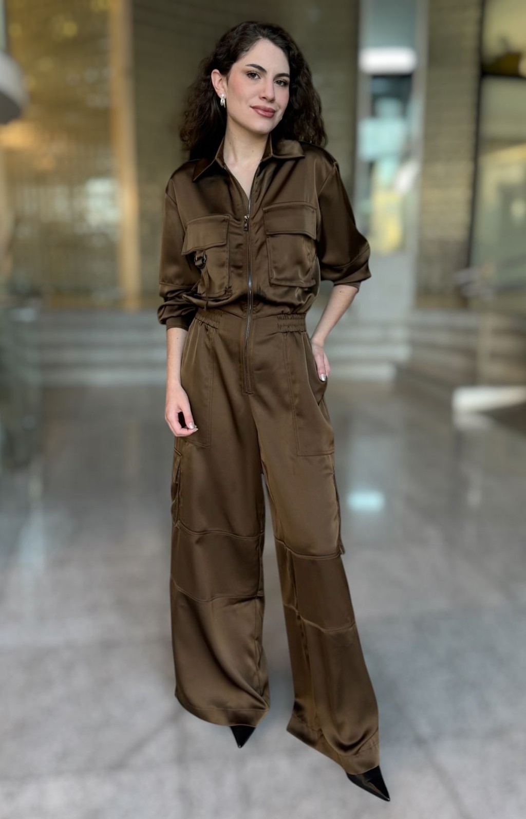 Confeccionado em tecido plano, o macacão possui modelagem ampla, gola, seis bolsos, detalhe de faixa do mesmo tecido aplicada, elástico na altura do quadril, fechamento frontal por zíper, plaquinha metalizada personalizada e acabamento pespontado.