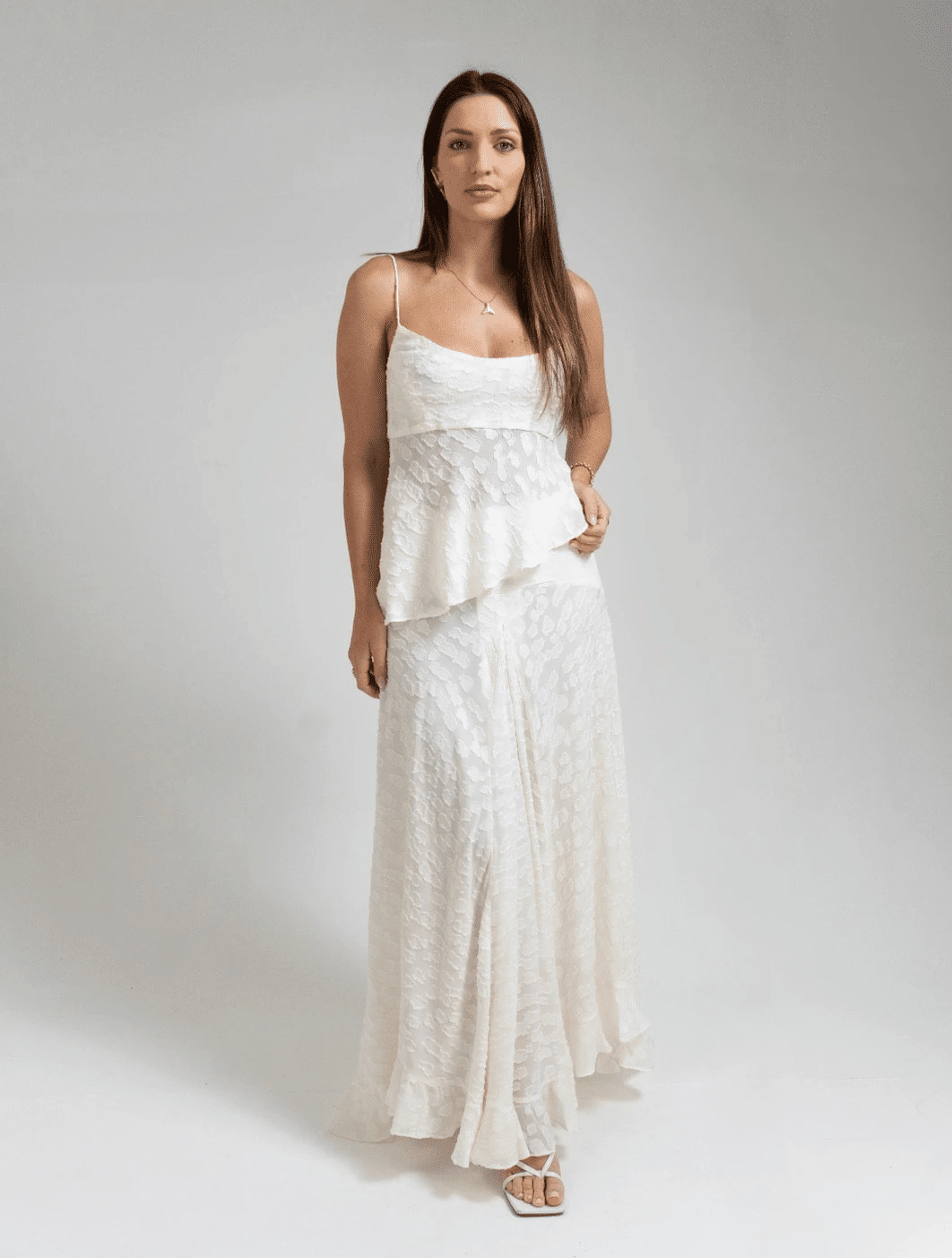 Confeccionada em jacquard fluido, a saia apresenta modelagem solta . Com textura delicada, fechamento lateral com ziper. A barra assimétrica adiciona movimento e um toque moderno ao visual.