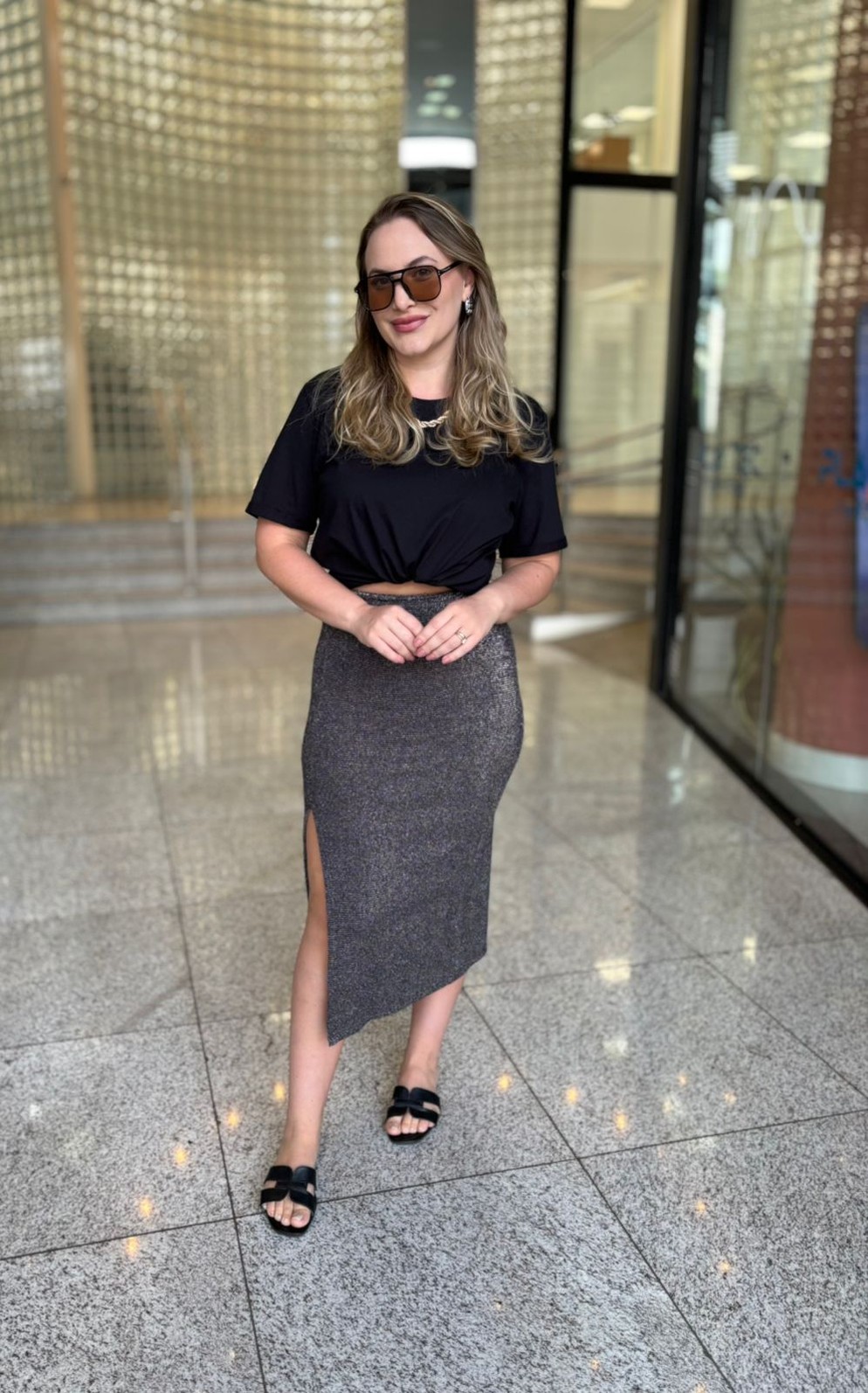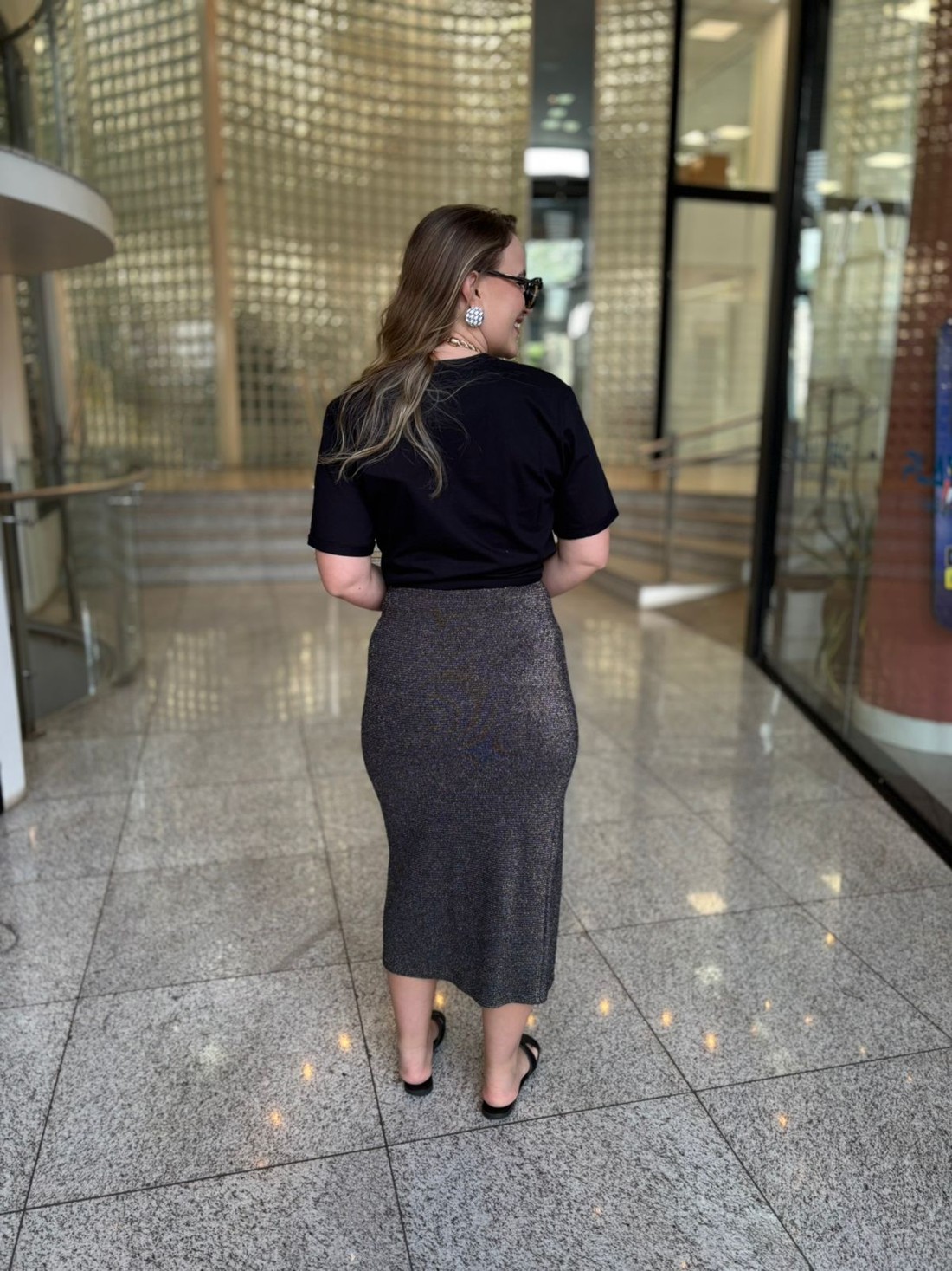 Confeccionada em tecido de lurex com caimento fluido e confortável, a saia possui comprimento midi que alonga a silhueta e fenda estratégica que valoriza as pernas com elegância. O design clean permite combinações versáteis — do mais glam ao urbano chic — sempre com um visual atual e refinado.