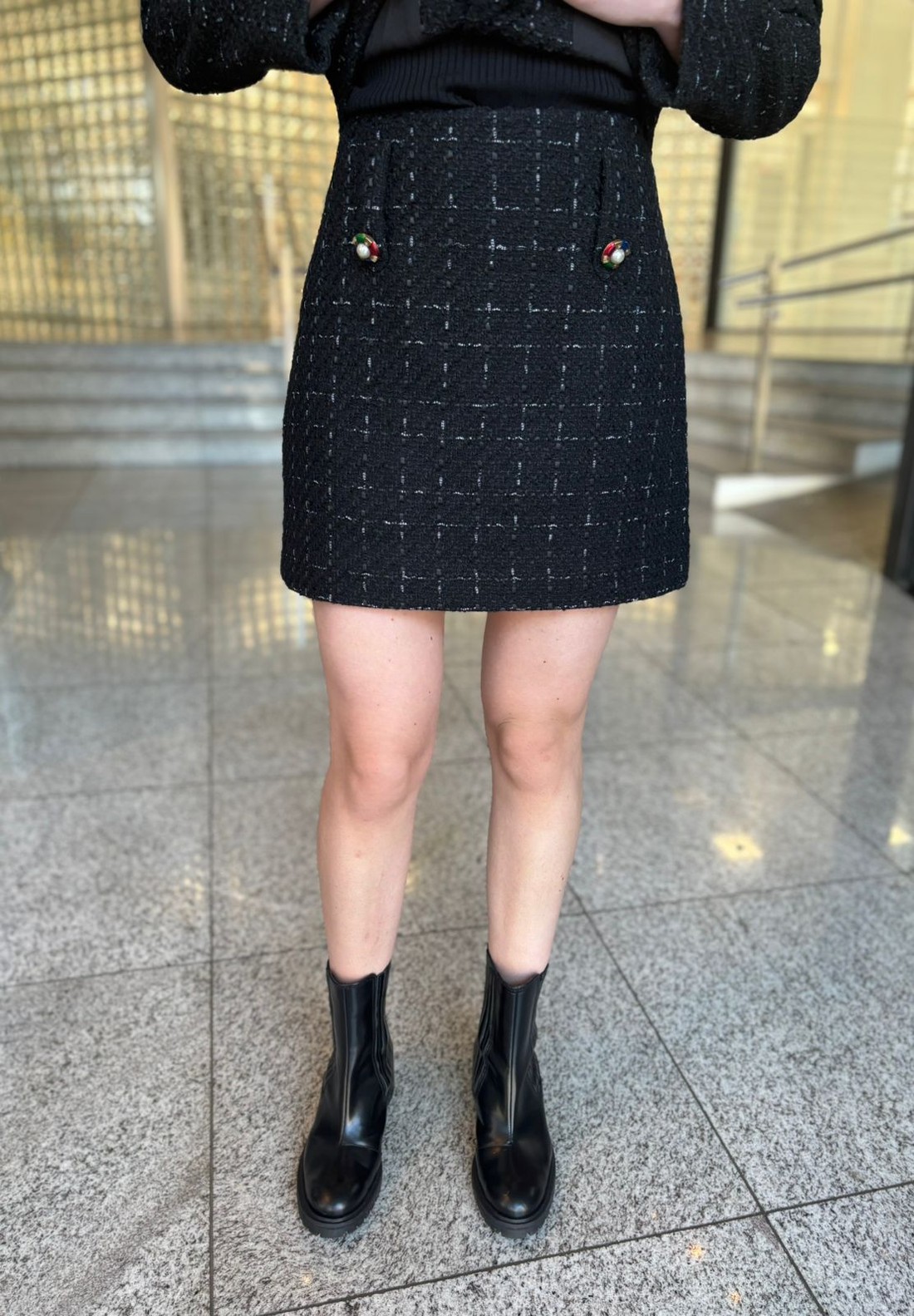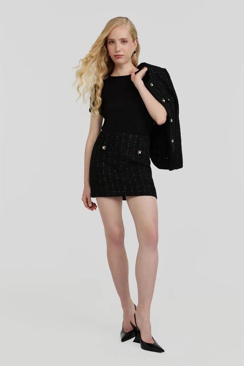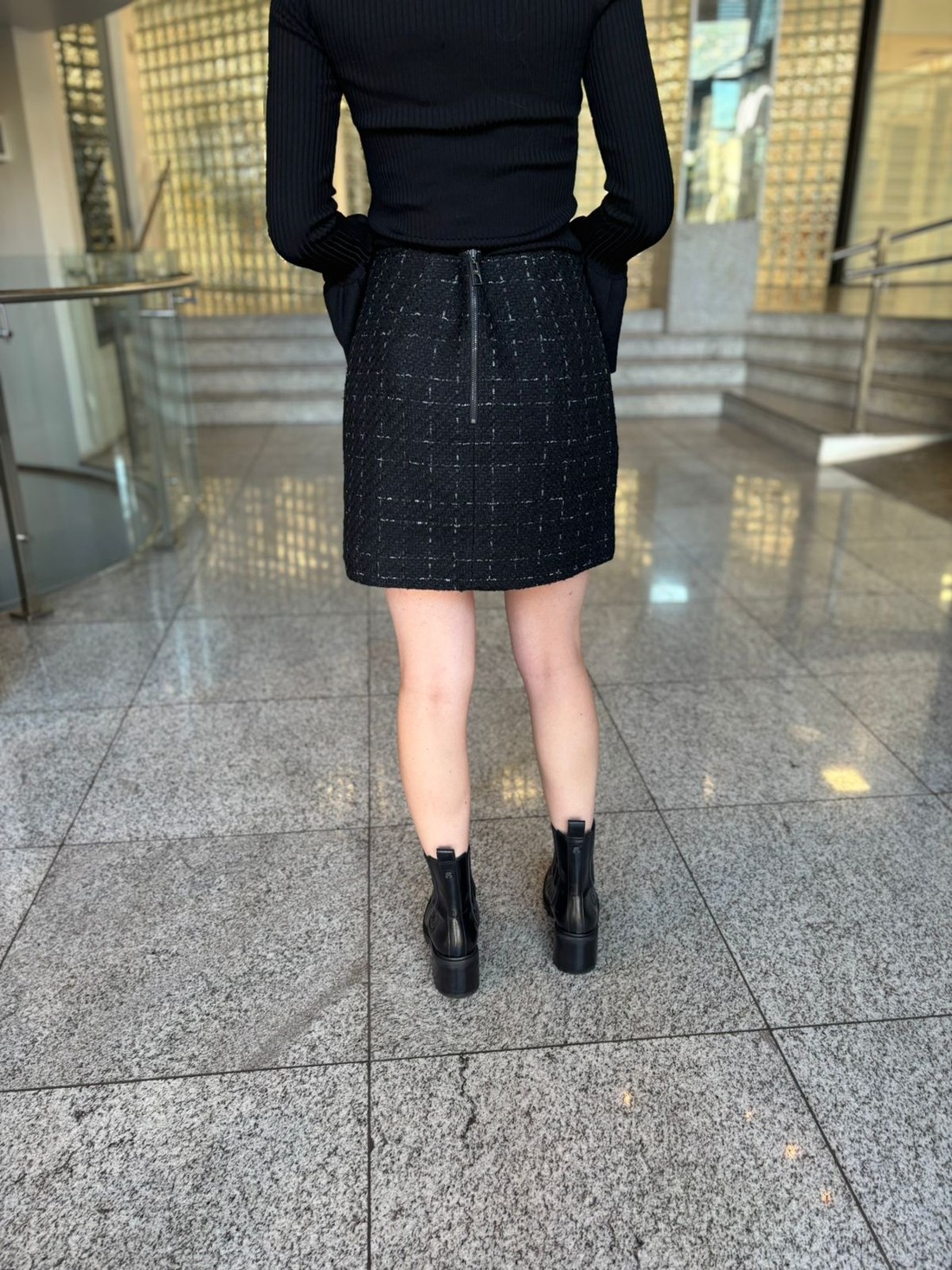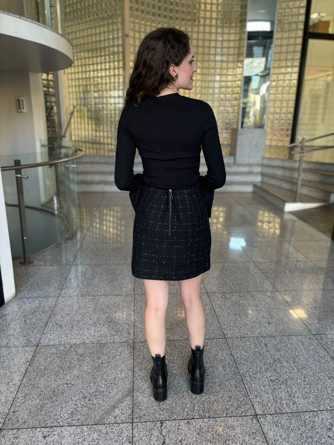 A saia Natalia traz uma proposta sofisticada e atemporal, confeccionada em tweed personalizado com textura marcante. Com modelagem reta, comprimento curto e cintura alta, valoriza a silhueta com elegância. O cós reto, a barra reta e o fechamento posterior por zíper de metal garantem acabamento refinado, enquanto o detalhe do botão especial no passante frontal adiciona informação de moda ao design, tornando a peça ideal para composições modernas e elegantes.