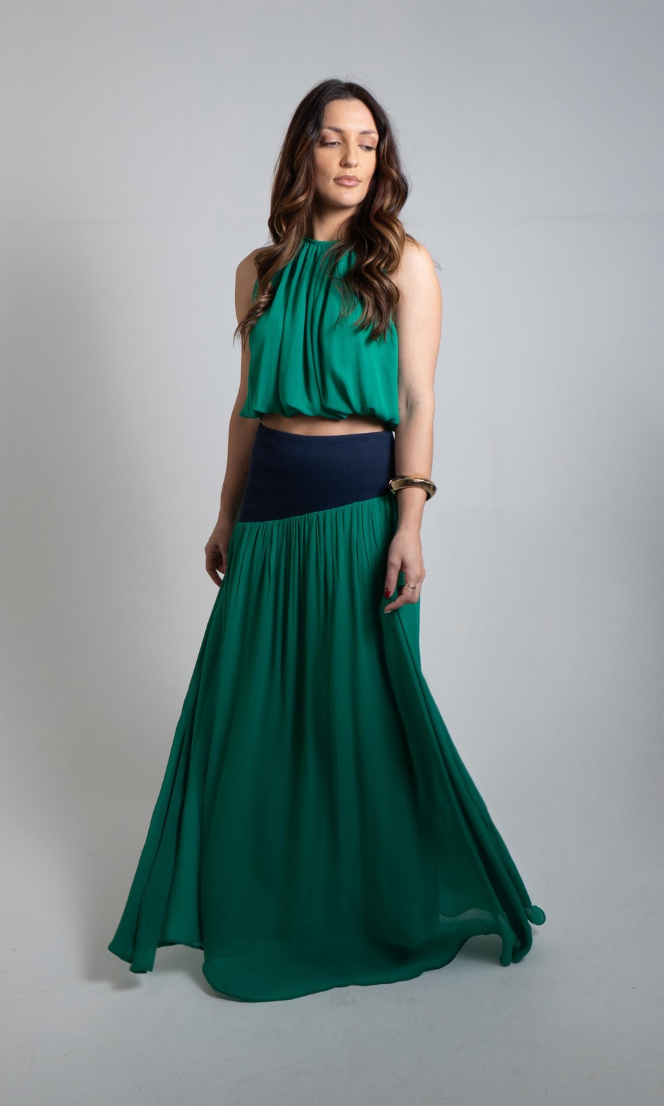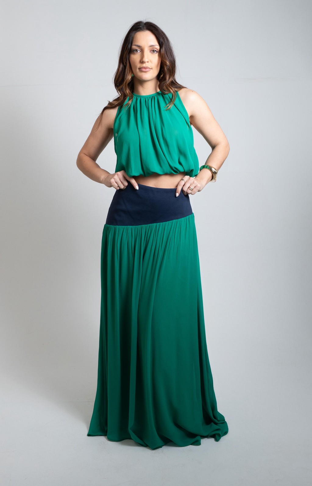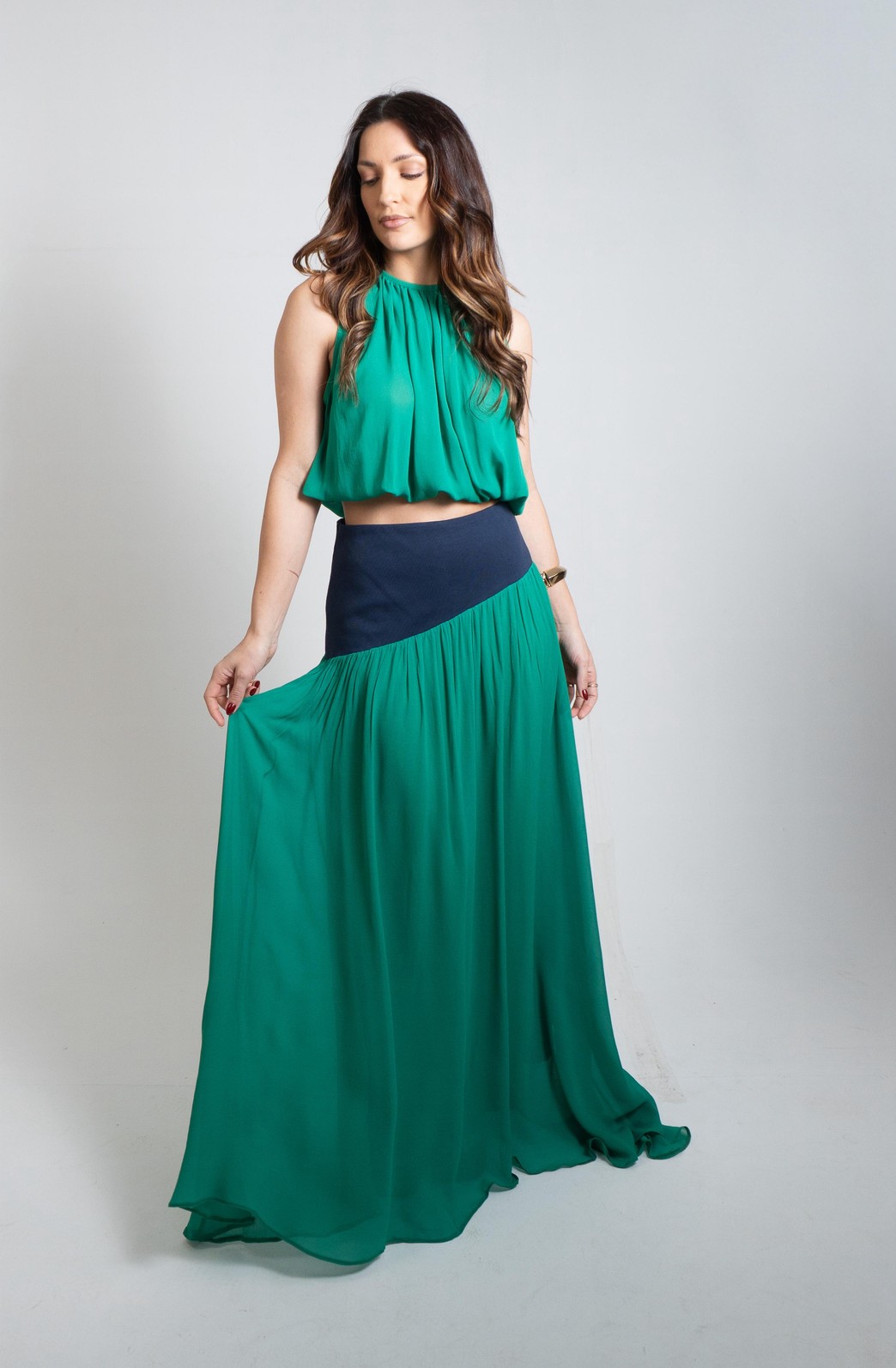 A saia super midi de cintura alta traz parte superior com elastano que acompanha a silhueta com conforto. O recorte assimétrico com franzidos marca a transição para o chiffon de viscose, criando um visual leve, fluido e cheio de movimento. Aposte!