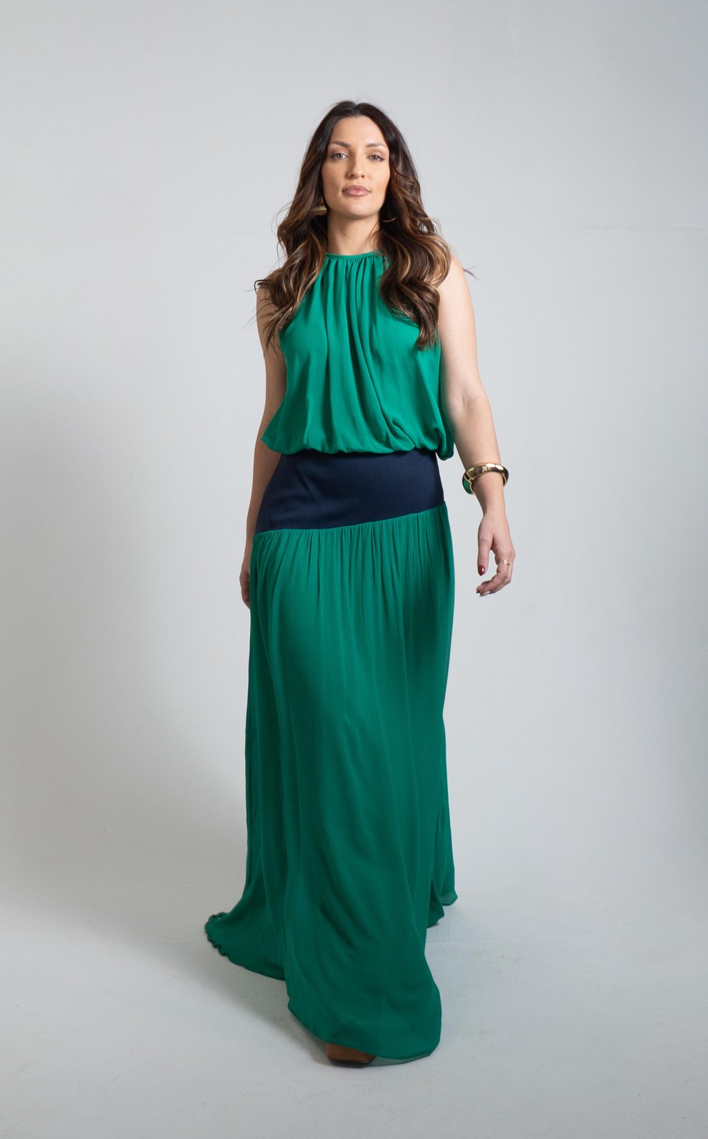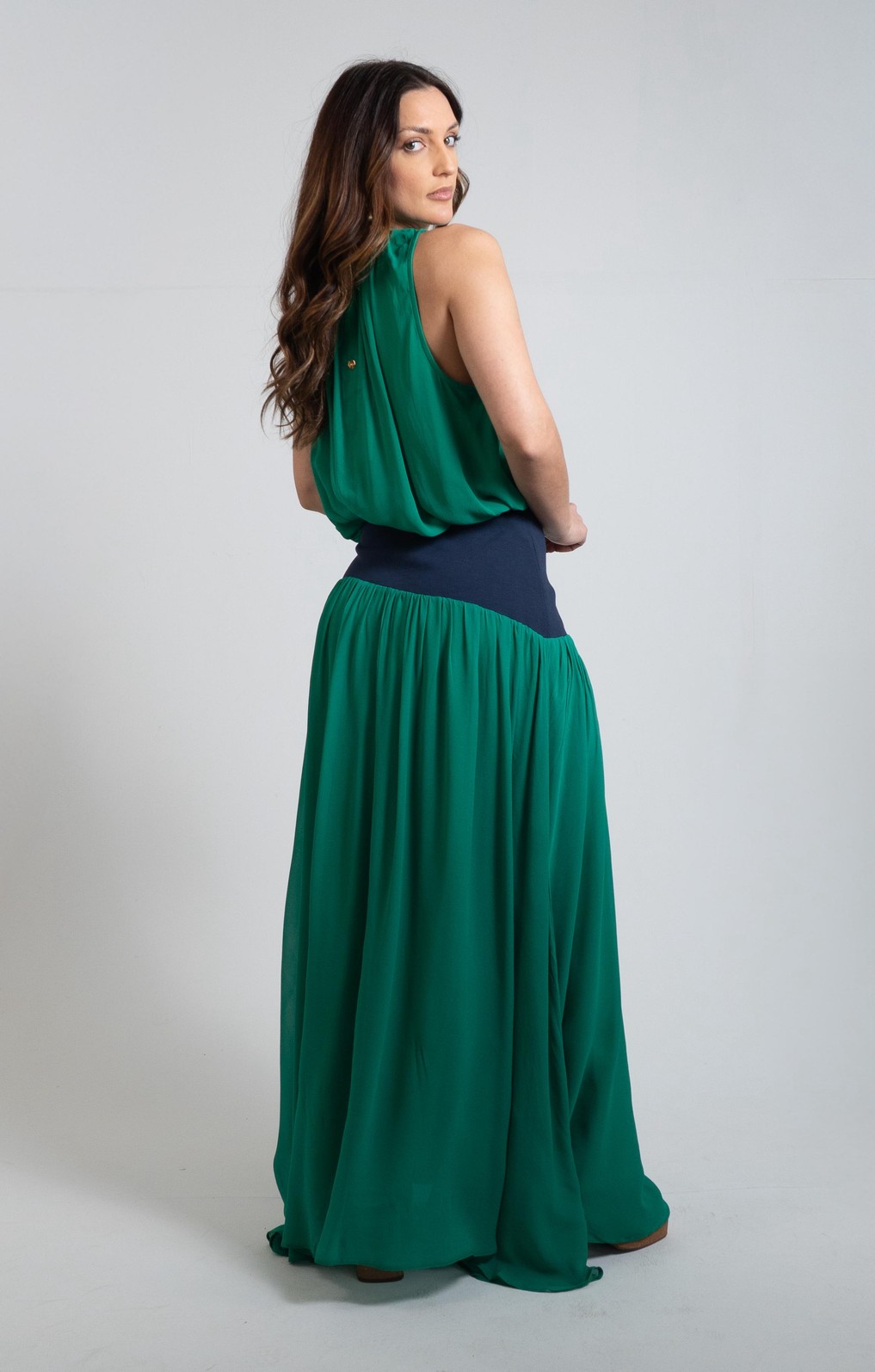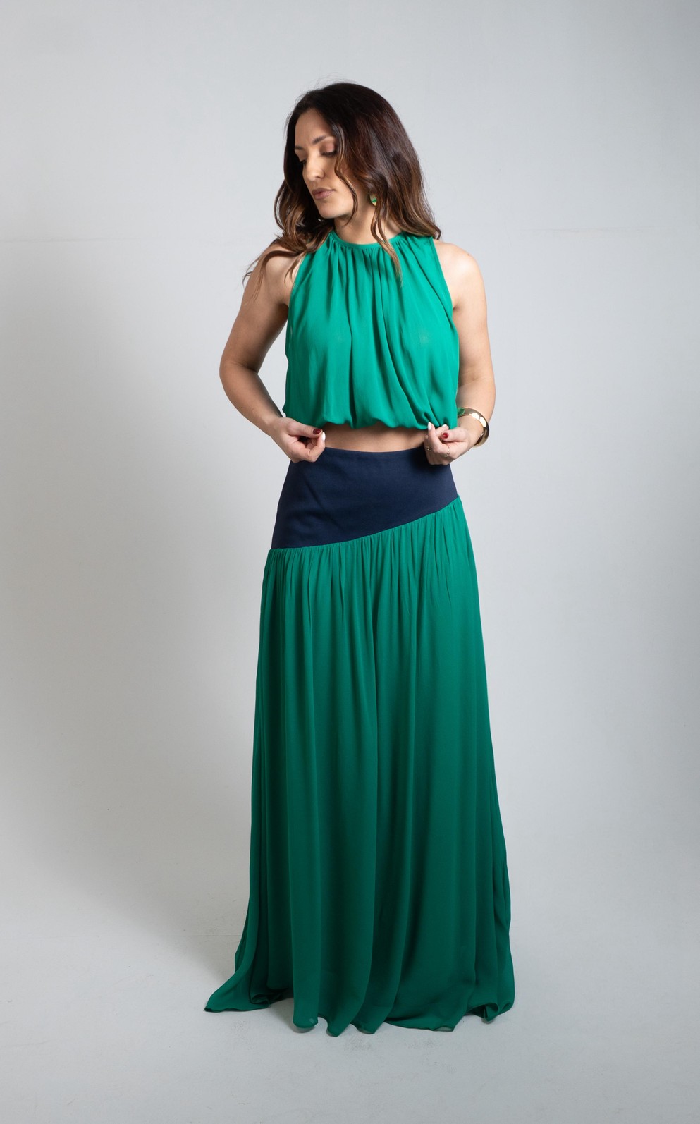 A saia super midi de cintura alta traz parte superior com elastano que acompanha a silhueta com conforto. O recorte assimétrico com franzidos marca a transição para o chiffon de viscose, criando um visual leve, fluido e cheio de movimento. Aposte!