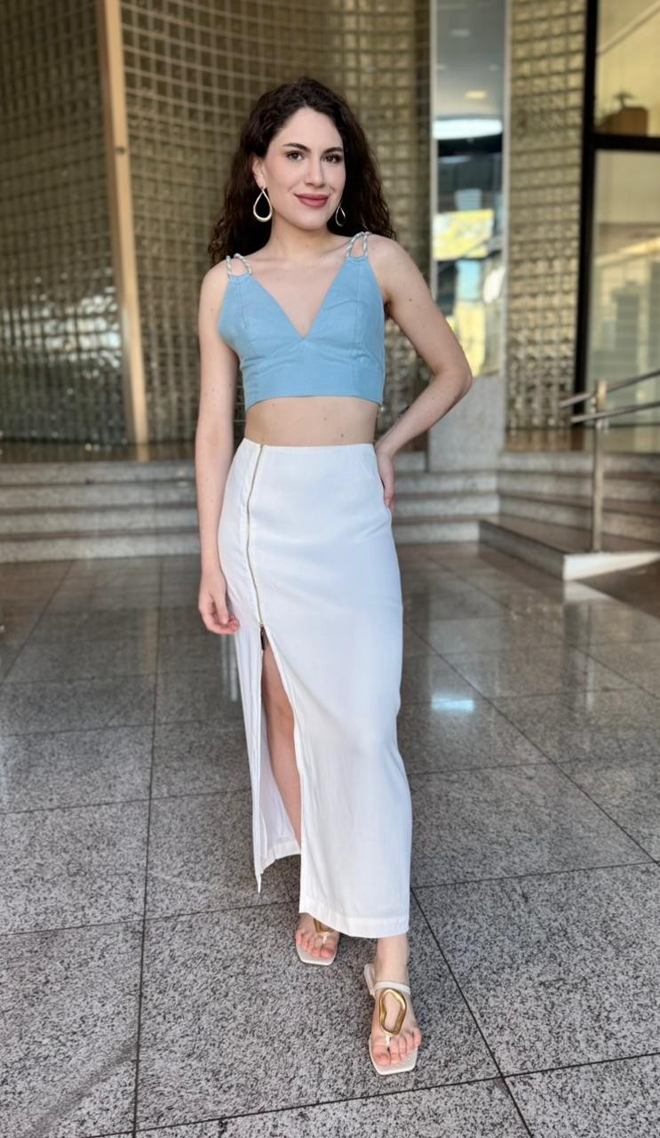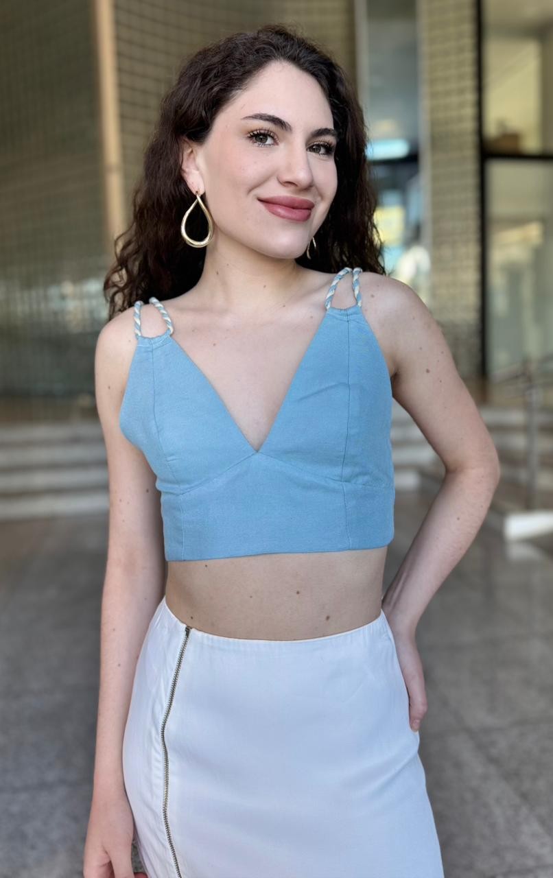 Confeccionado em tecido estruturado com leve elasticidade, o top oferece excelente caimento e conforto, ajustando-se ao corpo de forma precisa sem perder a leveza. O recorte do busto garante sustentação e desenho impecável, enquanto as alças trançadas adicionam textura e um charme artesanal ao design.