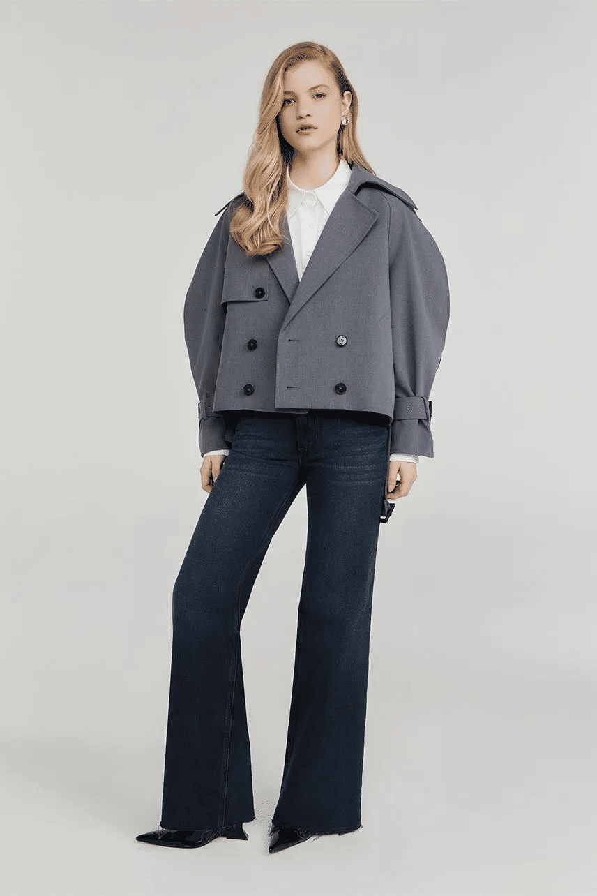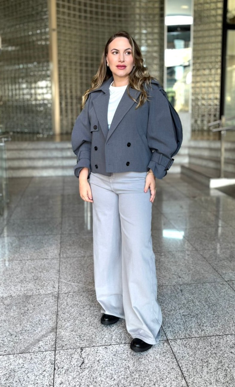 O casaco em alfaiataria apresenta uma leitura contemporânea da peça clássica, com modelagem ampla e estrutura marcada. Possui decote em V, fechamento frontal por botões e bolsos vivos, além de acabamento com barra invisível. O cinto permite acinturar o corpo e ajustar as mangas, enquanto o detalhe de martingale adiciona informação de moda ao design, resultando em uma peça sofisticada e versátil para composições modernas.