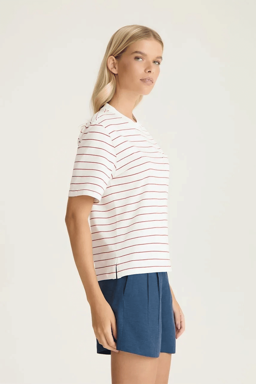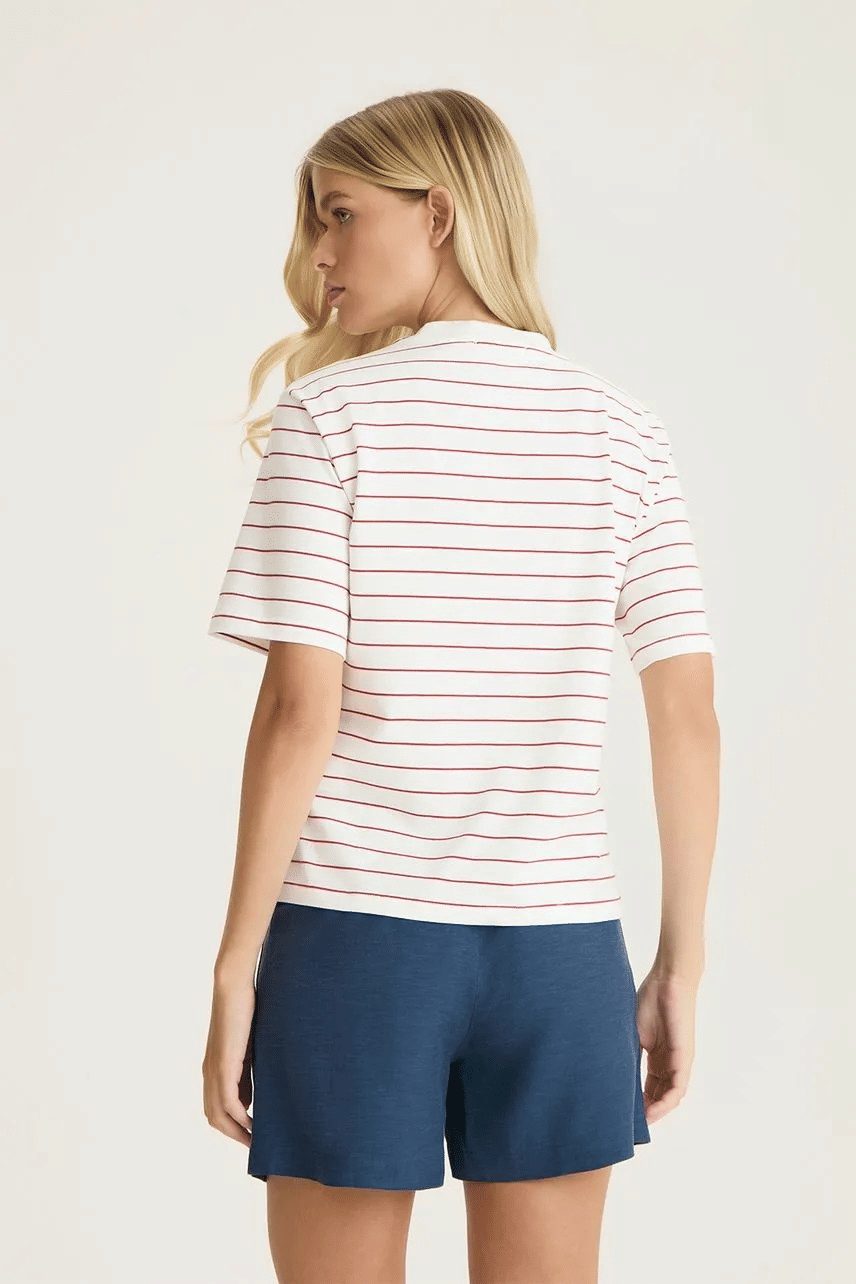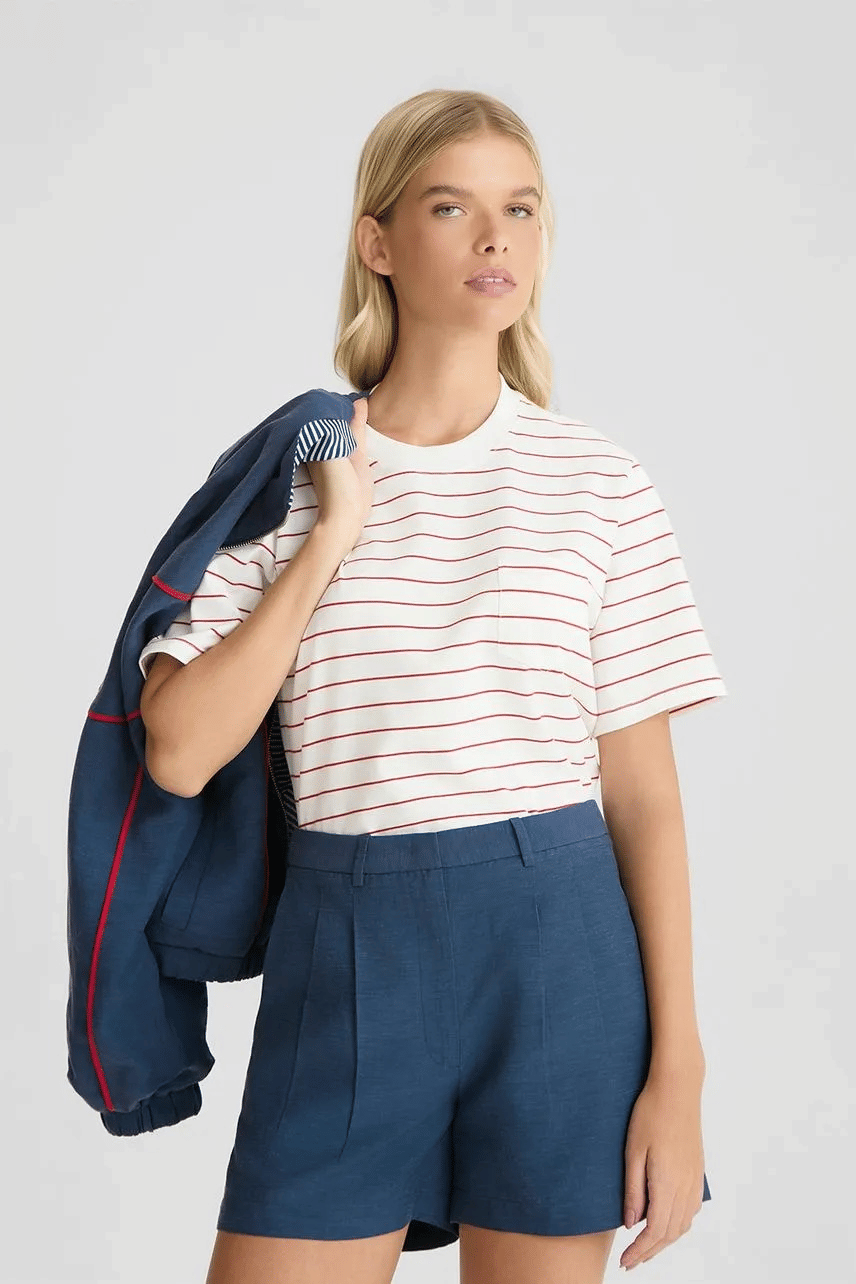 A t-shirt apresenta uma proposta casual e atemporal, confeccionada em malha com modelagem e comprimento regulares, garantindo conforto e caimento equilibrado. A estampa de listras adiciona informação de moda ao visual, enquanto a gola careca e as mangas curtas reforçam sua versatilidade. O bolso aplicado frontal complementa o design com um toque funcional, tornando a peça ideal para composições do dia a dia.