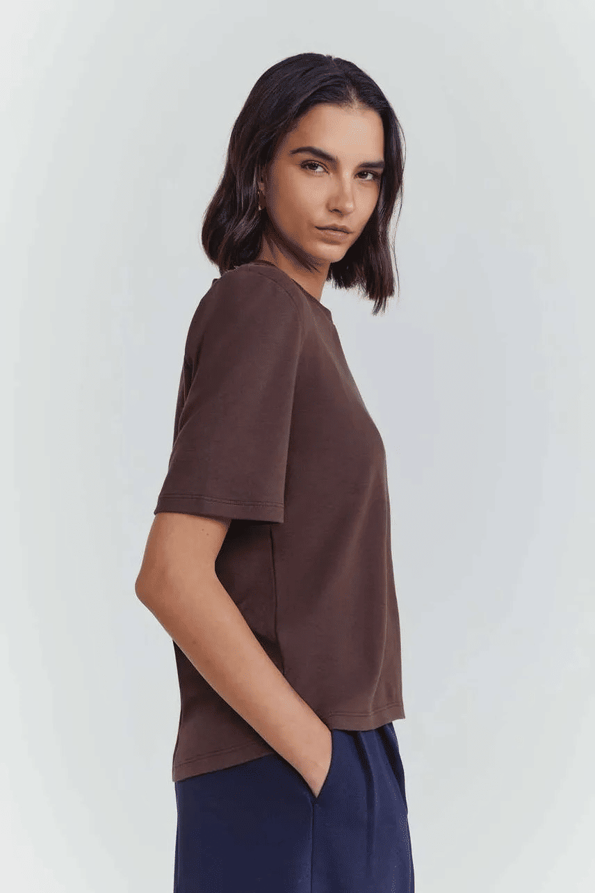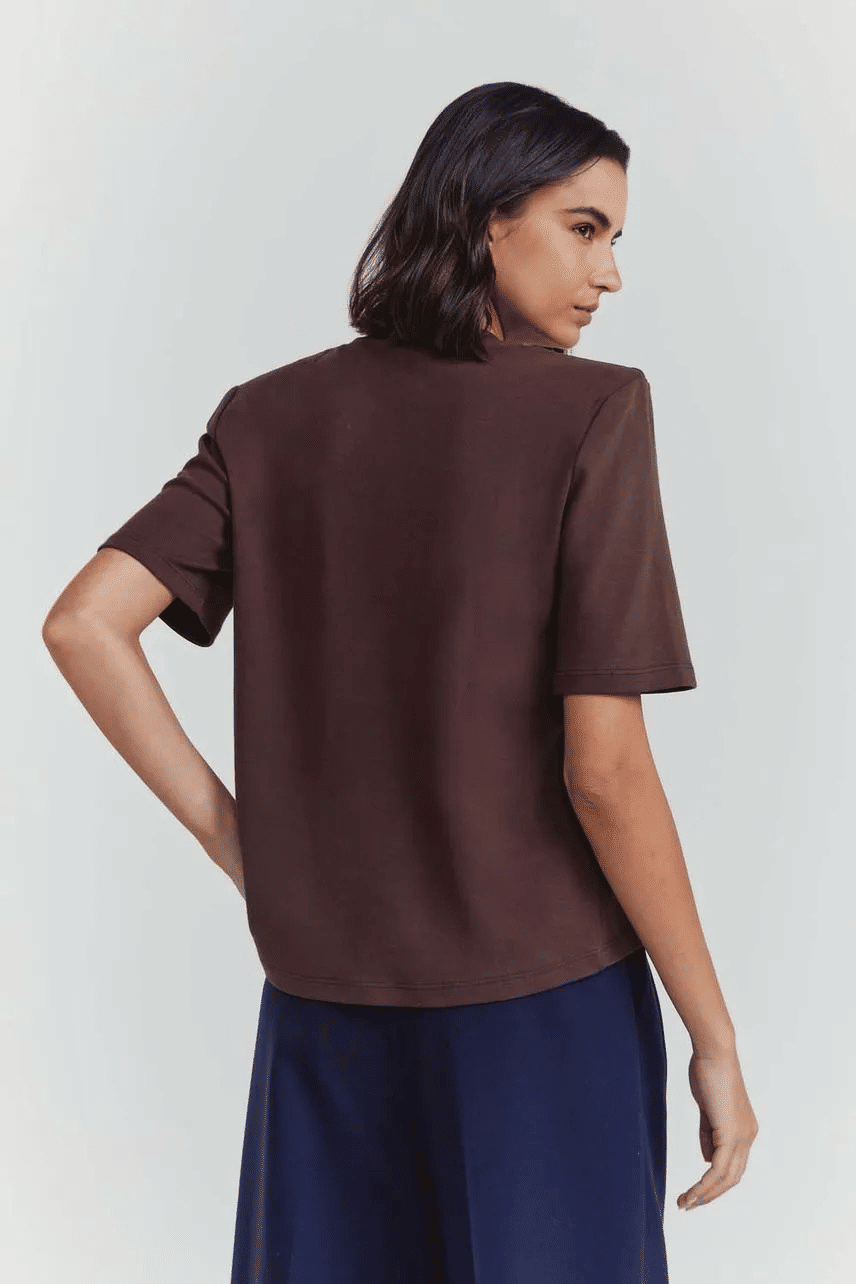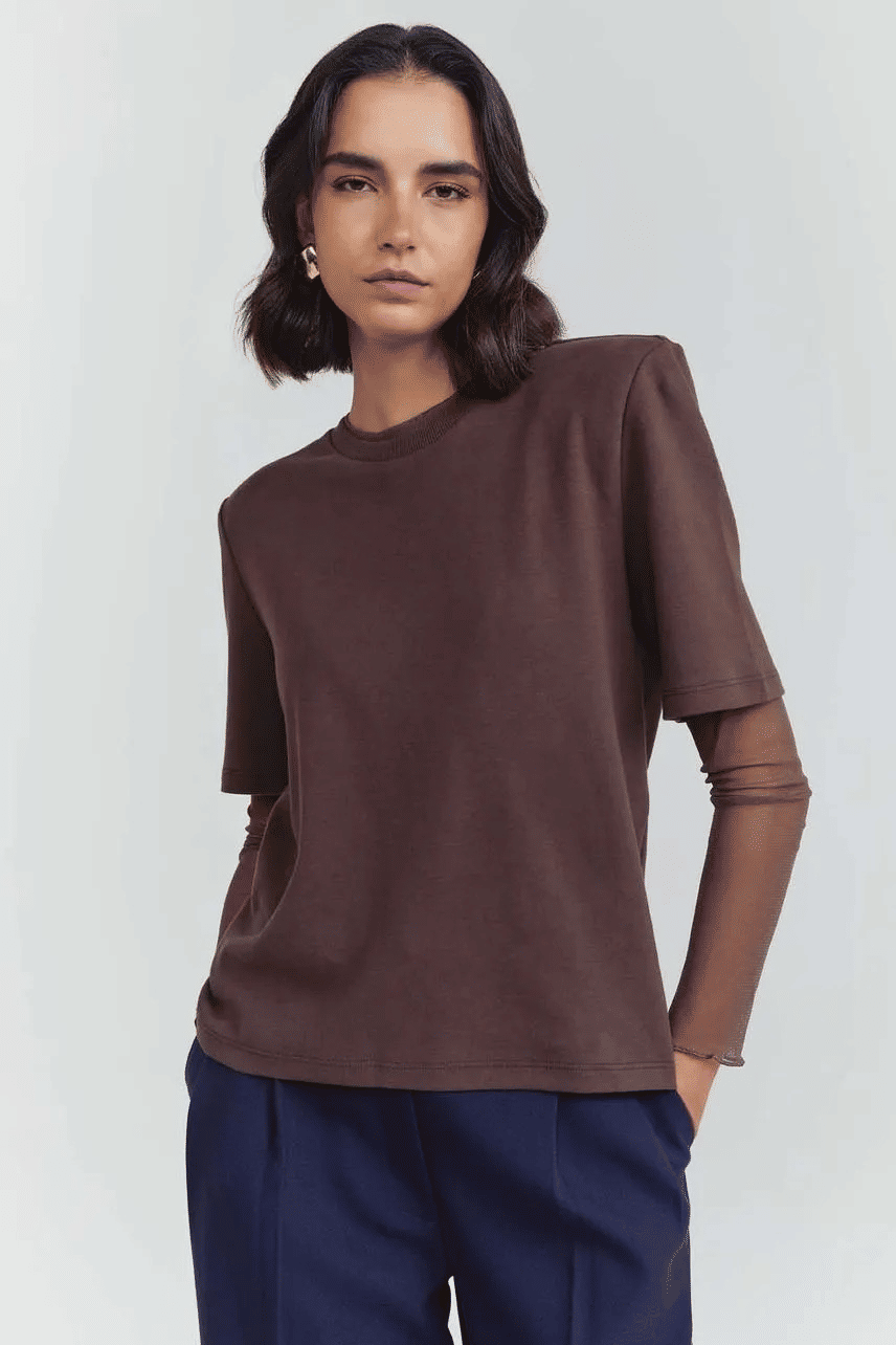 Camiseta confeccionada em malha com modelagem regular e comprimento regular. Possui manga curta, gola careca, ombreira destacávies e barra reta. Uma peça essencial e versátil, ideal para composições básicas com toque contemporâneo.