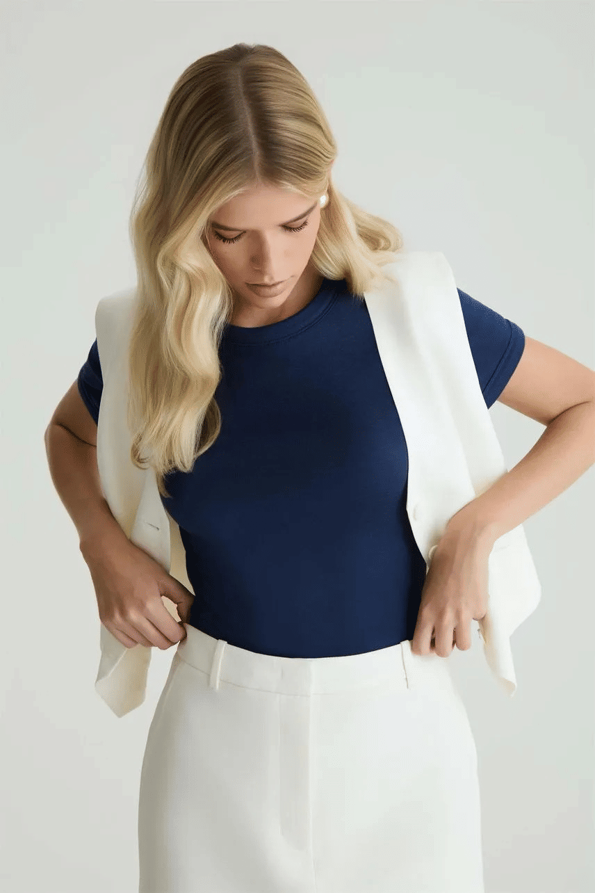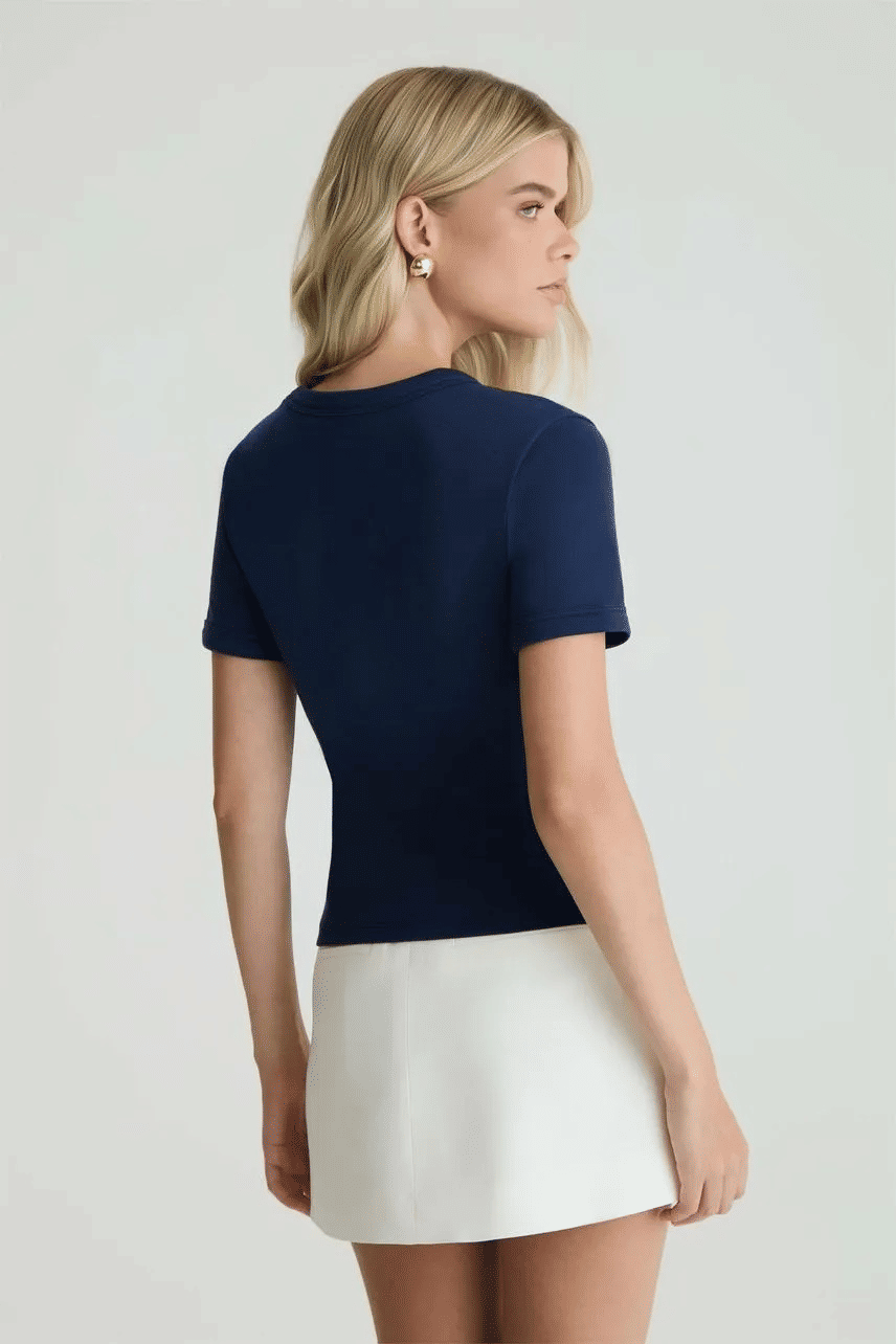 Proporciona caimento ajustado e confortável, com visual clean e versátil. Uma peça essencial e atemporal, ideal para composições do dia a dia, funcionando como base perfeita para looks casuais ou produções mais elaboradas.