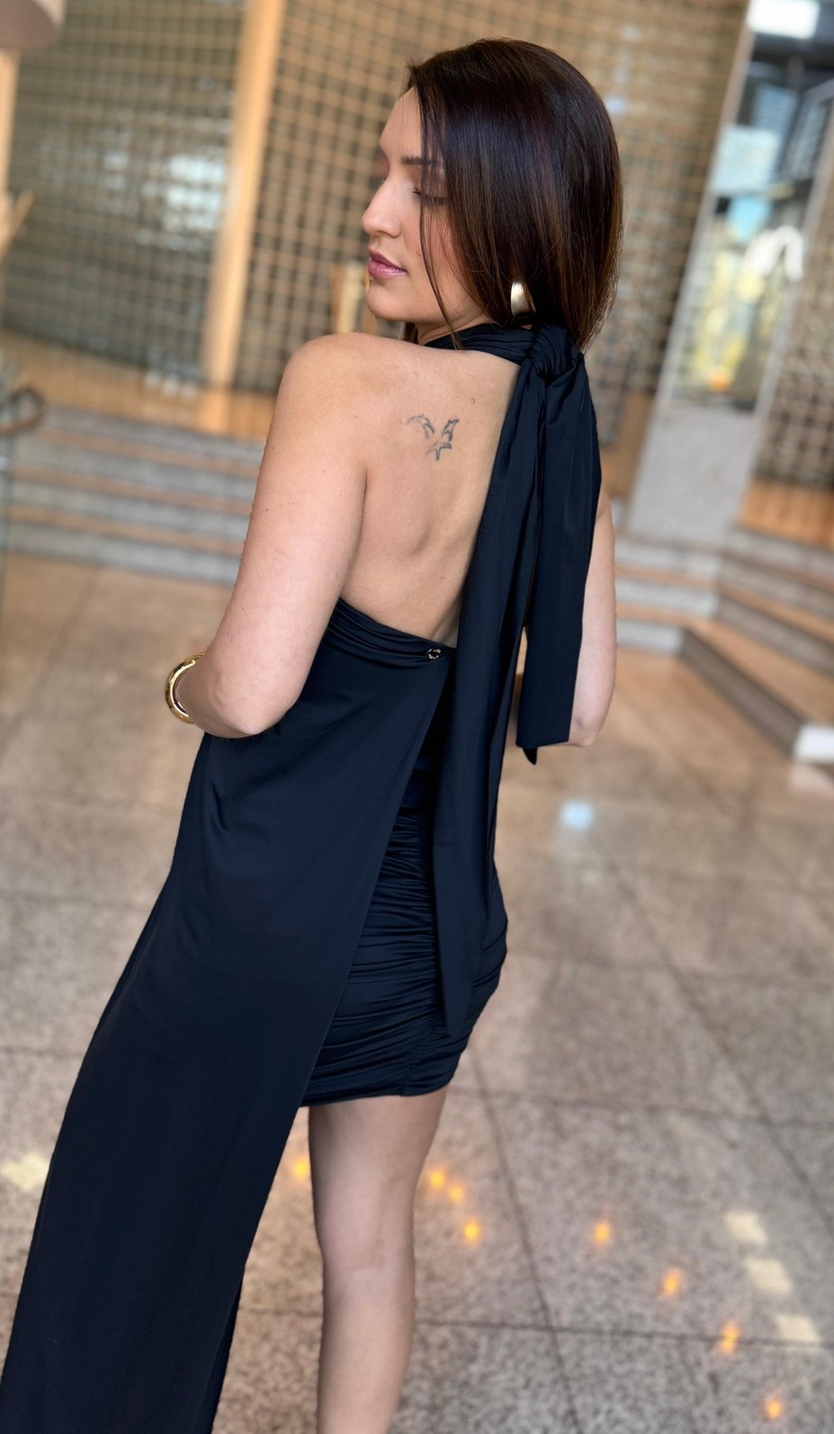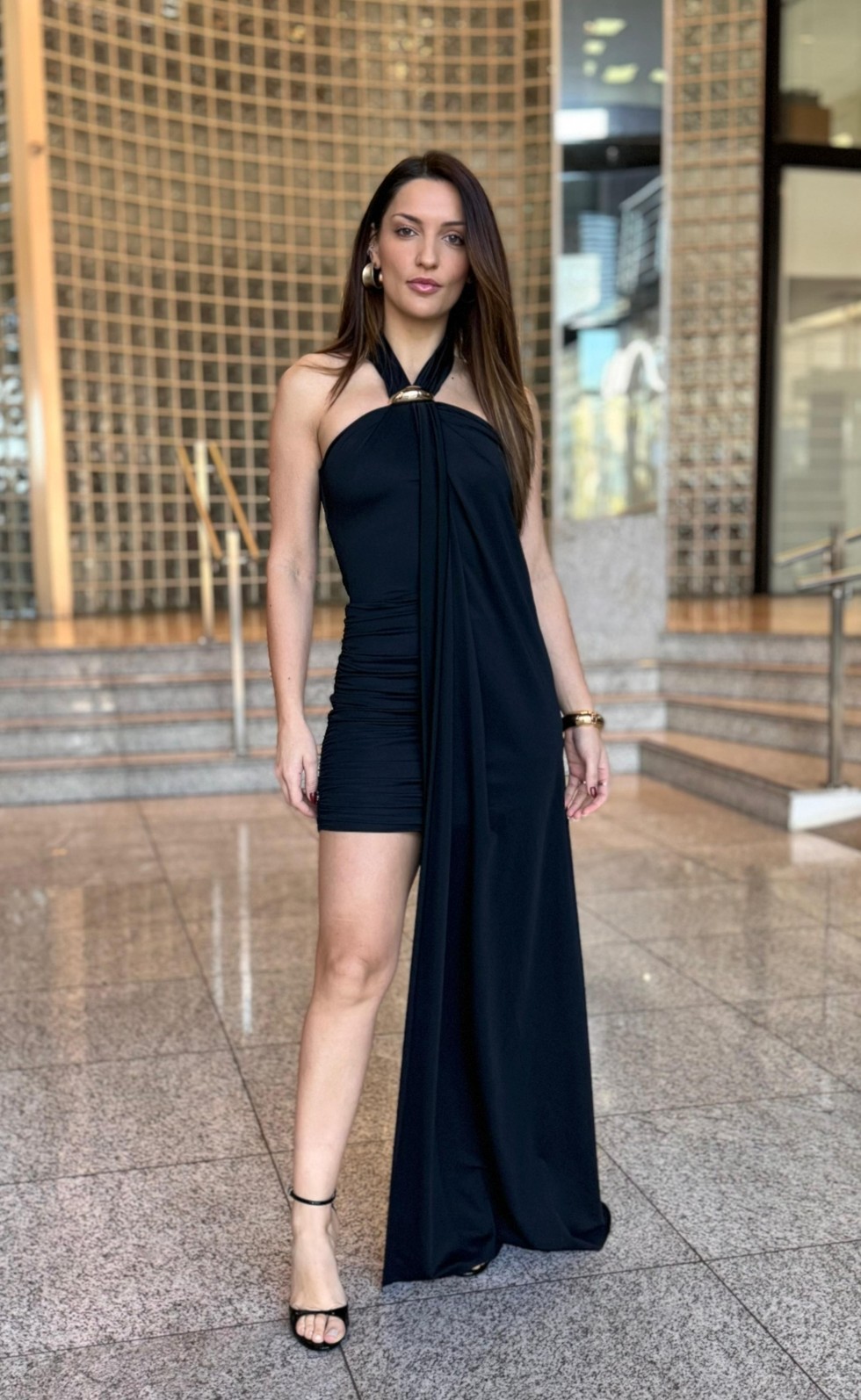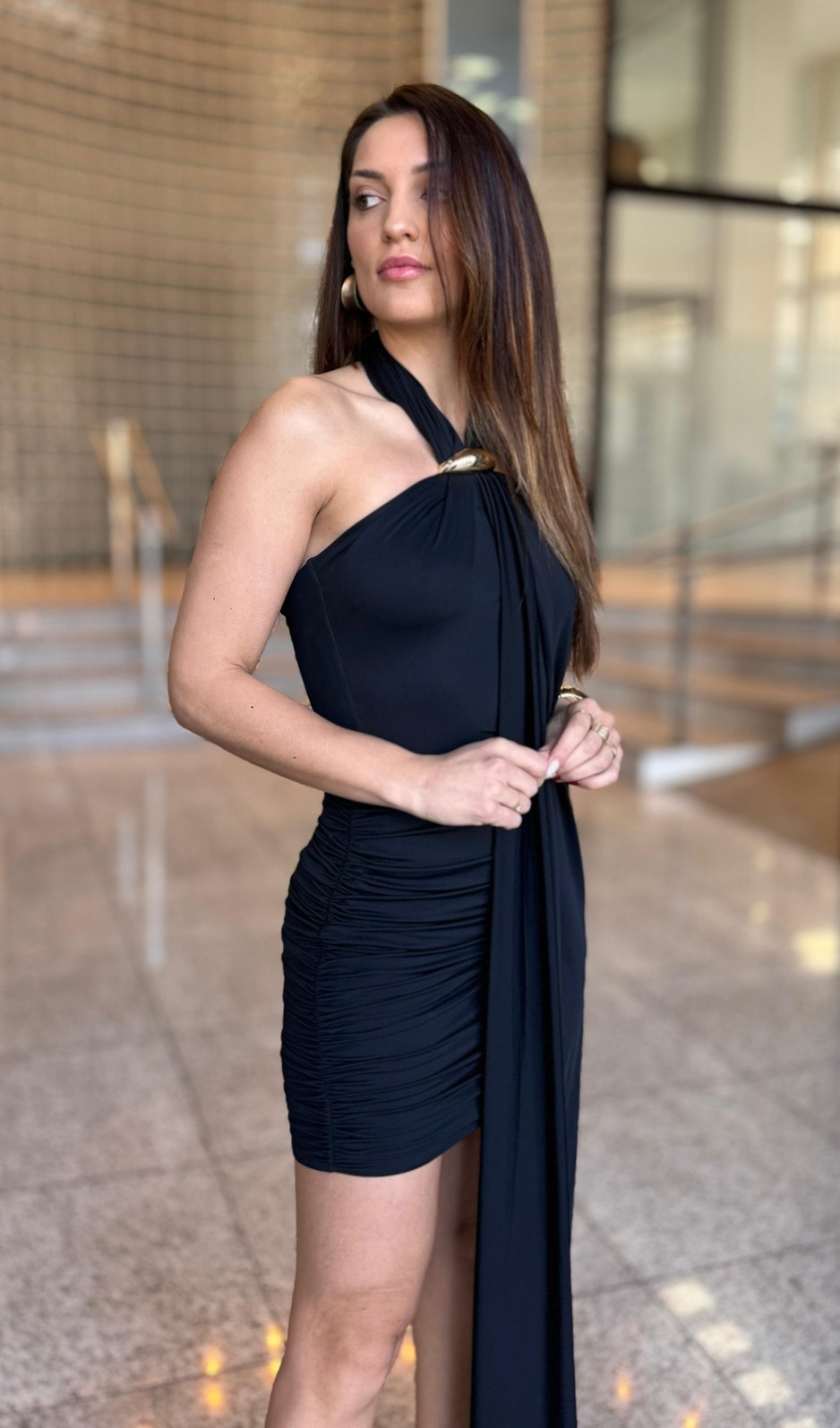 Produzido em malha leve, o vestido curto apresenta frente única com amarração nas costas e aviamento metálico. Seu shape justo exibe drapeados estratégicos e uma sobreposição lateral longa que atualiza a silhueta. Contemporâneo e feito para impressionar!