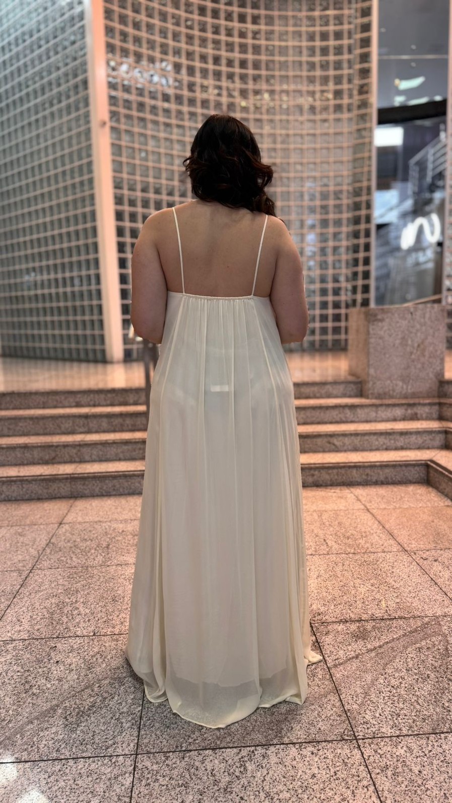 Design: Modelagem longa e solta, alças finas e detalhe trançado no decote