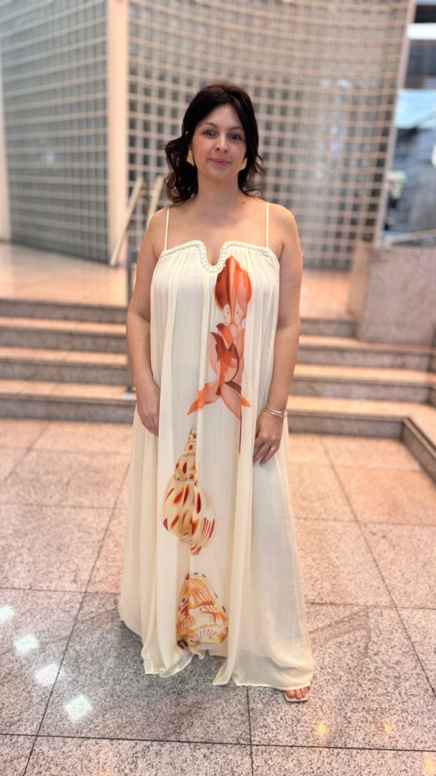 Confeccionado em tecido leve e de caimento suave, o vestido apresenta comprimento longo e alças finas, que realçam os ombros e o colo de forma delicada. O detalhe trançado no busto adiciona um toque artesanal e exclusivo à peça, equilibrando modernidade e romantismo. A estampa inspirada em elementos naturais transmite frescor e harmonia, perfeita para ocasiões diurnas ou eventos ao ar livre.