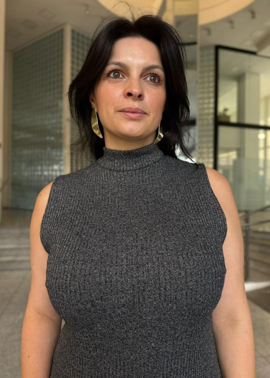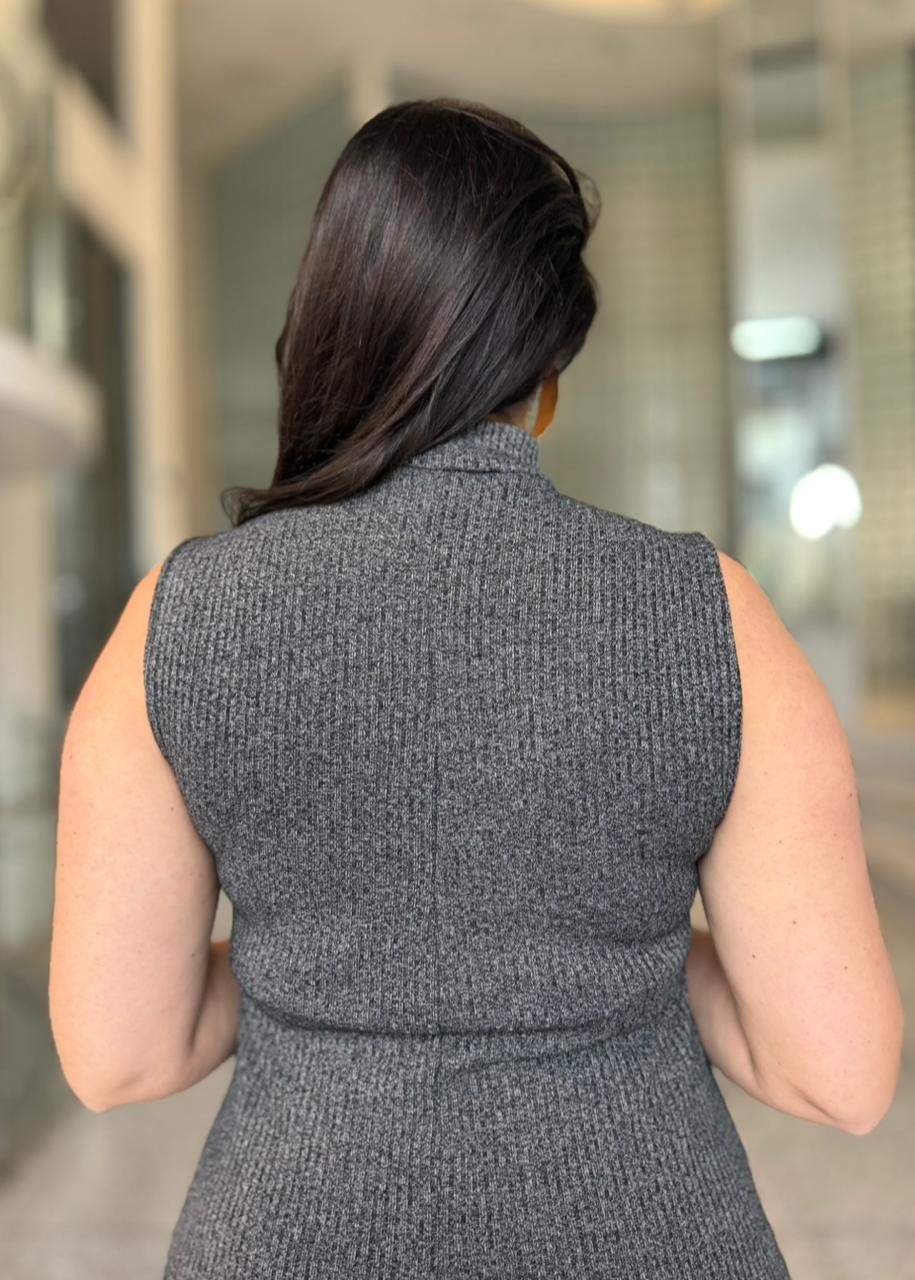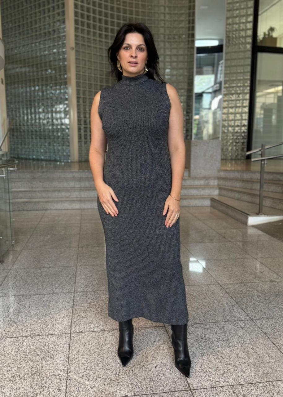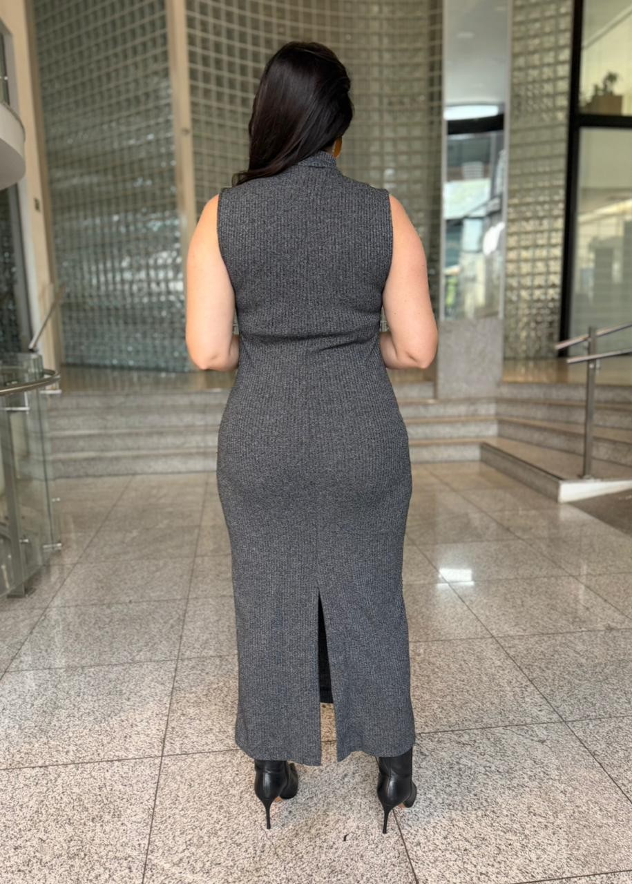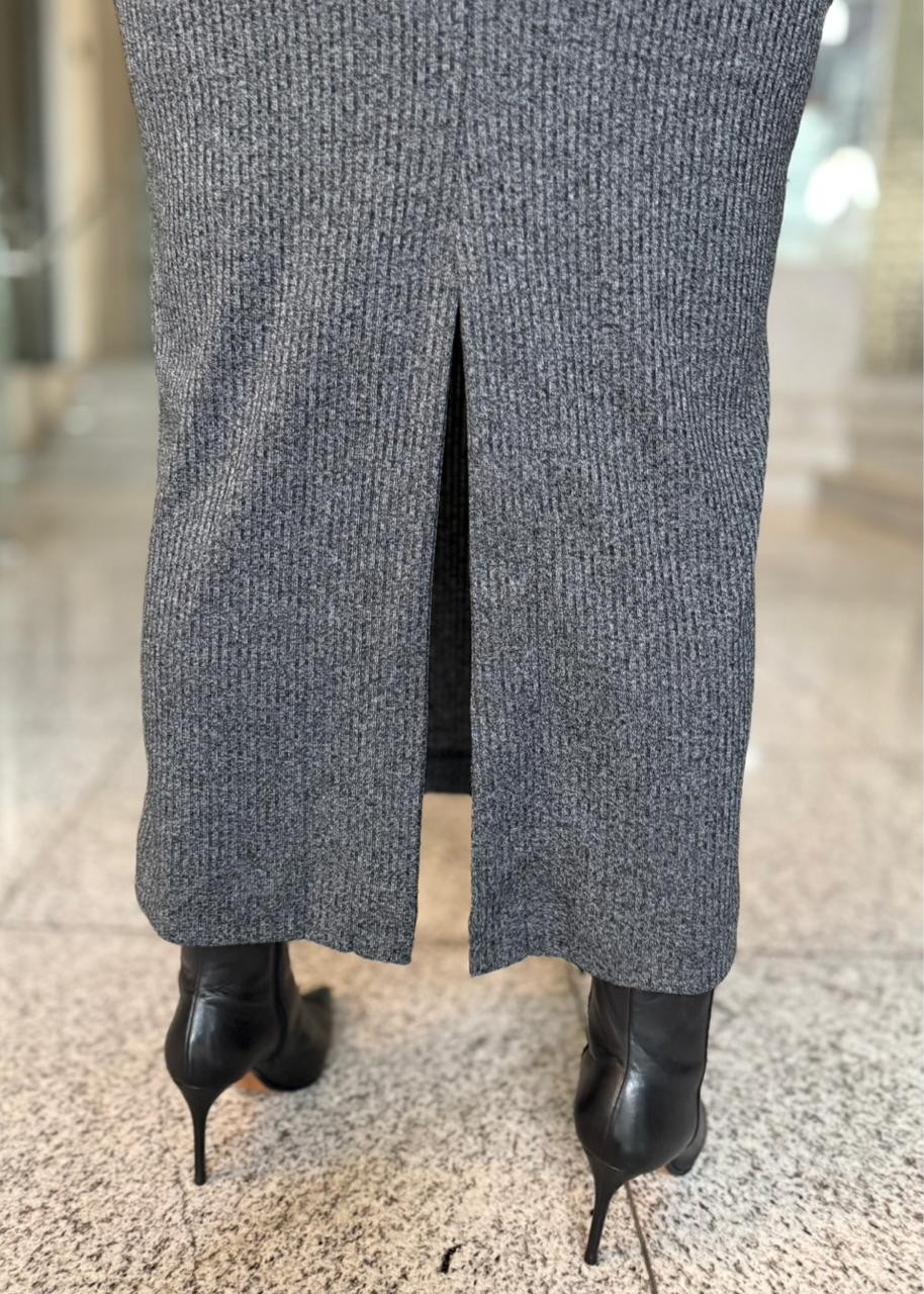 Com modelagem ajustada ao corpo, comprimento midi alongado e malha confortável com textura rica, ele valoriza a silhueta sem abrir mão do conforto. A fenda posterior traz mobilidade e um detalhe sutil de sensualidade, enquanto o tom mescla reforça a proposta urbana e atemporal.